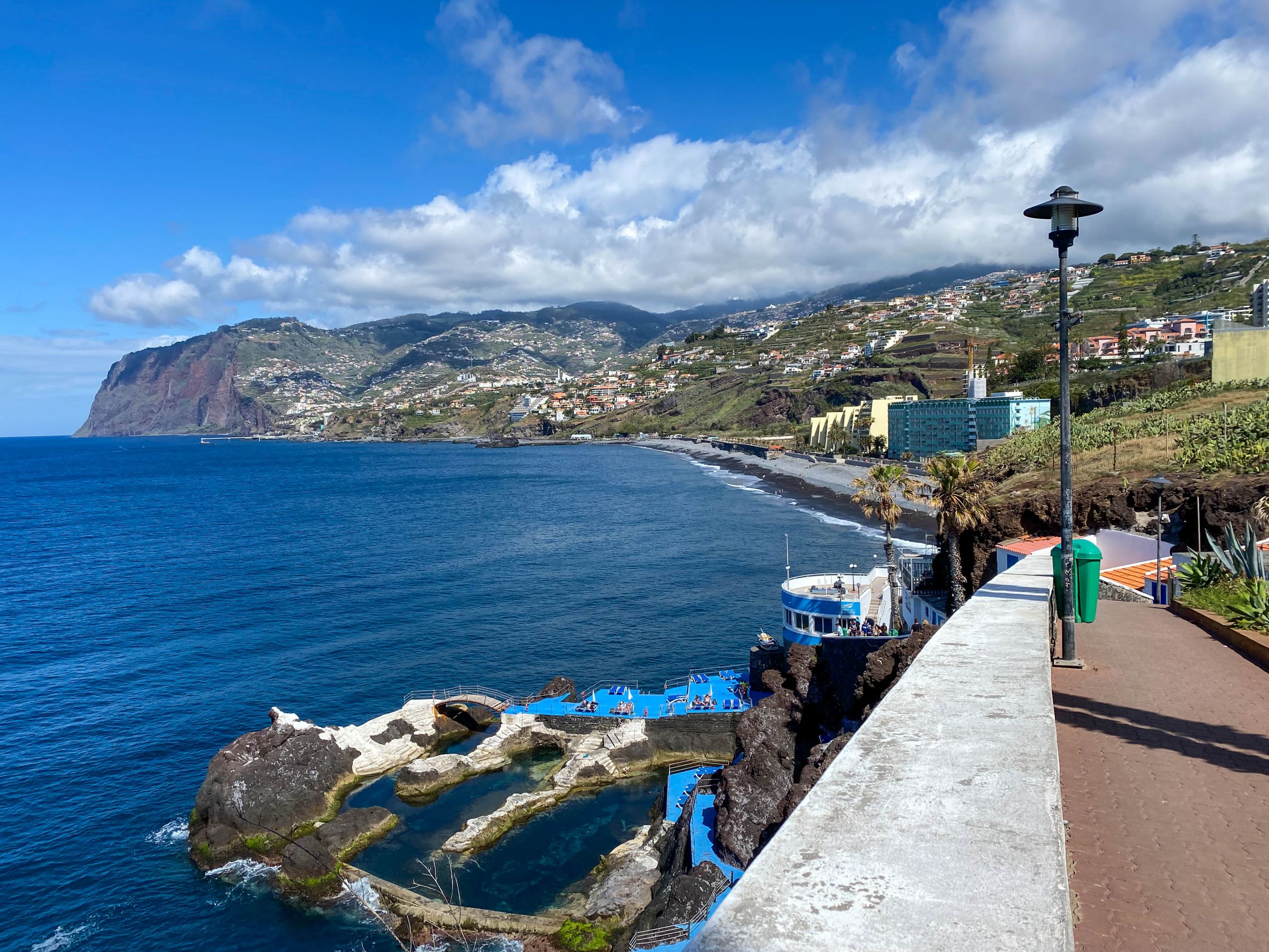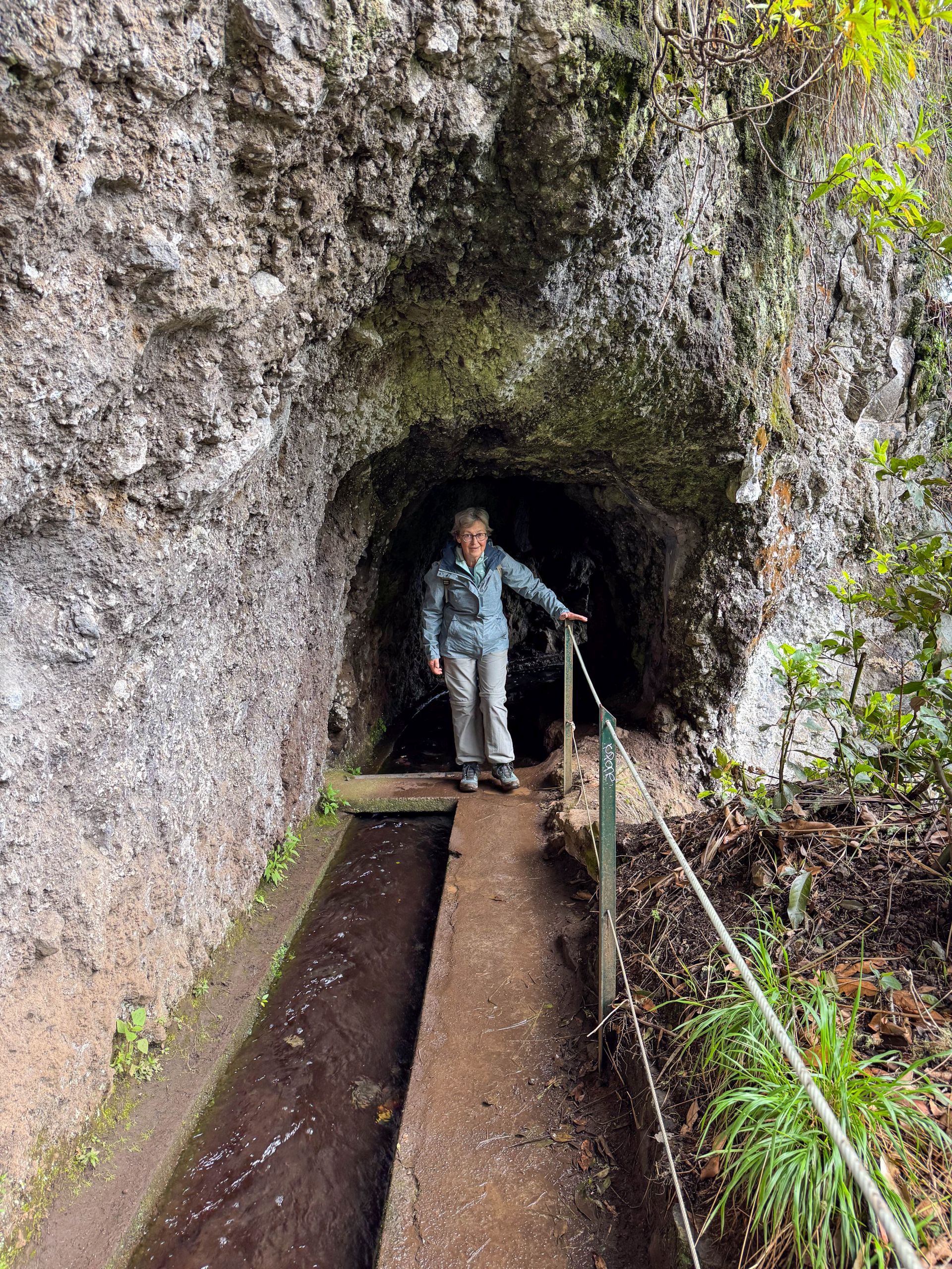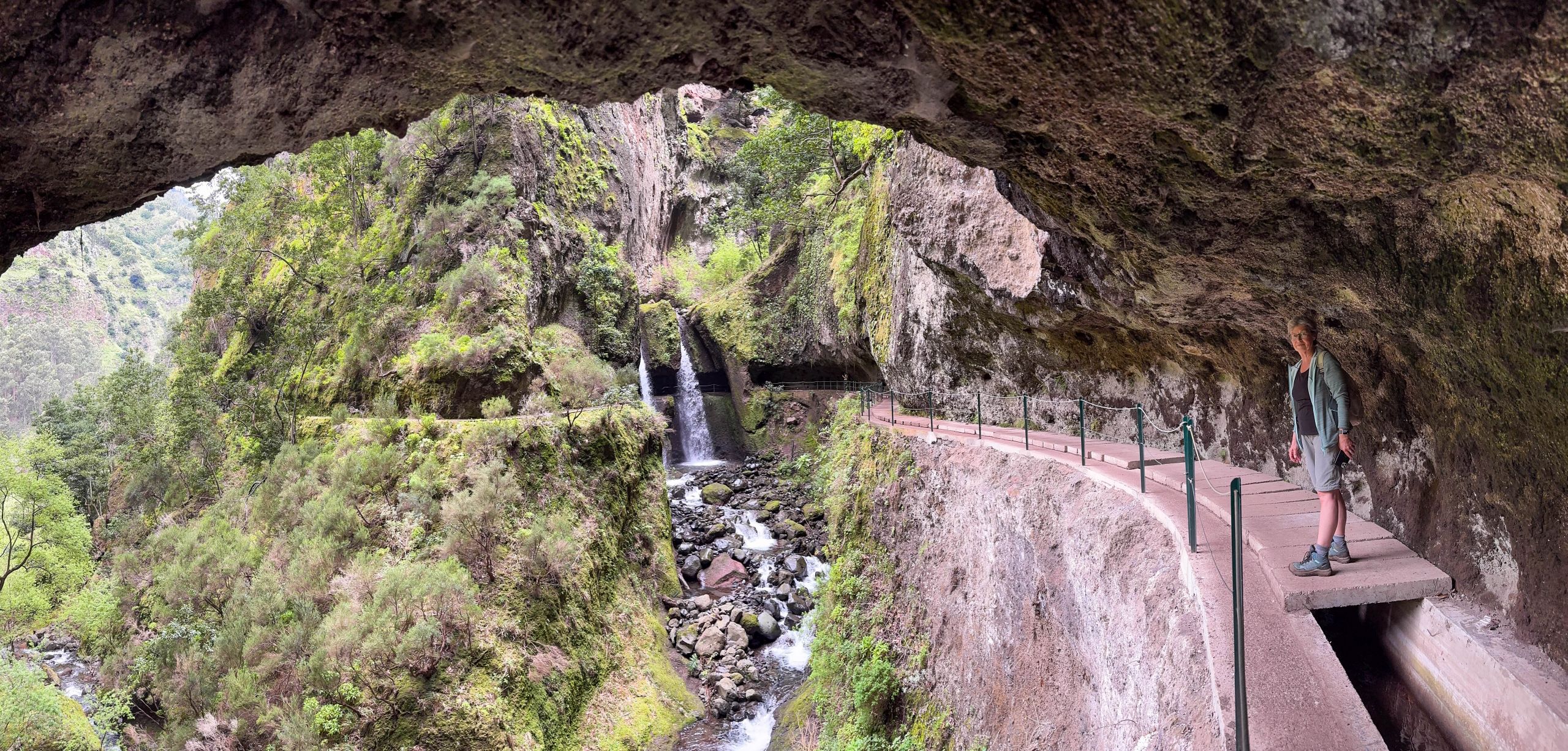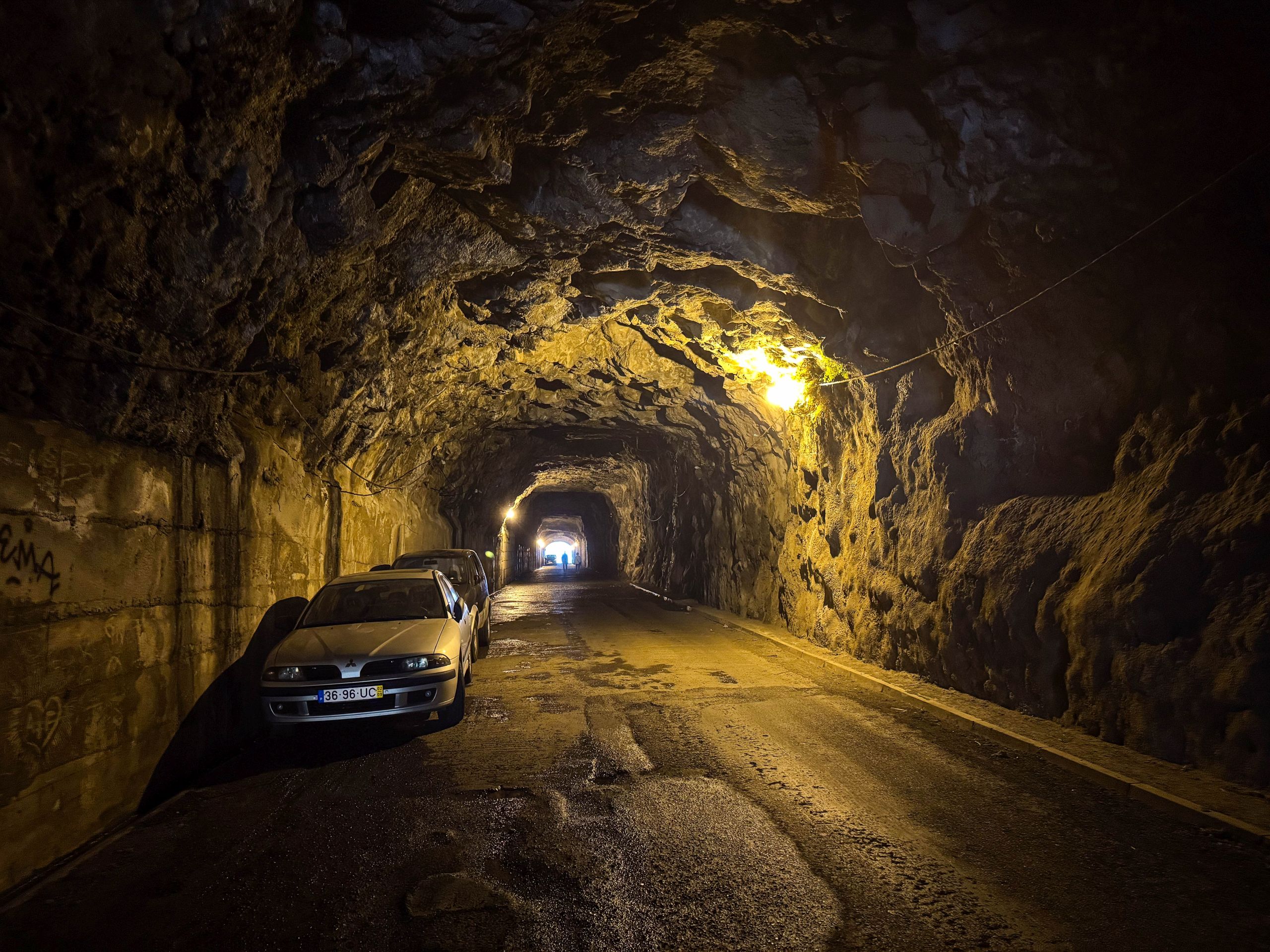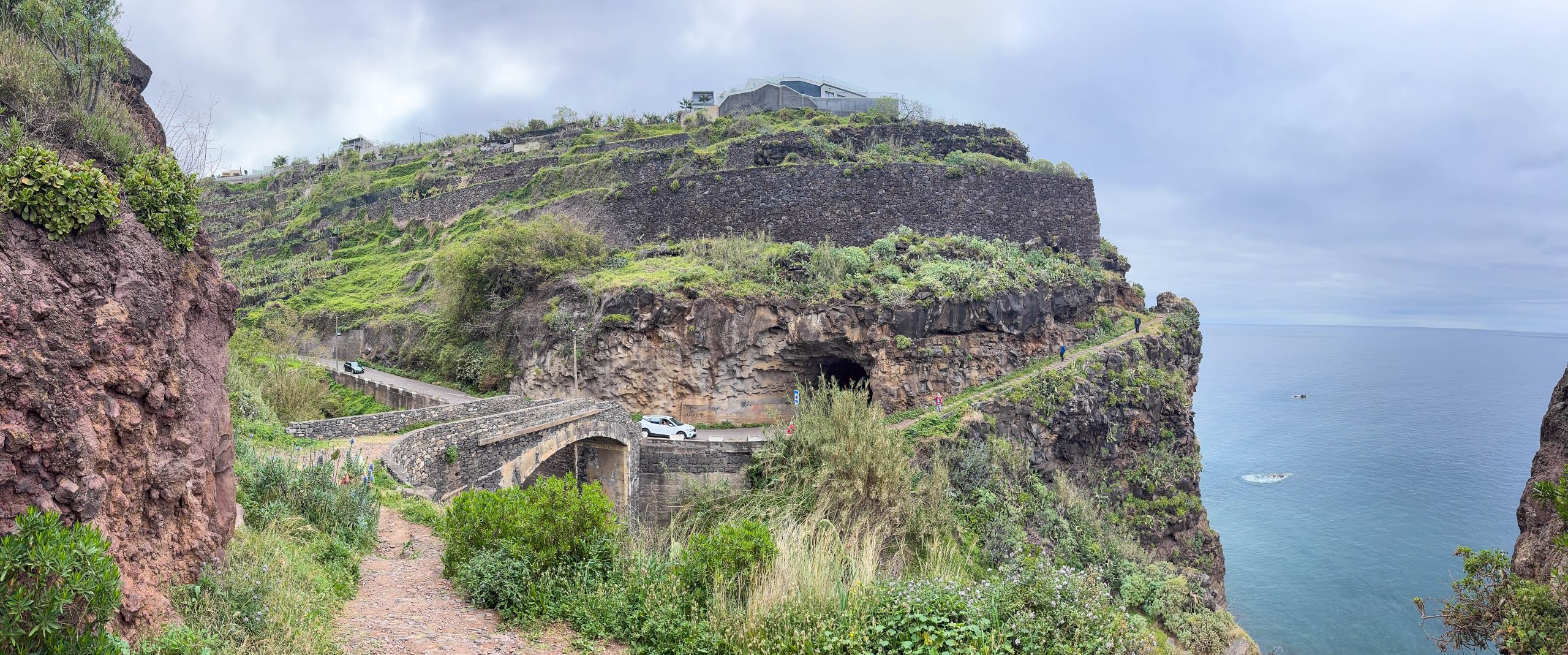 Nach einer vollkommen ruhigen Nacht im breiten, bequemen Bett mit Einzeldecken 😃 machen wir uns nach dem Frühstück zu Fuß auf den Weg nach Funchal. Da der erste Teil des Promenadenweges wegen Bauarbeiten geschlossen ist, machen wir einen Umweg bis zum nächstmöglichen Zugang hinter dem Orcahotel. Von dort spaziert man auf einem breiten Weg bis Funchal. Dabei geht es auch einmal durch einen beleuchteten Tunnel, Doca do Cavacas, in der Mitte mit Blick auf eine Grotte.