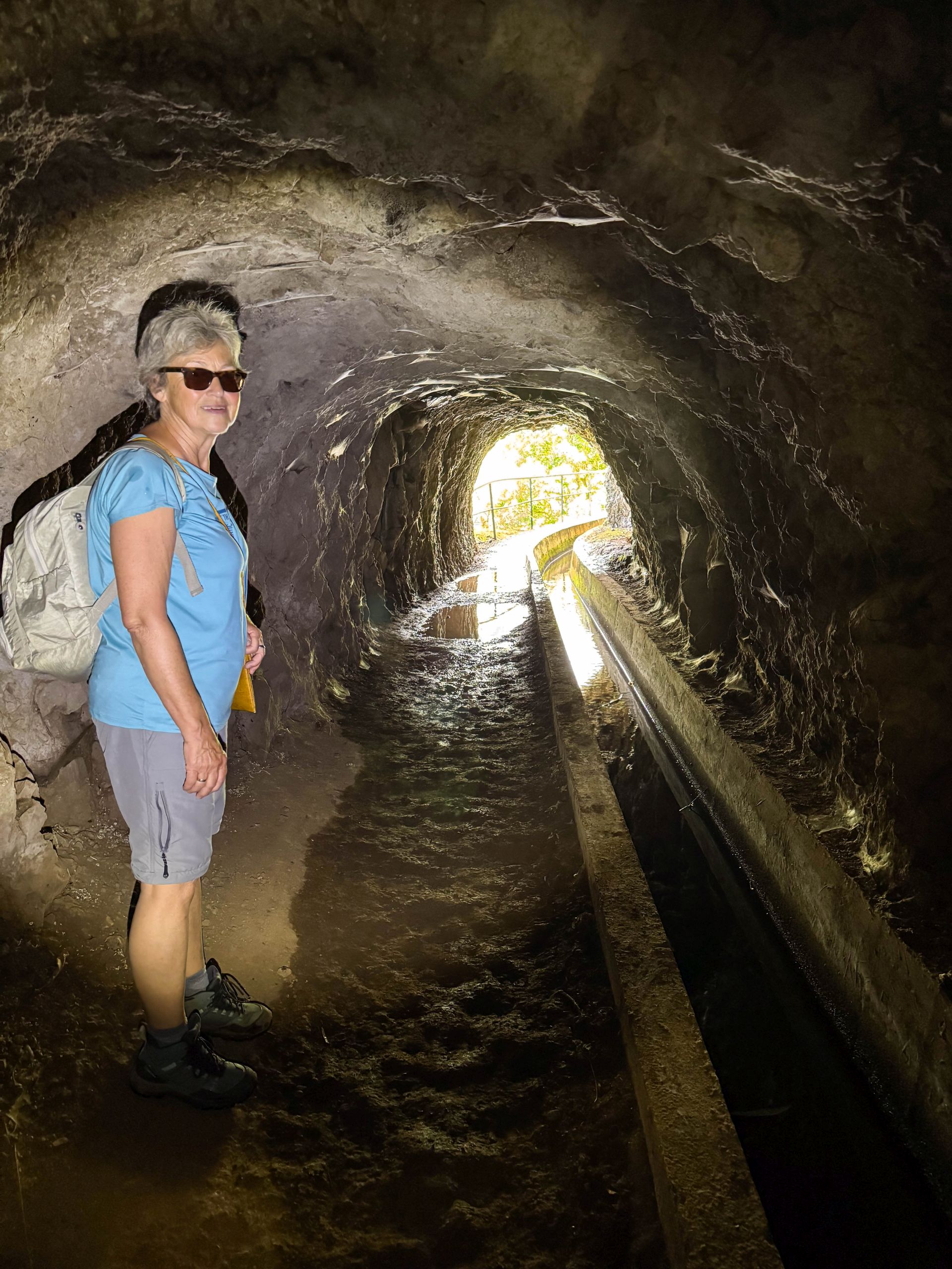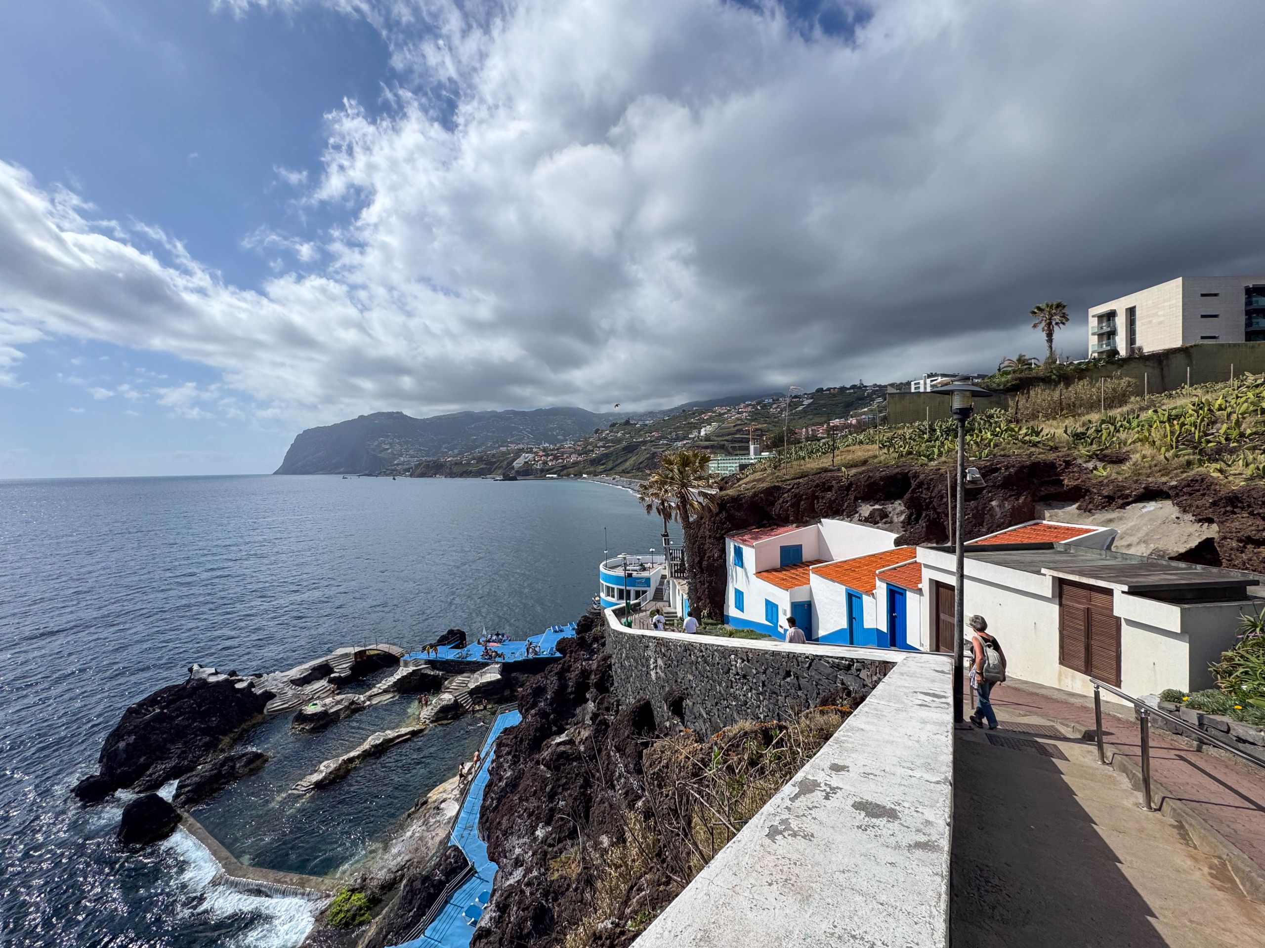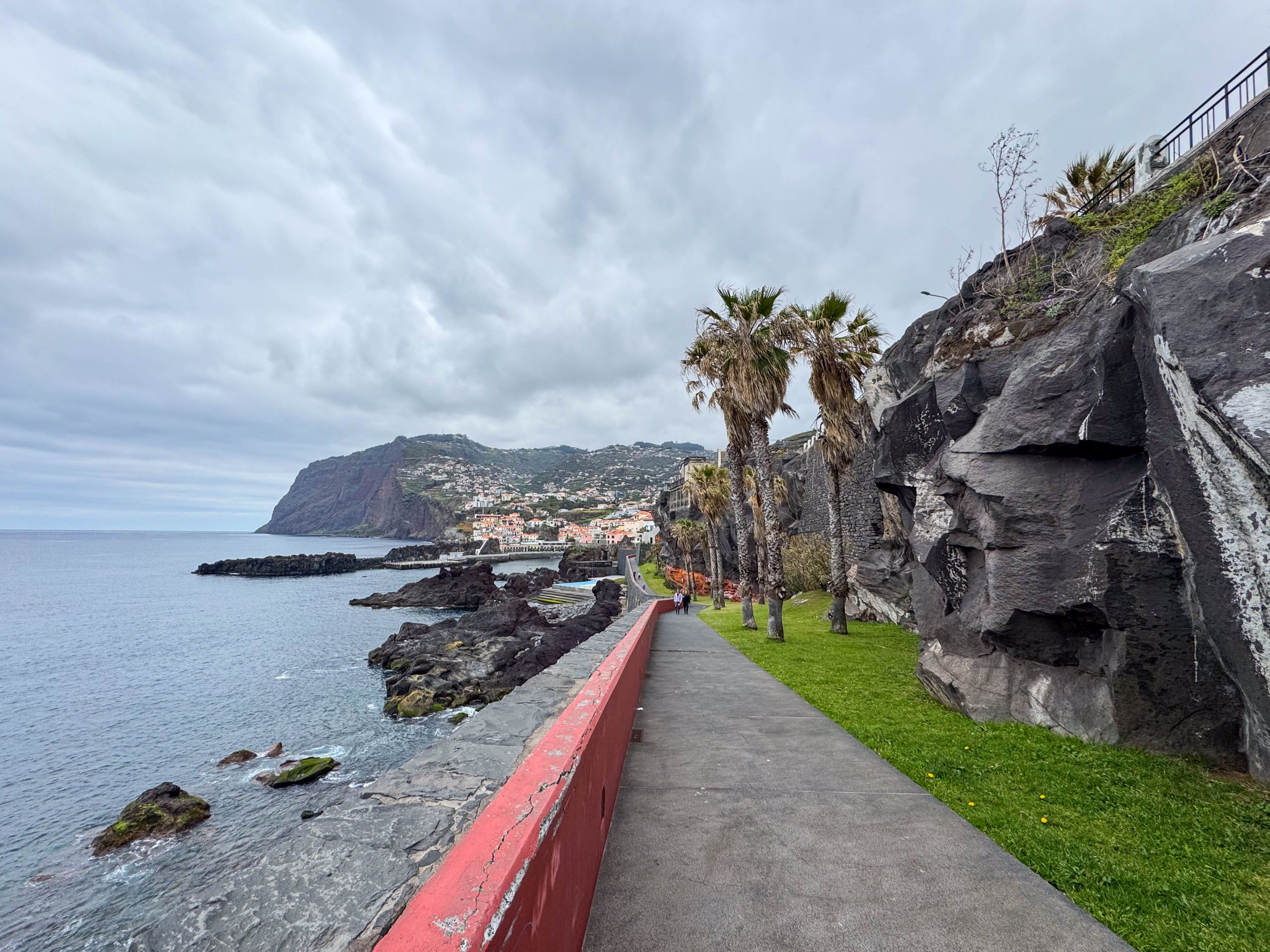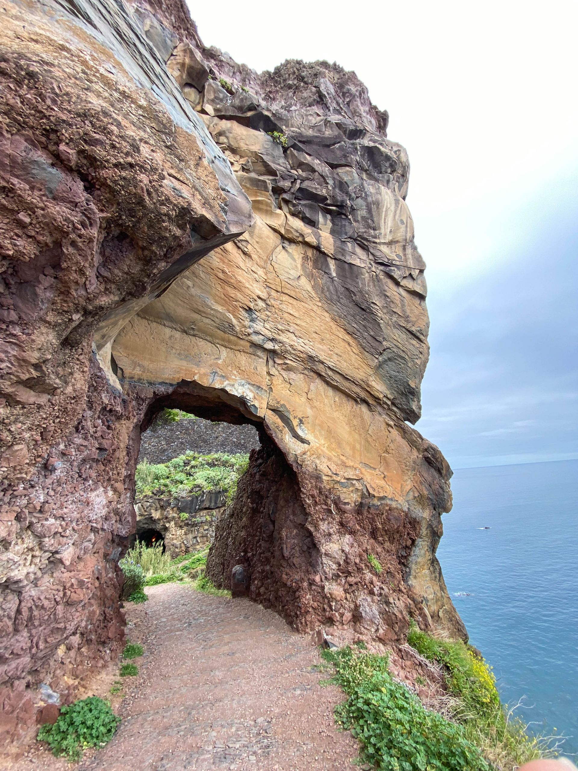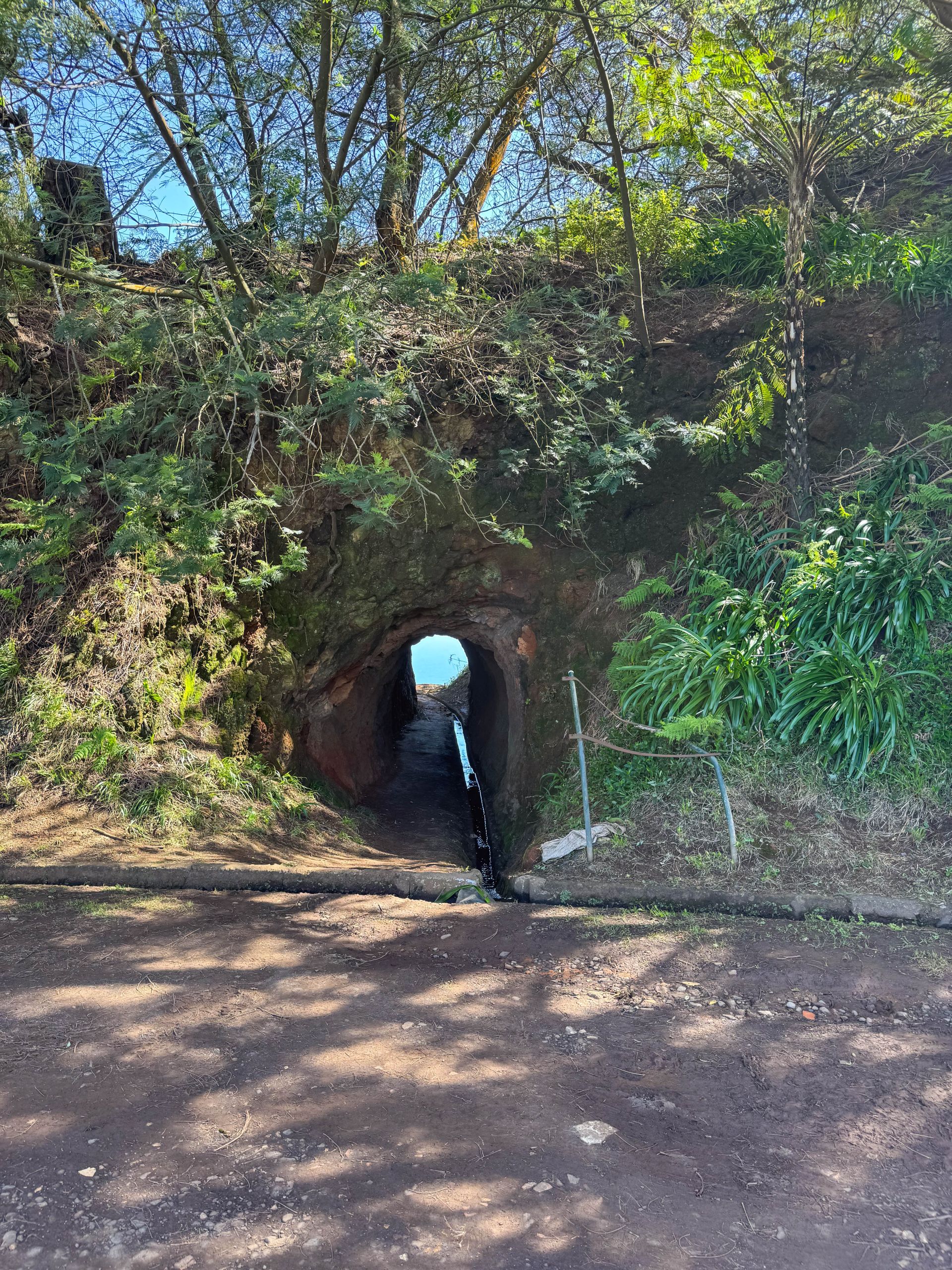 Nach einer vollkommen ruhigen Nacht im breiten, bequemen Bett mit Einzeldecken 😃 machen wir uns nach dem Frühstück zu Fuß auf den Weg nach Funchal. Da der erste Teil des Promenadenweges wegen Bauarbeiten geschlossen ist, machen wir einen Umweg bis zum nächstmöglichen Zugang hinter dem Orcahotel. Von dort spaziert man auf einem breiten Weg bis Funchal. Dabei geht es auch einmal durch einen beleuchteten Tunnel, Doca do Cavacas, in der Mitte mit Blick auf eine Grotte.