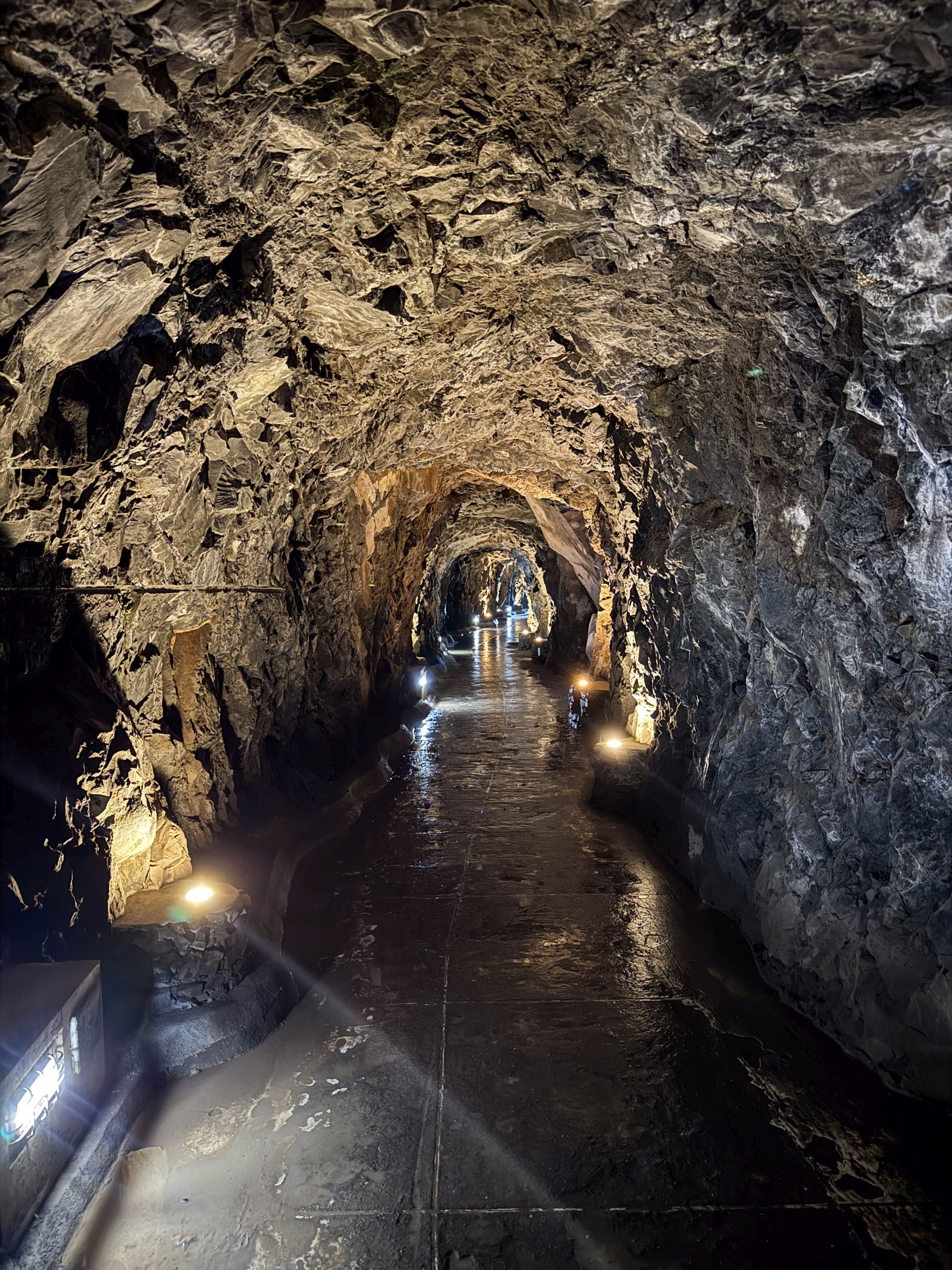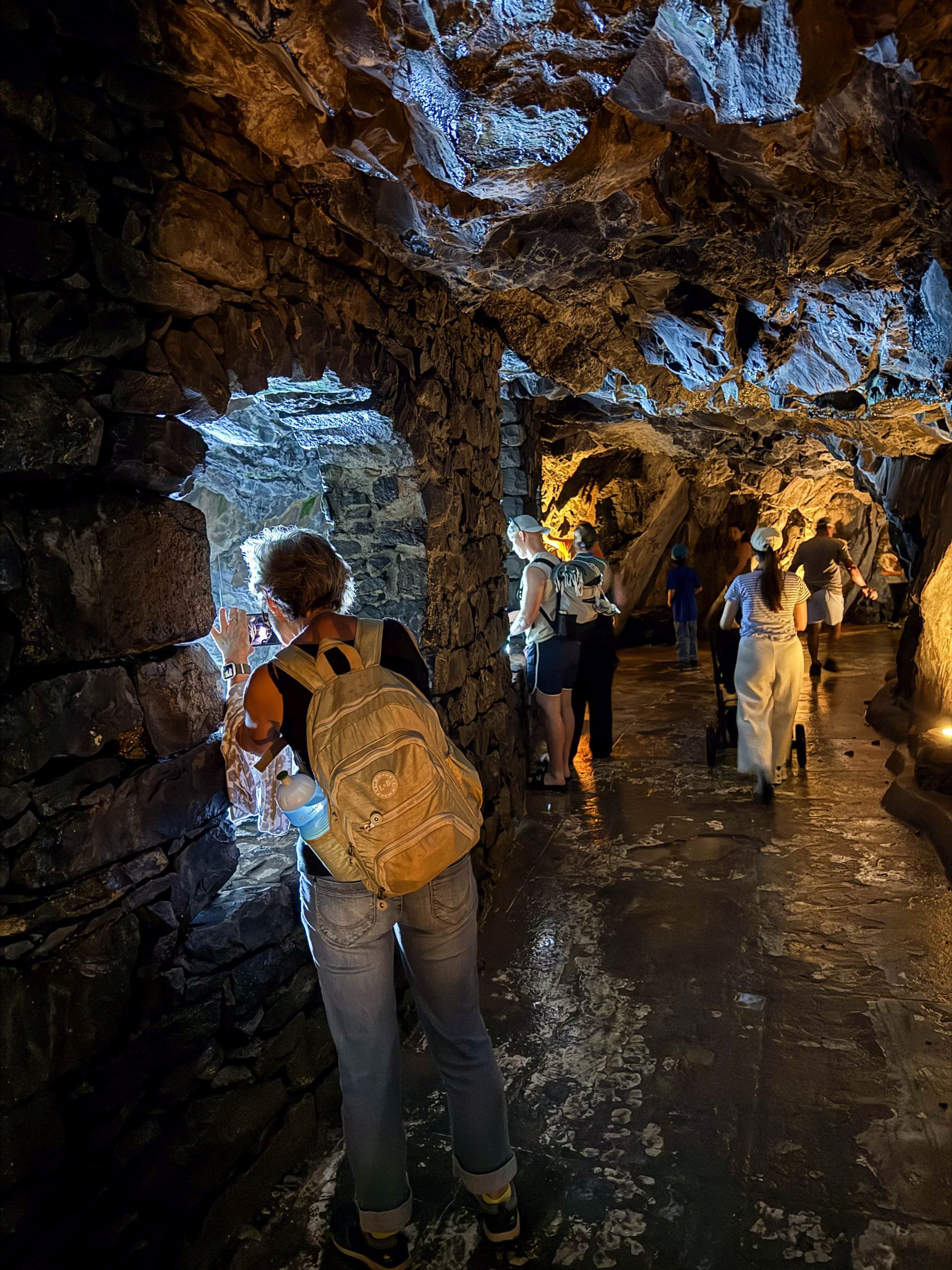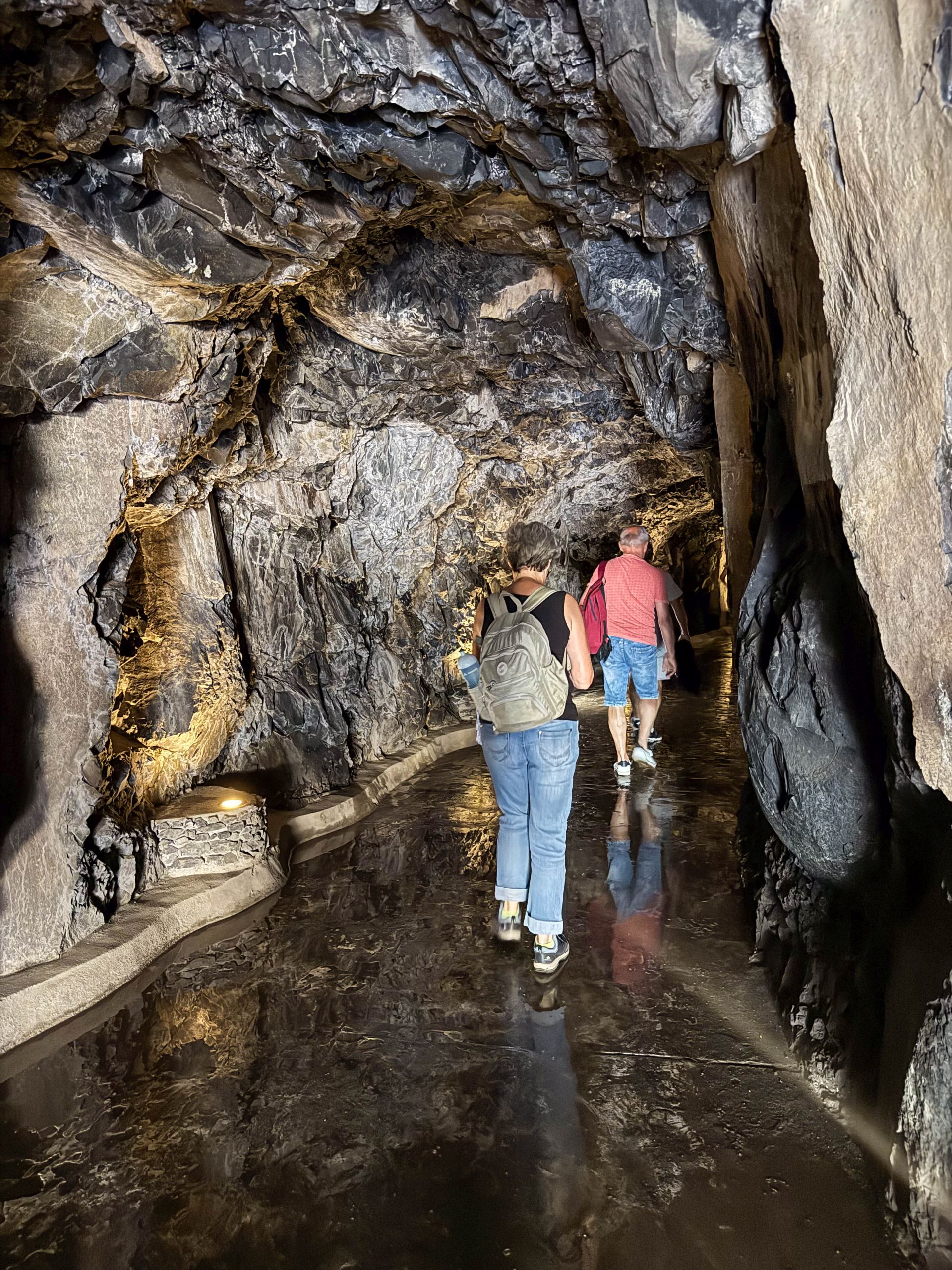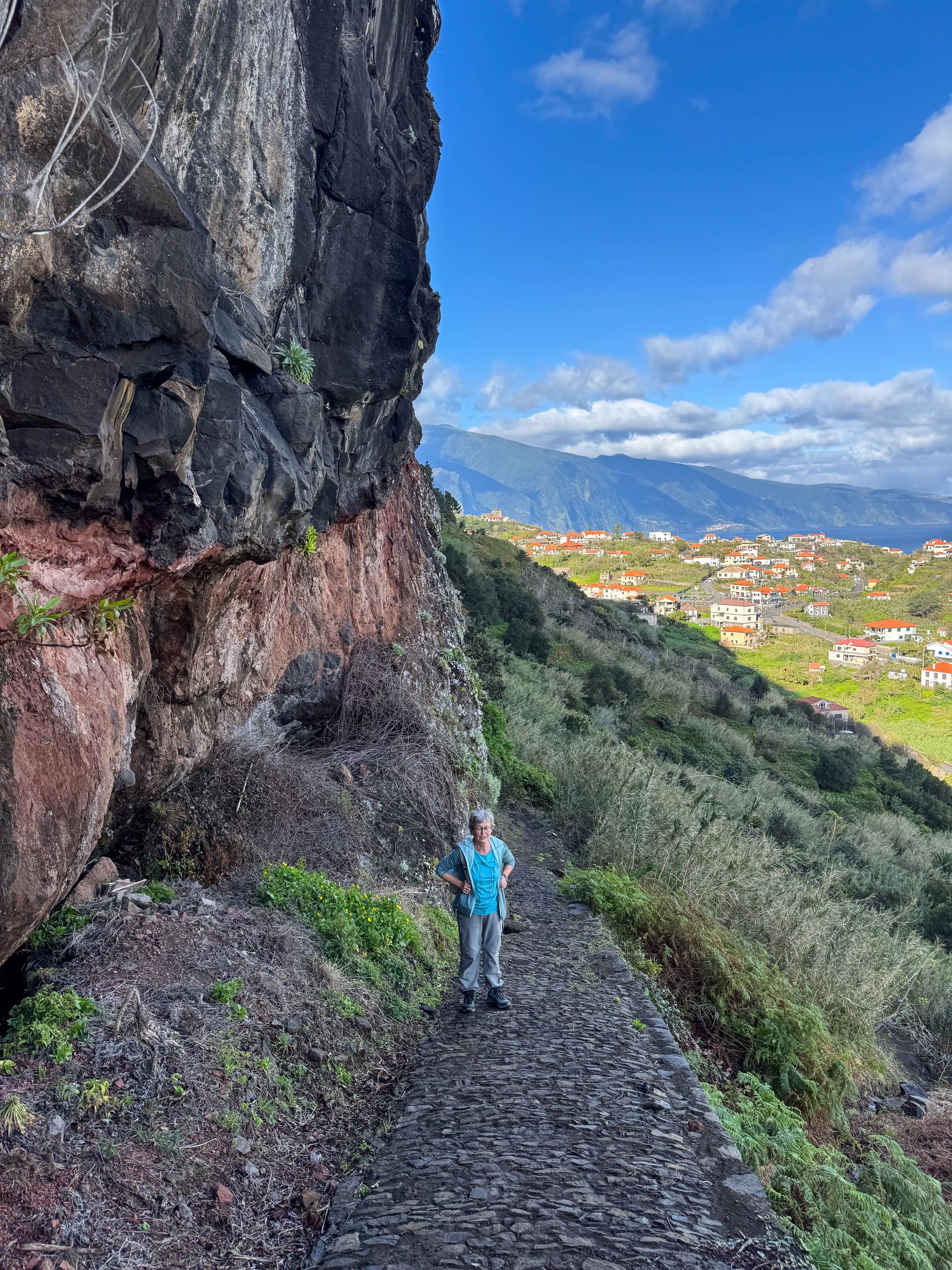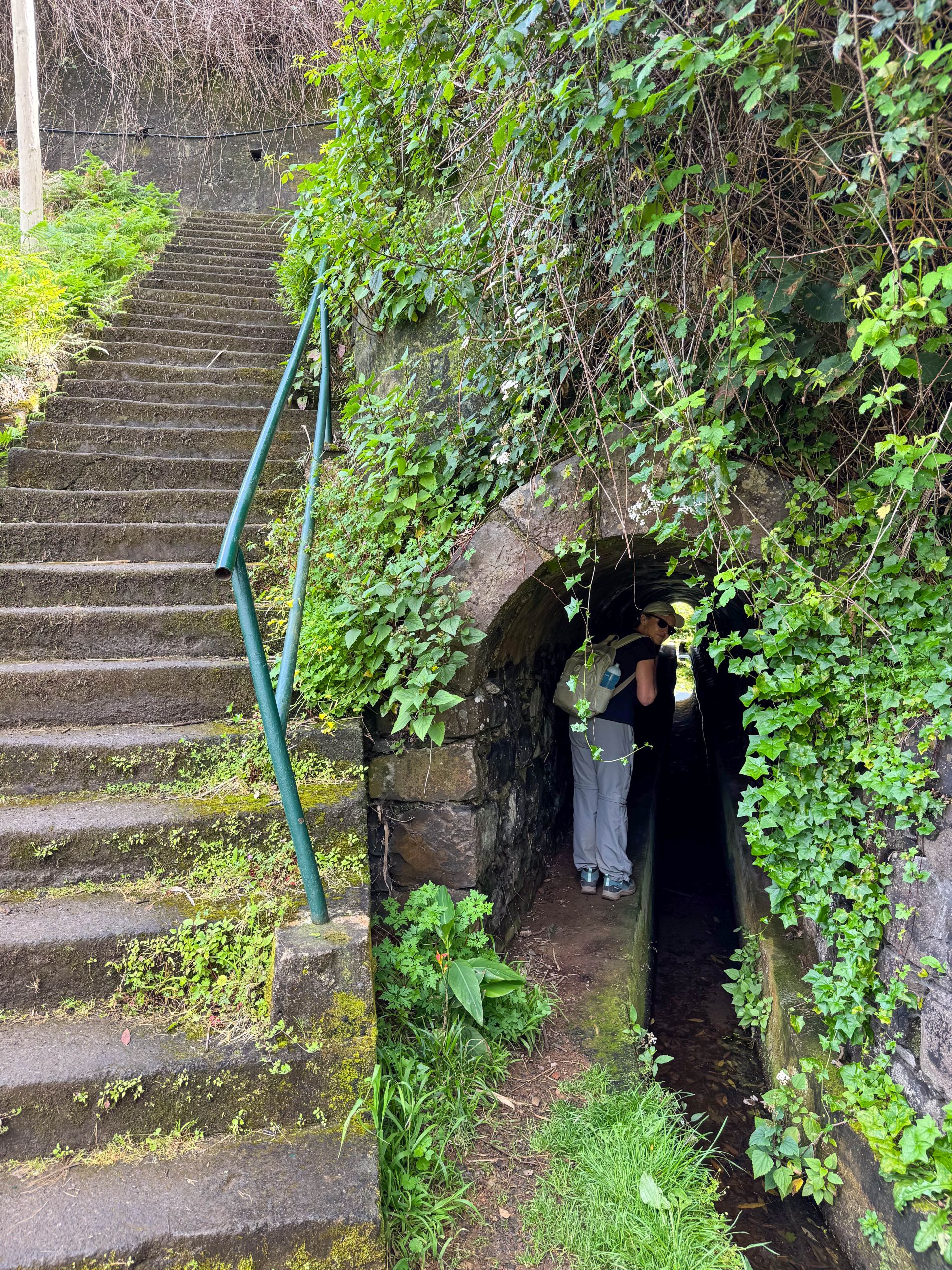 Nach einer vollkommen ruhigen Nacht im breiten, bequemen Bett mit Einzeldecken 😃 machen wir uns nach dem Frühstück zu Fuß auf den Weg nach Funchal. Da der erste Teil des Promenadenweges wegen Bauarbeiten geschlossen ist, machen wir einen Umweg bis zum nächstmöglichen Zugang hinter dem Orcahotel. Von dort spaziert man auf einem breiten Weg bis Funchal. Dabei geht es auch einmal durch einen beleuchteten Tunnel, Doca do Cavacas, in der Mitte mit Blick auf eine Grotte.