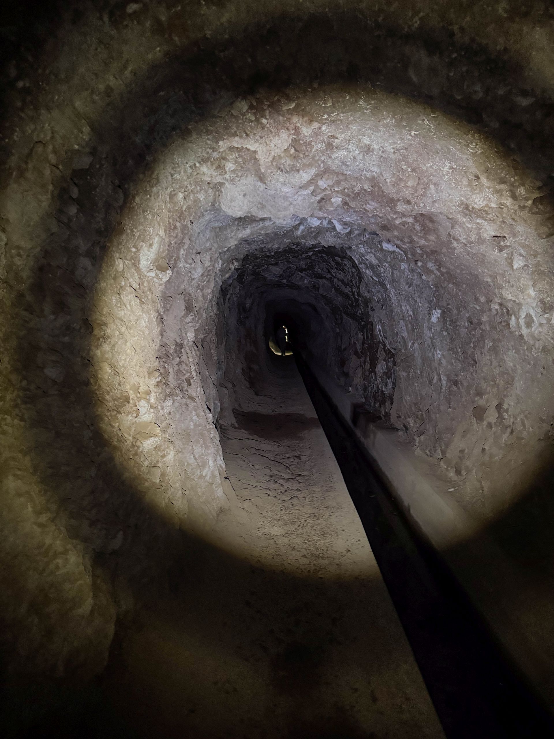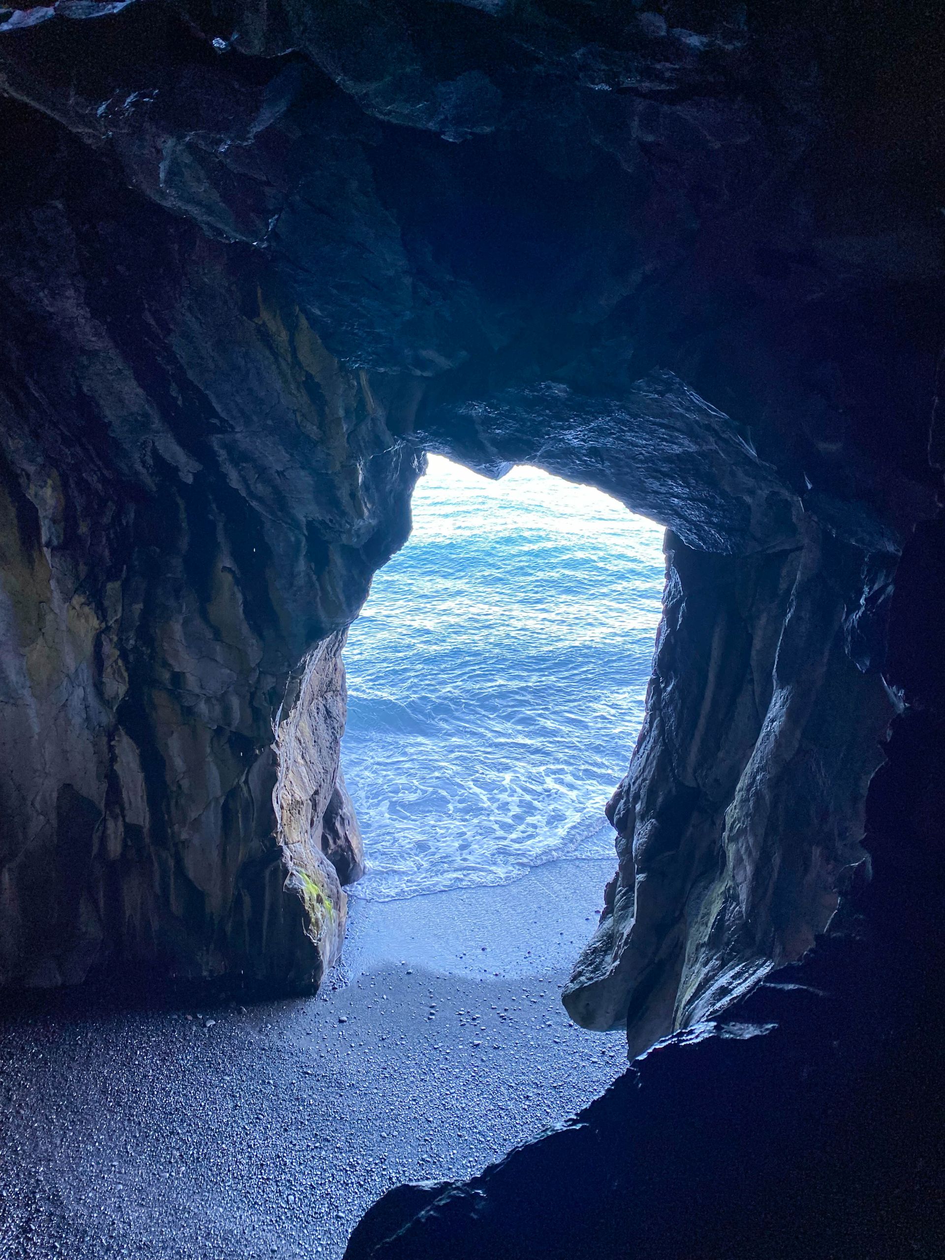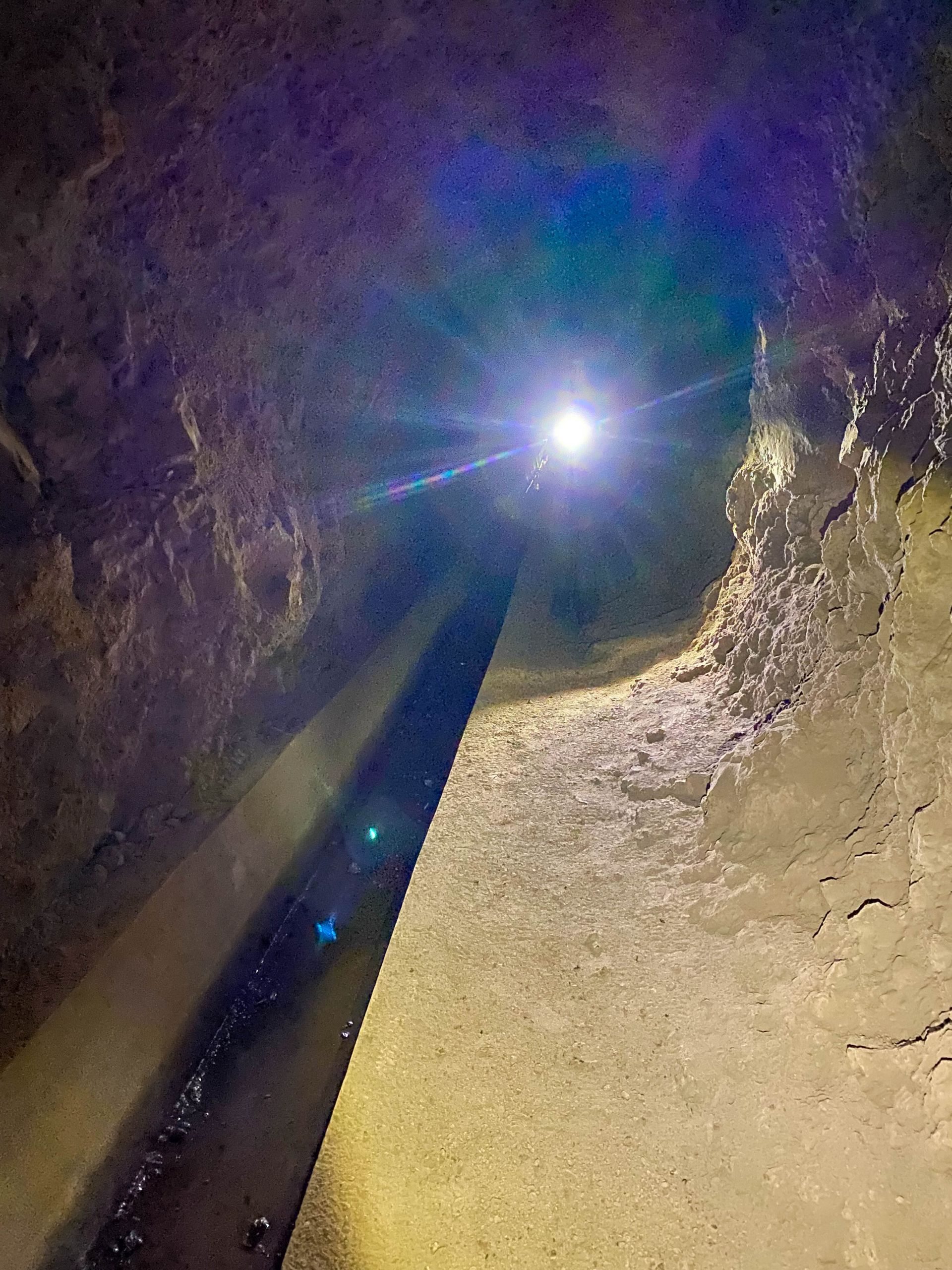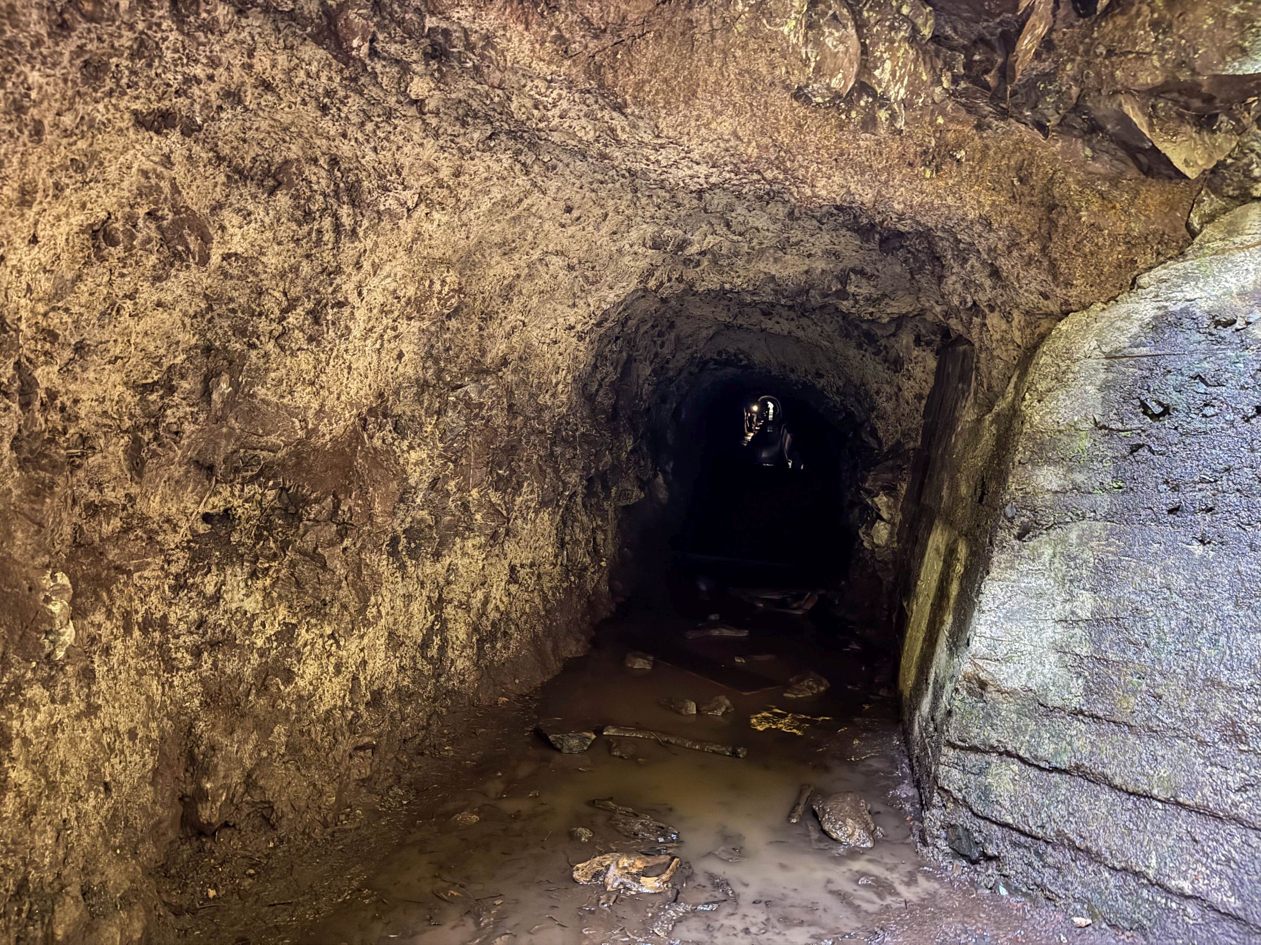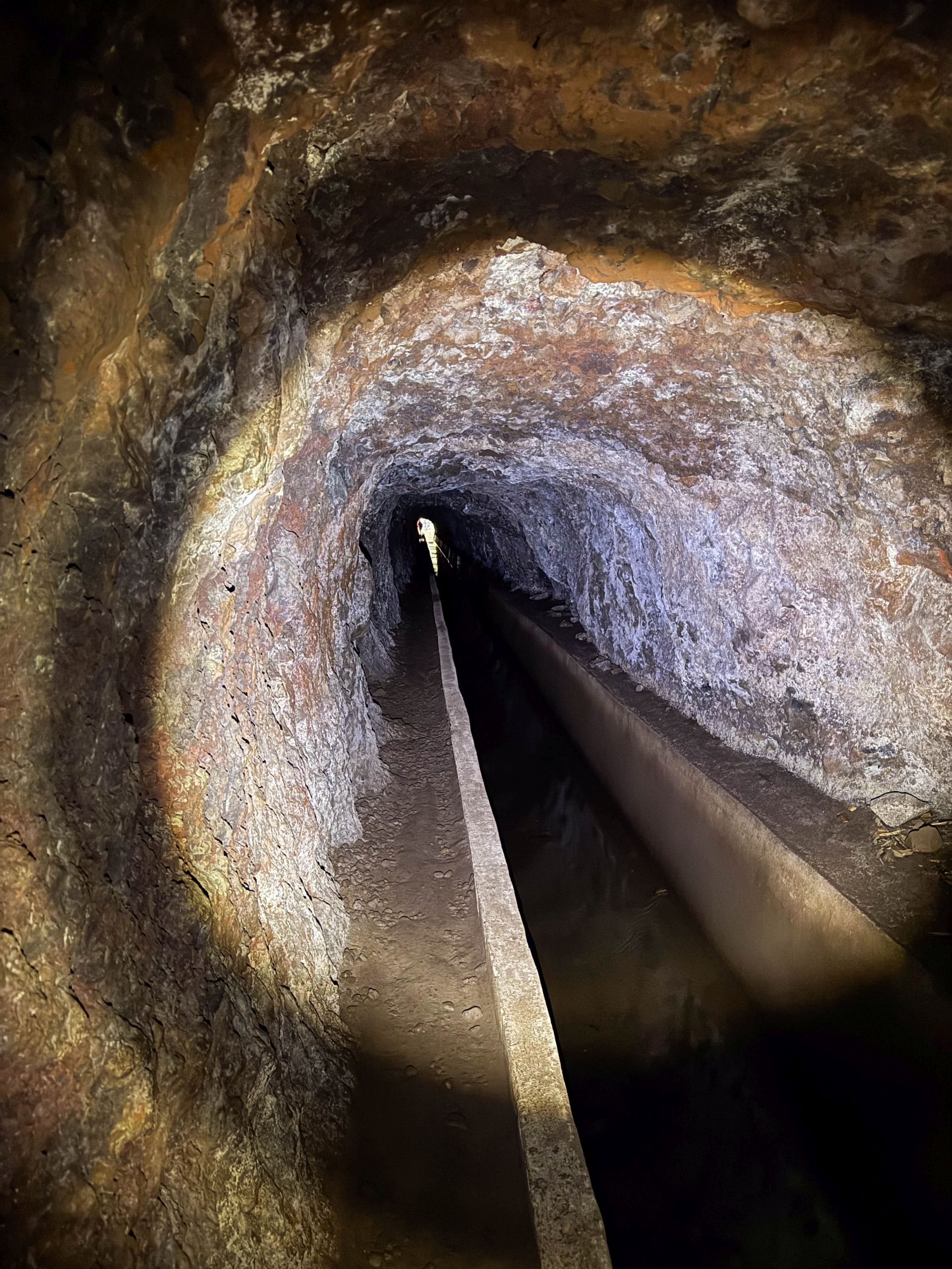 Nach einer vollkommen ruhigen Nacht im breiten, bequemen Bett mit Einzeldecken 😃 machen wir uns nach dem Frühstück zu Fuß auf den Weg nach Funchal. Da der erste Teil des Promenadenweges wegen Bauarbeiten geschlossen ist, machen wir einen Umweg bis zum nächstmöglichen Zugang hinter dem Orcahotel. Von dort spaziert man auf einem breiten Weg bis Funchal. Dabei geht es auch einmal durch einen beleuchteten Tunnel, Doca do Cavacas, in der Mitte mit Blick auf eine Grotte.