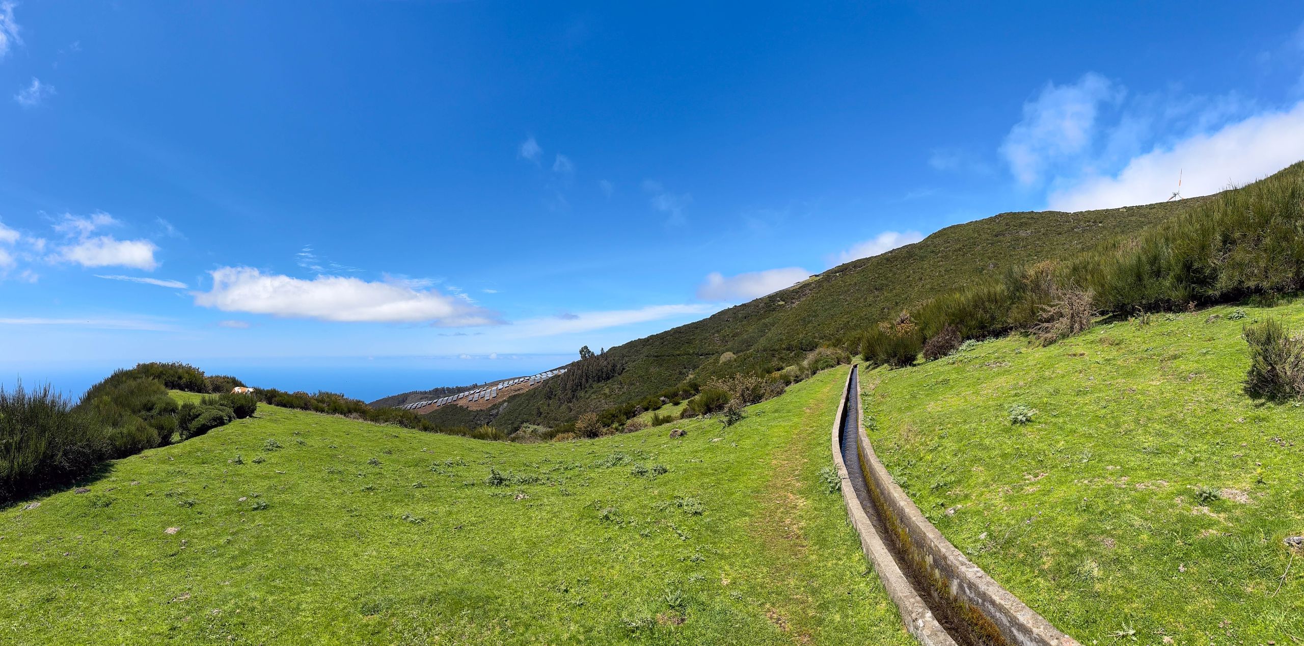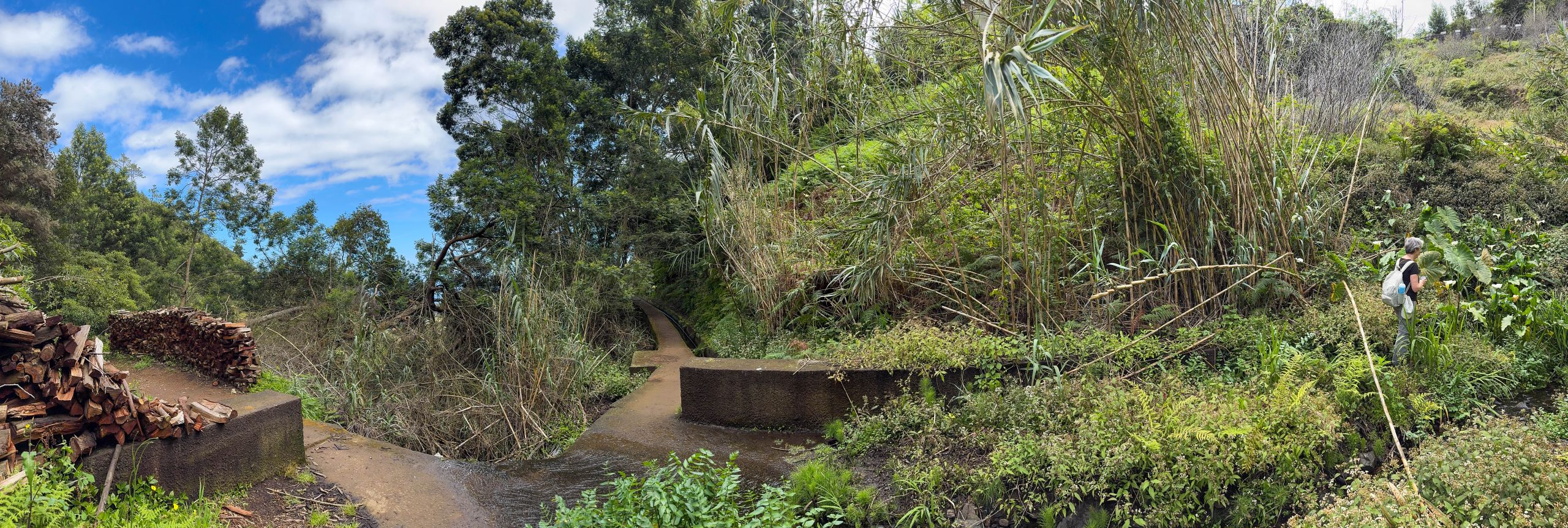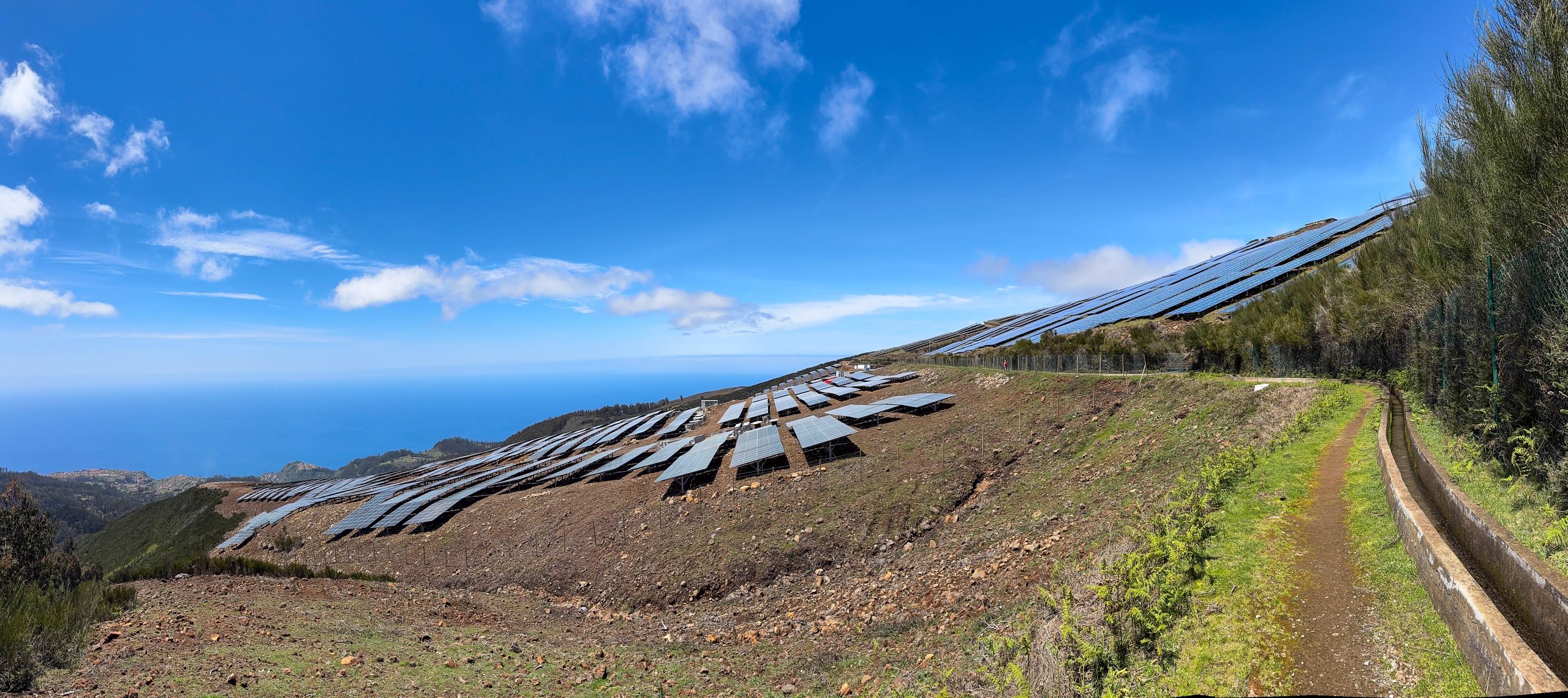 Wieder an der Straße angekommen, entscheiden wir uns, die Levadawanderung auf der anderen Straßenseite auch noch zu gehen. Die Nr. 53 - von Cova Grande zur Fatima Kapelle - ist noch mal 10 km lang, aber einfach. Allerdings führt sie ca. 500 m durch einen Solarpark, was der Landschaft nicht wirklich gut steht. Auch sonst ist es dort wenig spektakulär, viele Ginsterbüsche und verbrannte Strauchgerippe. Der ein oder andere Bachlauf liegt zwar auf dem Weg, aber das gehört für uns schon dazu.