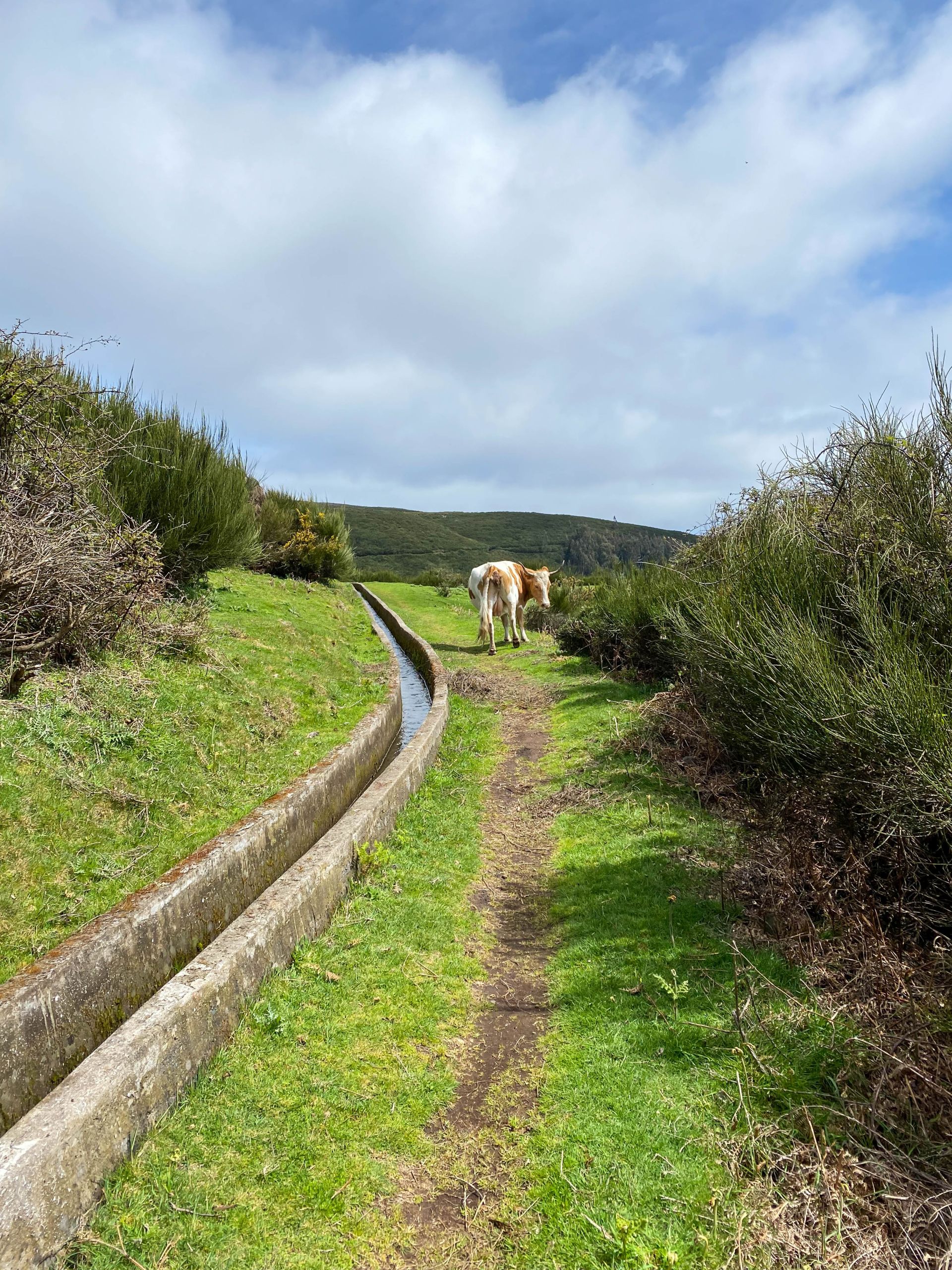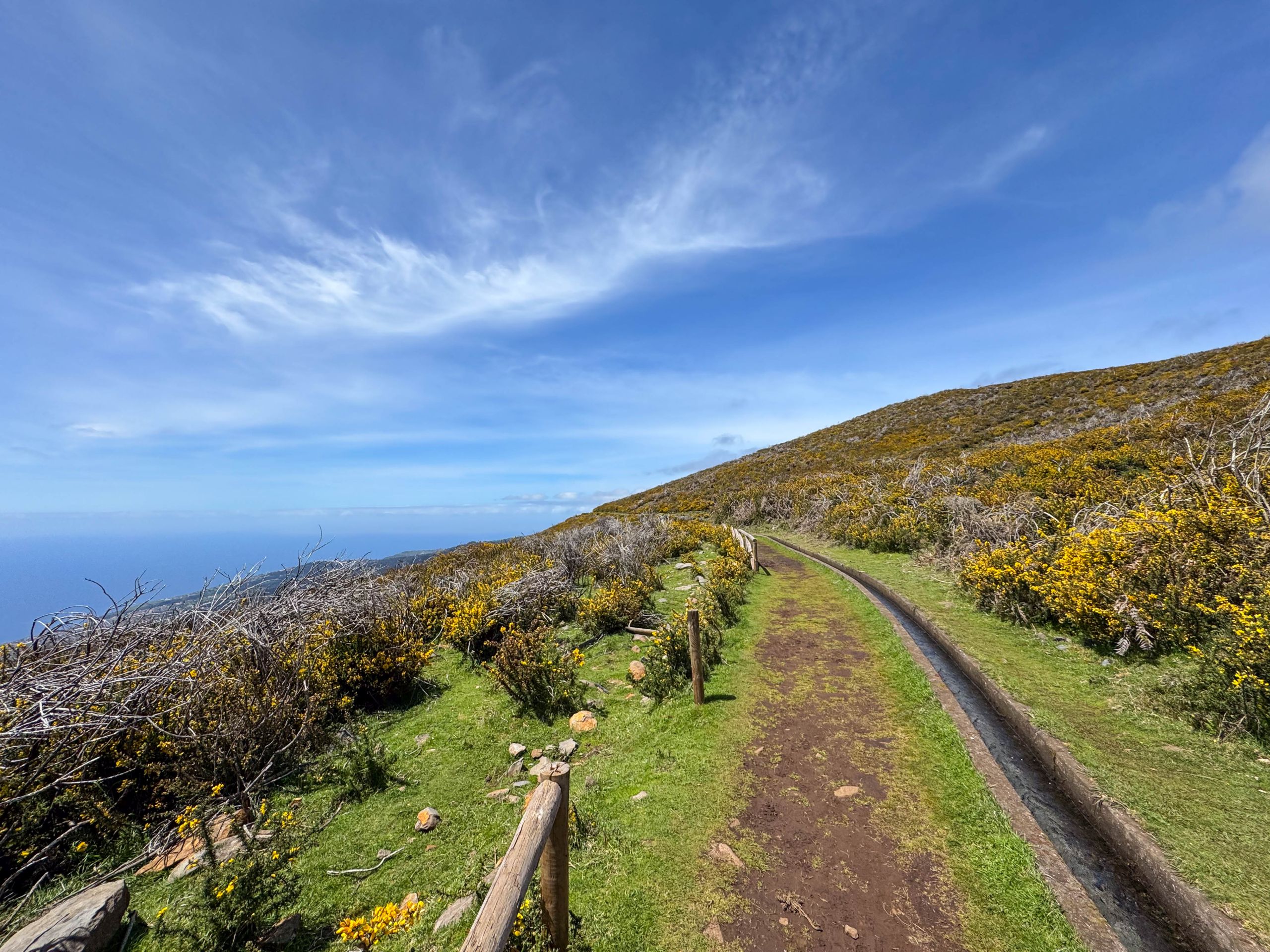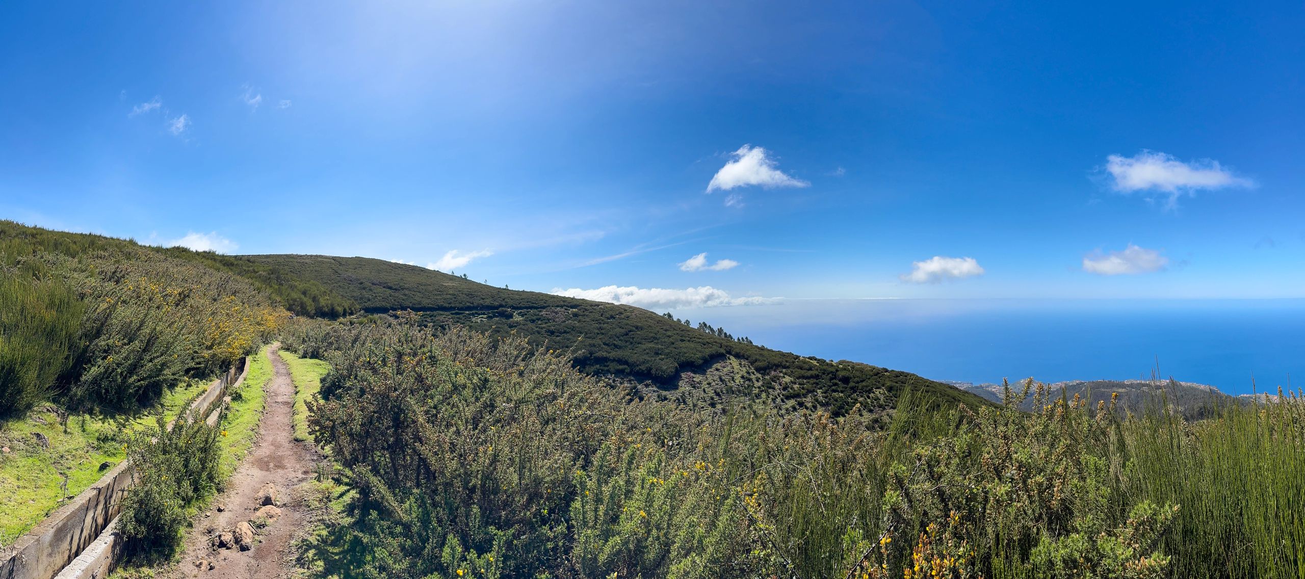 Wieder an der Straße angekommen, entscheiden wir uns, die Levadawanderung auf der anderen Straßenseite auch noch zu gehen. Die Nr. 53 - von Cova Grande zur Fatima Kapelle - ist noch mal 10 km lang, aber einfach. Allerdings führt sie ca. 500 m durch einen Solarpark, was der Landschaft nicht wirklich gut steht. Auch sonst ist es dort wenig spektakulär, viele Ginsterbüsche und verbrannte Strauchgerippe. Der ein oder andere Bachlauf liegt zwar auf dem Weg, aber das gehört für uns schon dazu.
