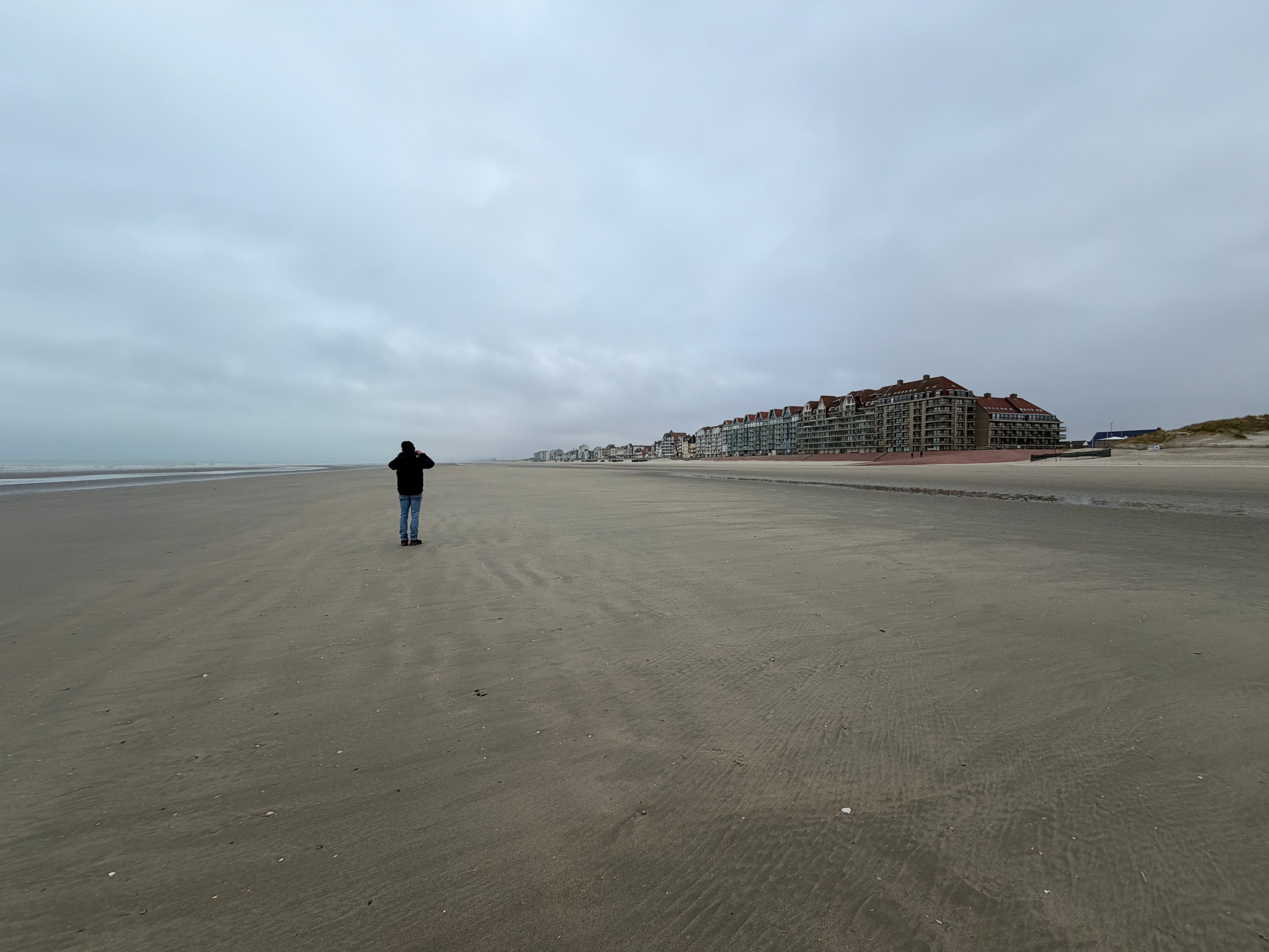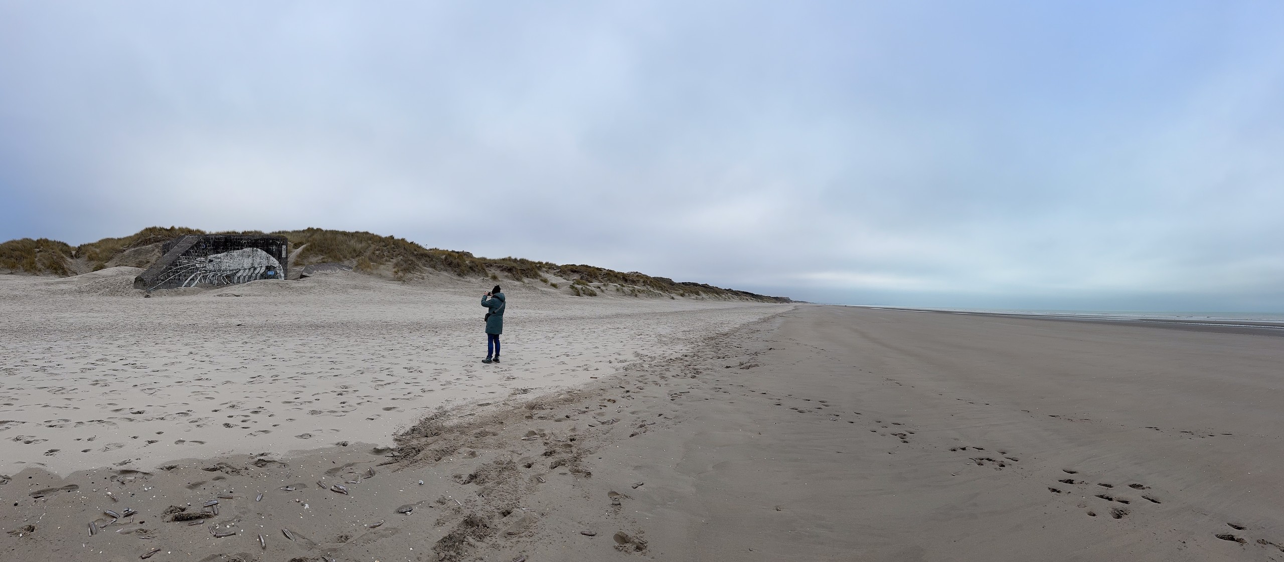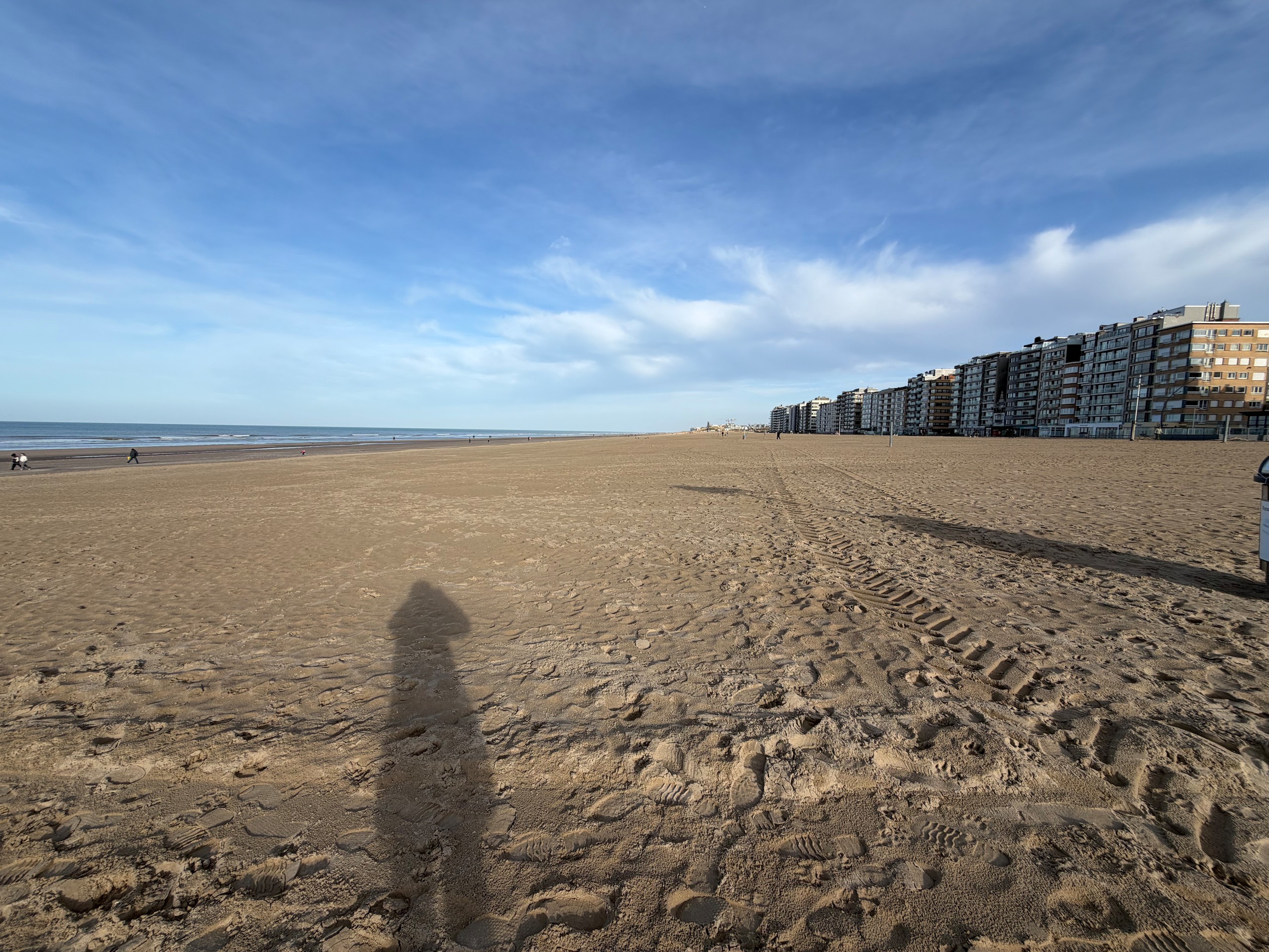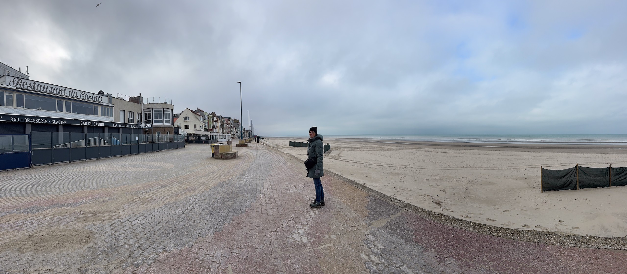 Die Promenade ist jetzt im Januar wie ausgestorben und hat einen hübsch-häßlichen Charme. Im Sommer sieht es sicher deutlich einladender aus. Wir laufen dann noch ein ganzes Stück am Meer entlang, denn der Strand ist hier wunderschön weitläufig und es ist gerade Ebbe. Aber trotzdem kehren wir bald wieder um, denn es ist schon recht frisch. Viel werden wir heute nicht mehr unternehmen, wir wollen morgen eine größere Runde nach Belgien laufen, da müssen wir unsere Kräfte etwas schonen. Der Spaziergang ist auch wieder auf Komoot zu finden (Account erforderlich) oder auch komplett ohne über GoogleMaps.