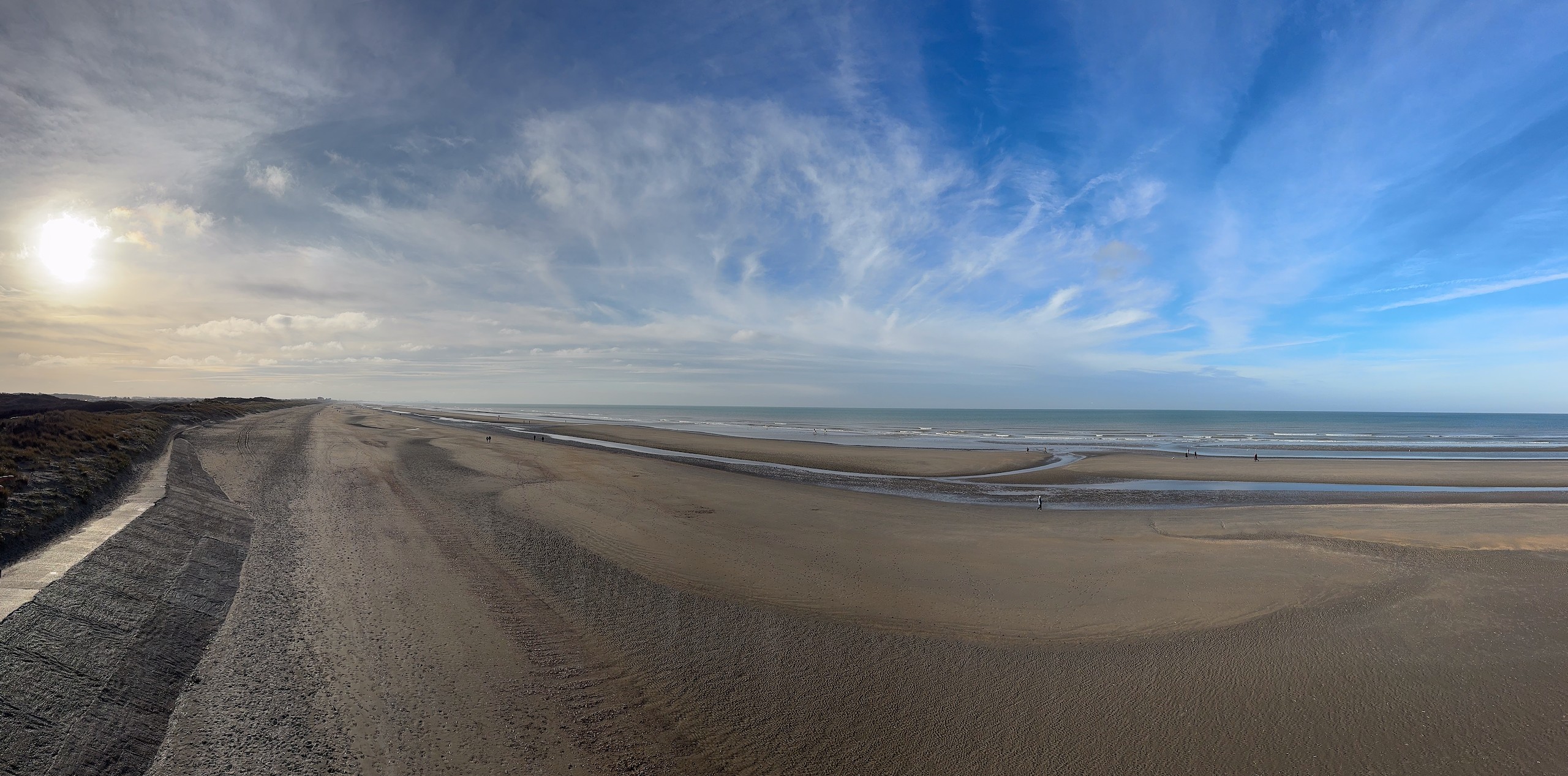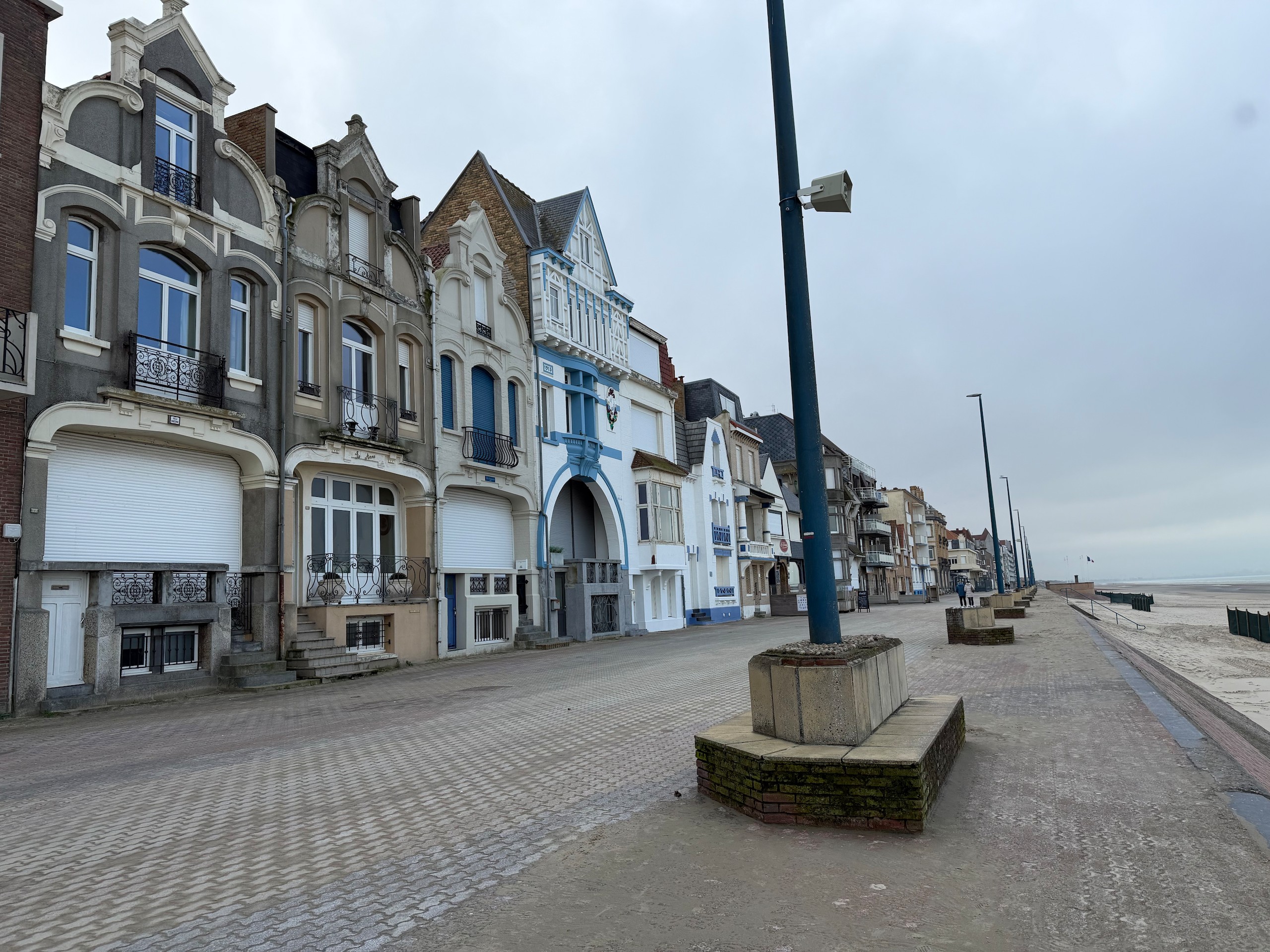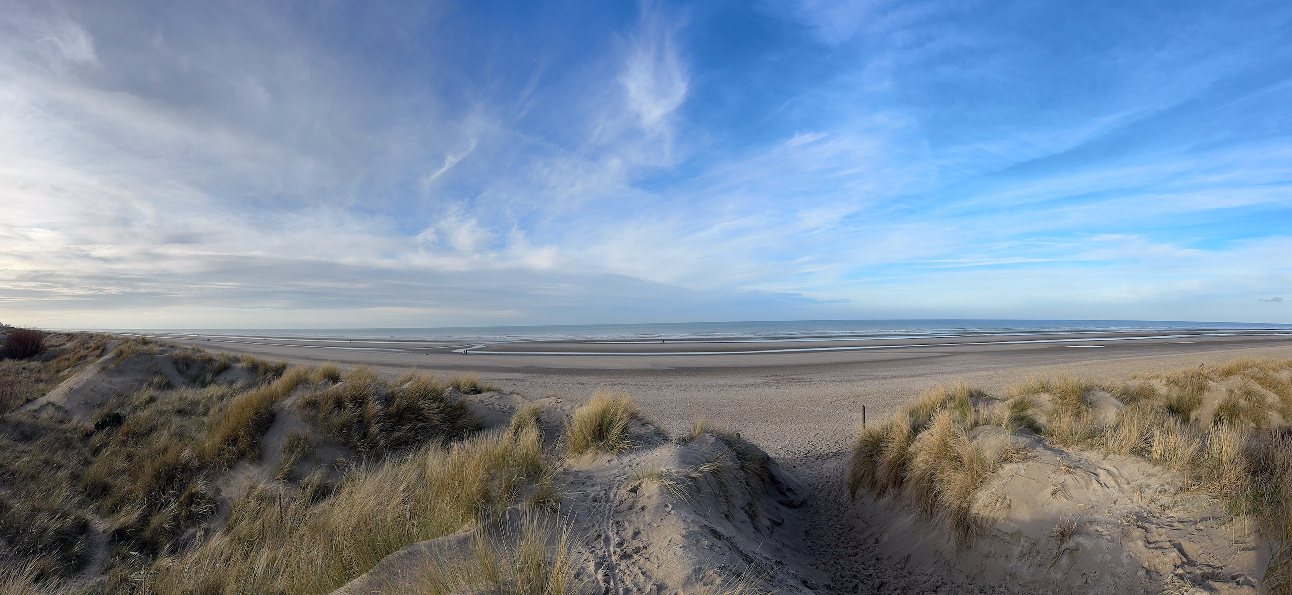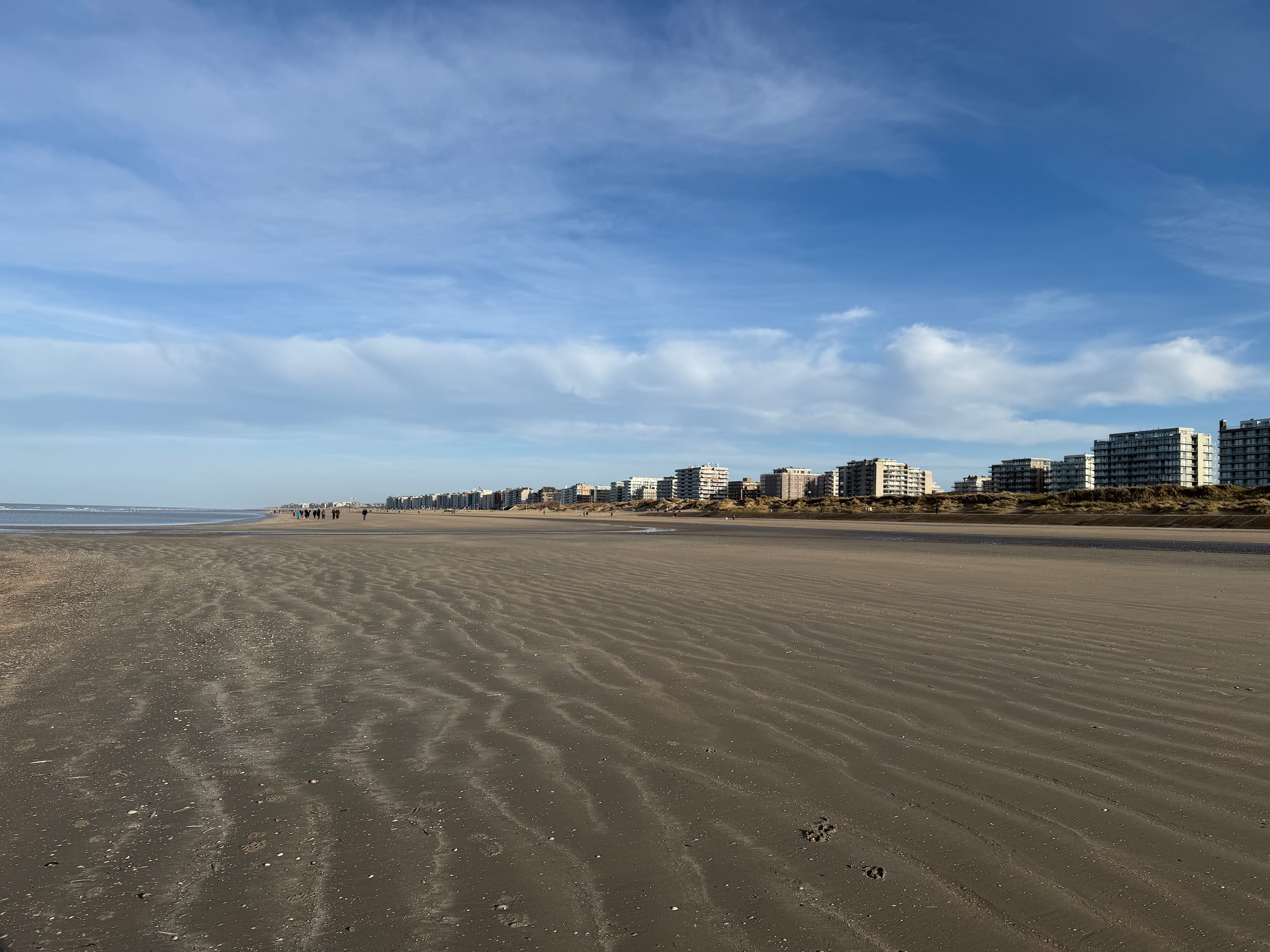 Die Promenade ist jetzt im Januar wie ausgestorben und hat einen hübsch-häßlichen Charme. Im Sommer sieht es sicher deutlich einladender aus. Wir laufen dann noch ein ganzes Stück am Meer entlang, denn der Strand ist hier wunderschön weitläufig und es ist gerade Ebbe. Aber trotzdem kehren wir bald wieder um, denn es ist schon recht frisch. Viel werden wir heute nicht mehr unternehmen, wir wollen morgen eine größere Runde nach Belgien laufen, da müssen wir unsere Kräfte etwas schonen. Der Spaziergang ist auch wieder auf Komoot zu finden (Account erforderlich) oder auch komplett ohne über GoogleMaps.