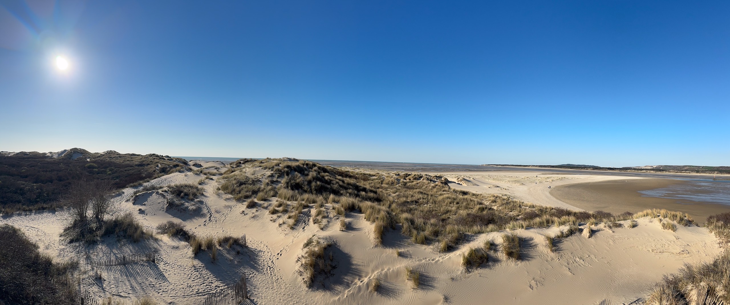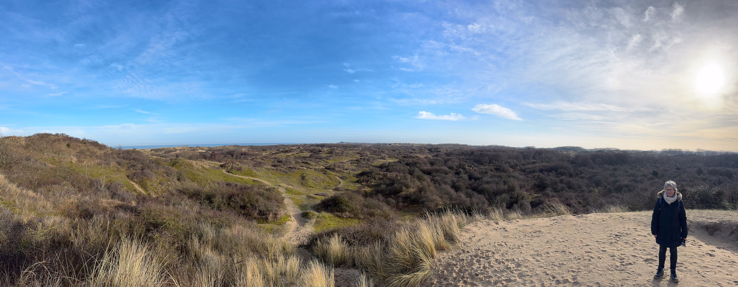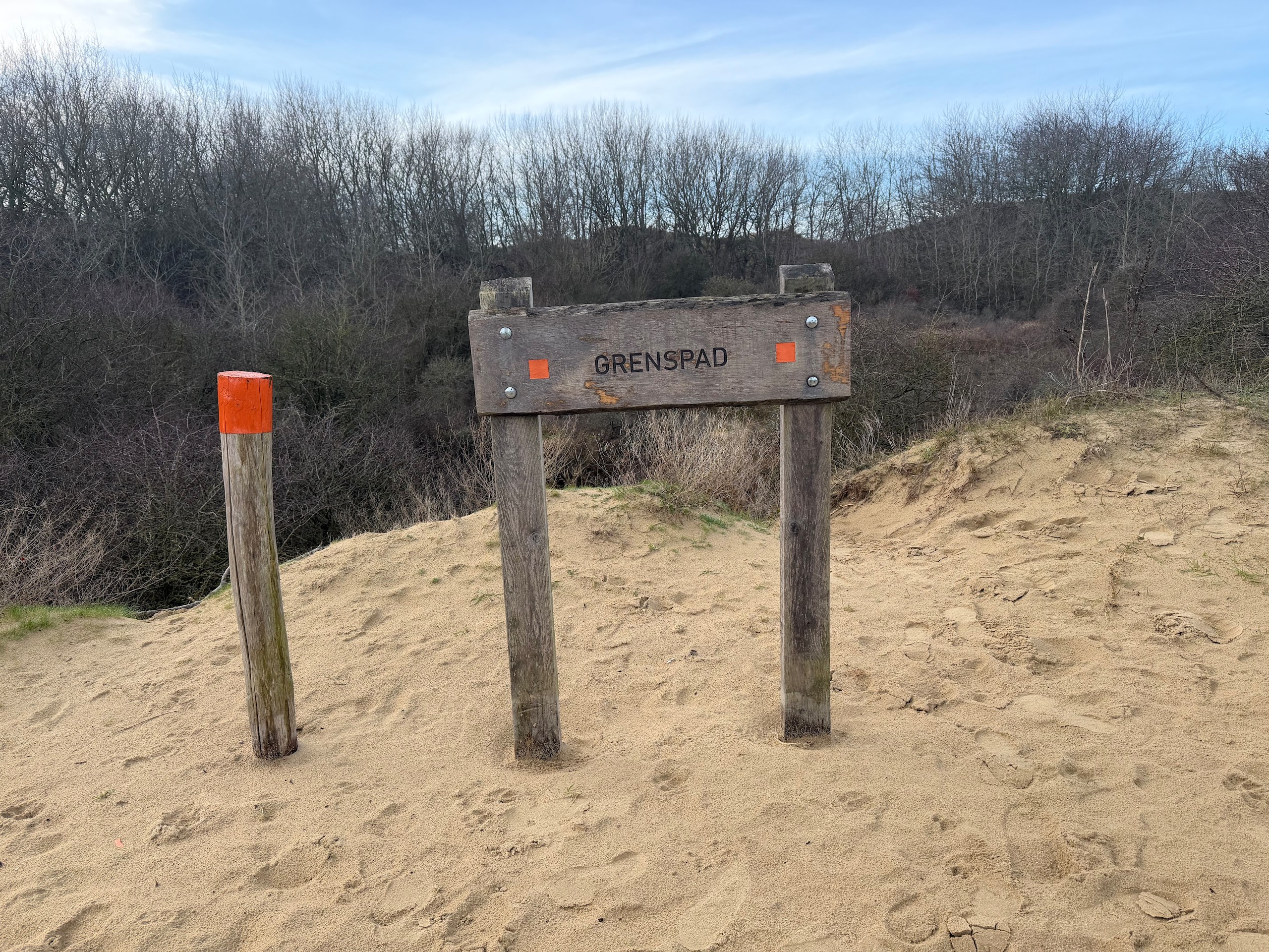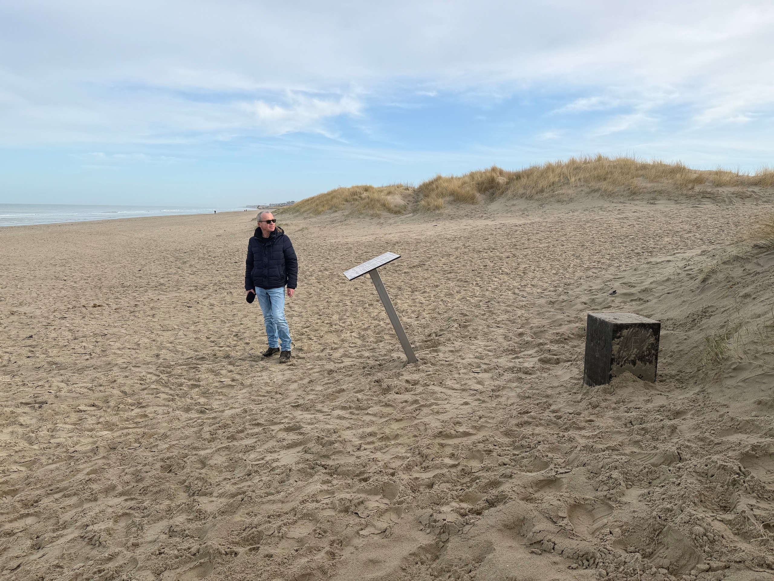 Heute morgen haben wir bis 9 Uhr geschlafen. Gestern Abend hat es noch ordentlich geregnet, aber jetzt scheint sogar die Sonne bei fast 5 Grad. Wir wollen heute durch die Dünen bis ins belgische De Panne laufen. Der Weg dorthin ist sehr schön, besonders auf der französischen Seite läuft es sich gut. Wir finden den Grenzstein und dann geht es durch das belgische Naturschutzgebiet "De Westhoek" auf anstrengenden Sandpfaden weiter.