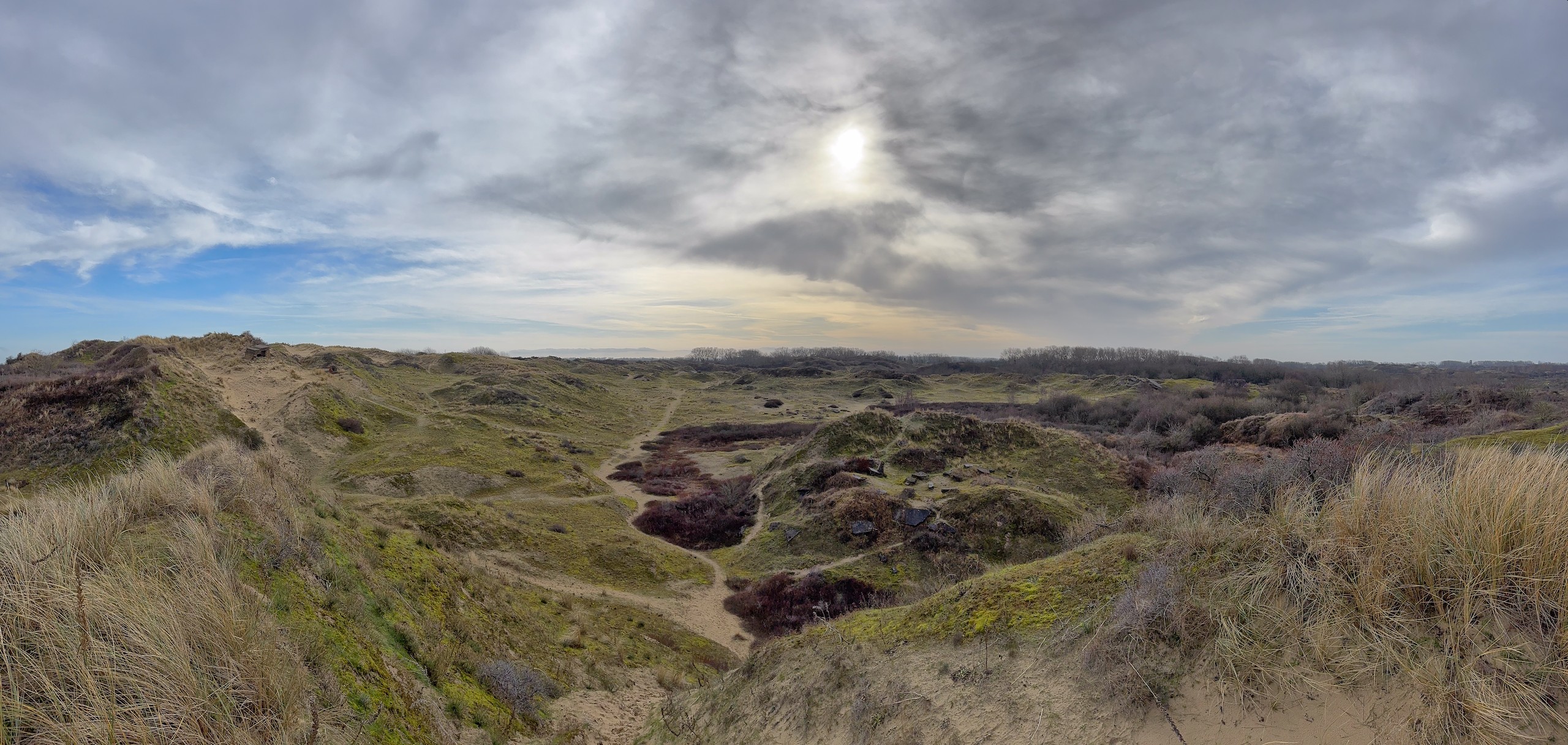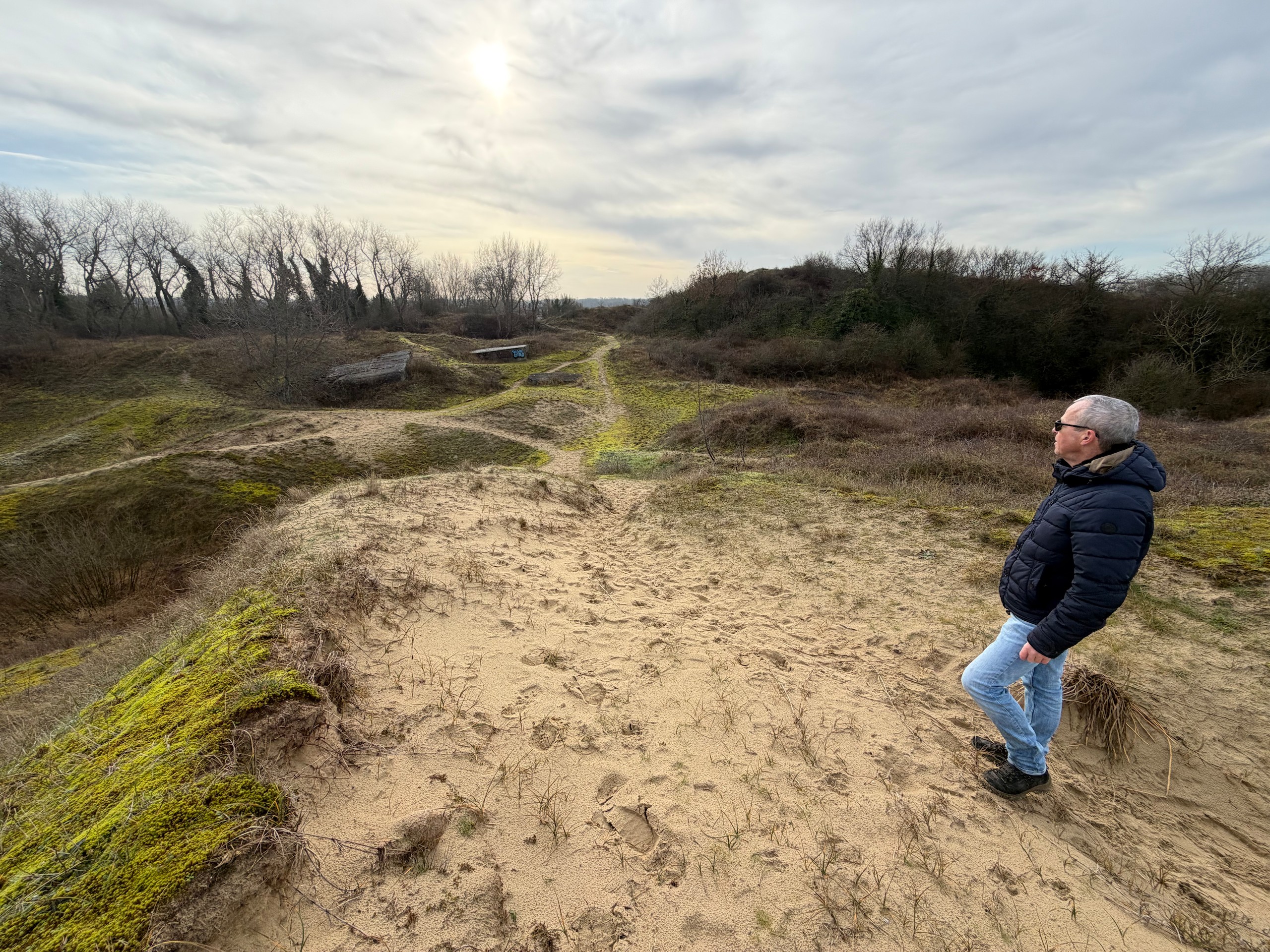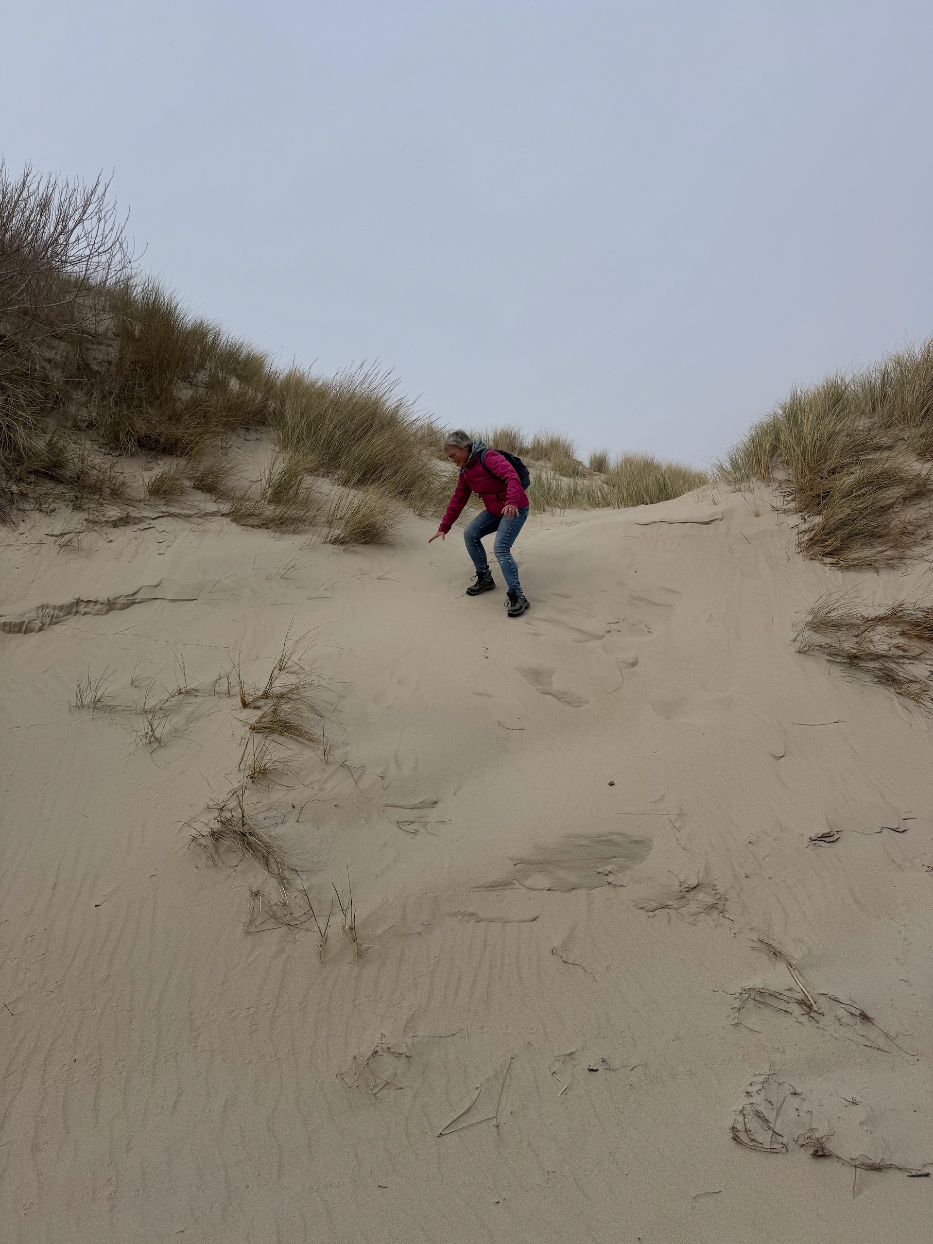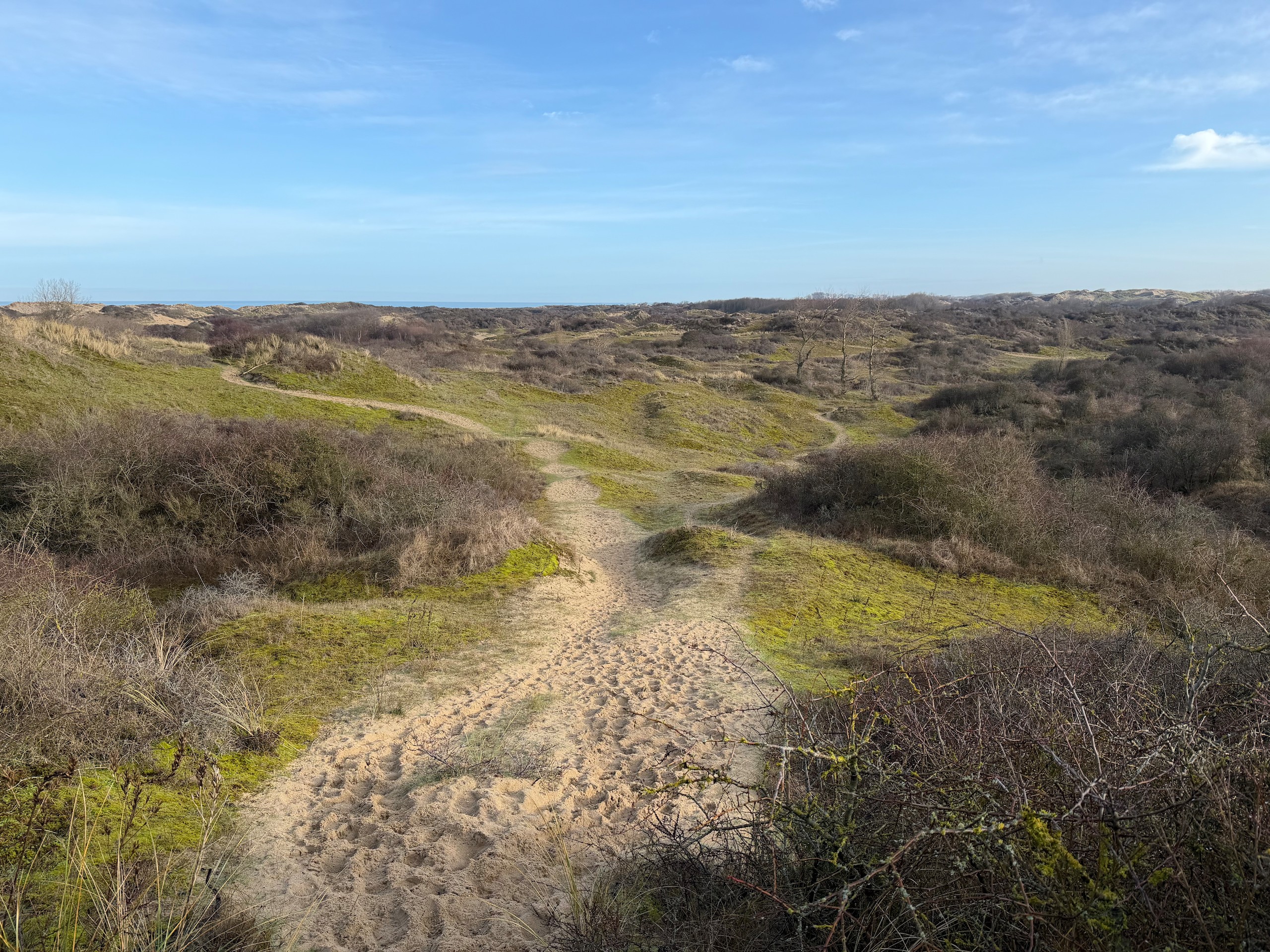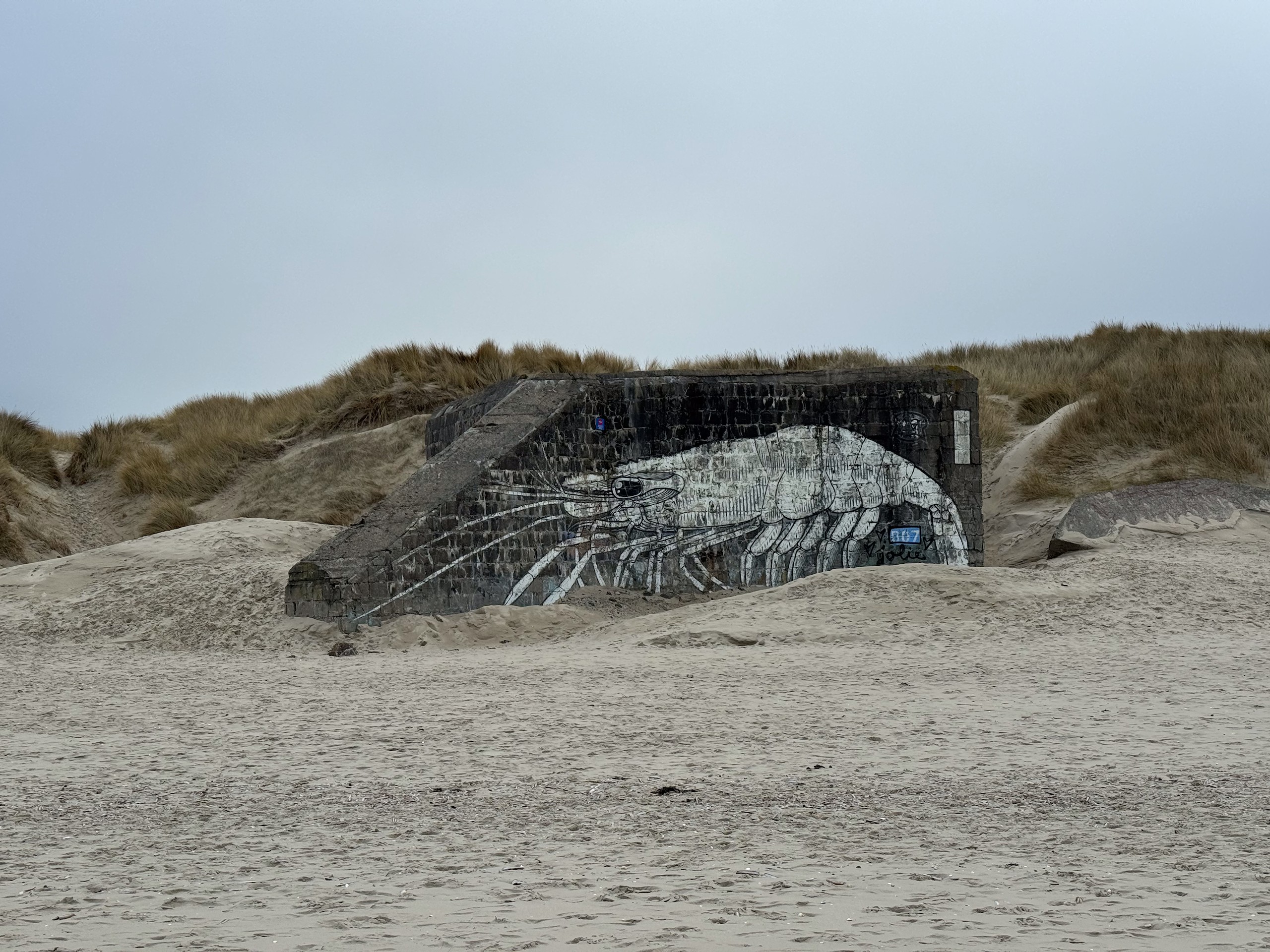 Heute morgen haben wir bis 9 Uhr geschlafen. Gestern Abend hat es noch ordentlich geregnet, aber jetzt scheint sogar die Sonne bei fast 5 Grad. Wir wollen heute durch die Dünen bis ins belgische De Panne laufen. Der Weg dorthin ist sehr schön, besonders auf der französischen Seite läuft es sich gut. Wir finden den Grenzstein und dann geht es durch das belgische Naturschutzgebiet "De Westhoek" auf anstrengenden Sandpfaden weiter.