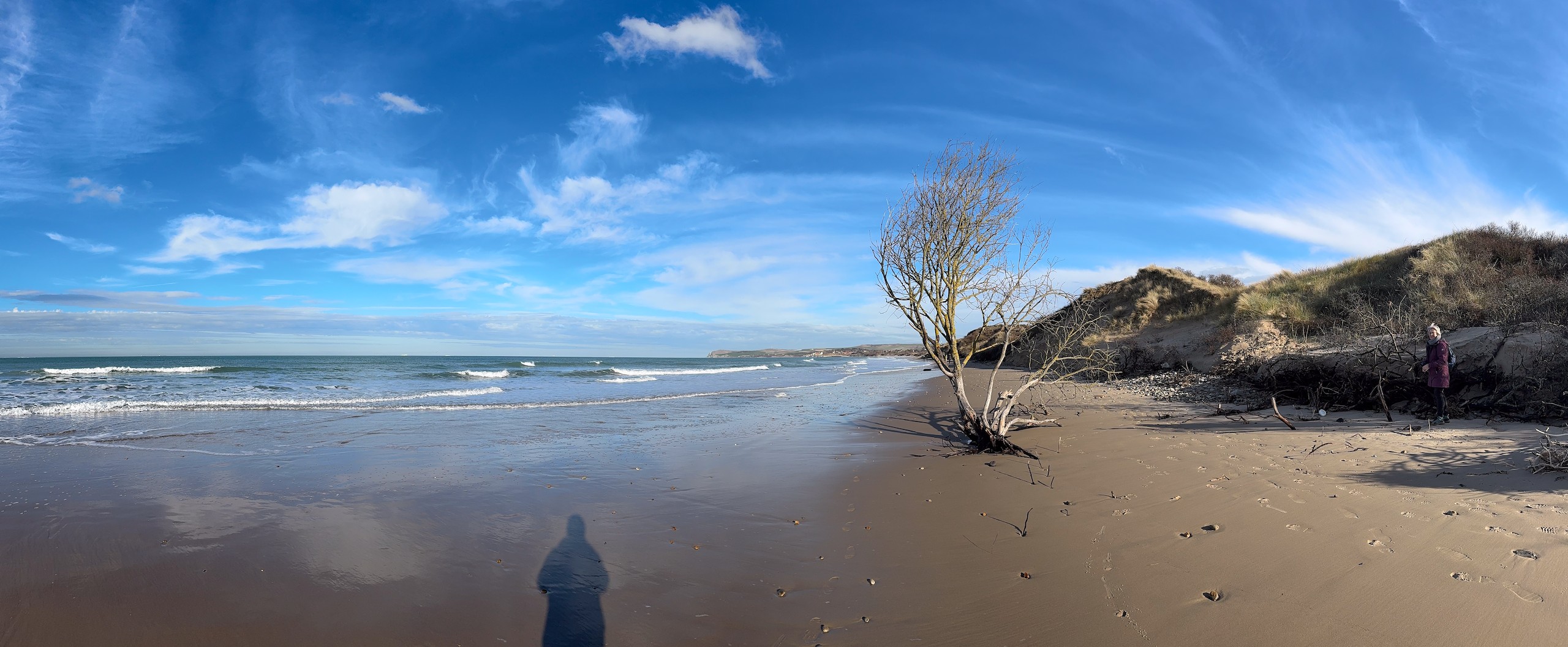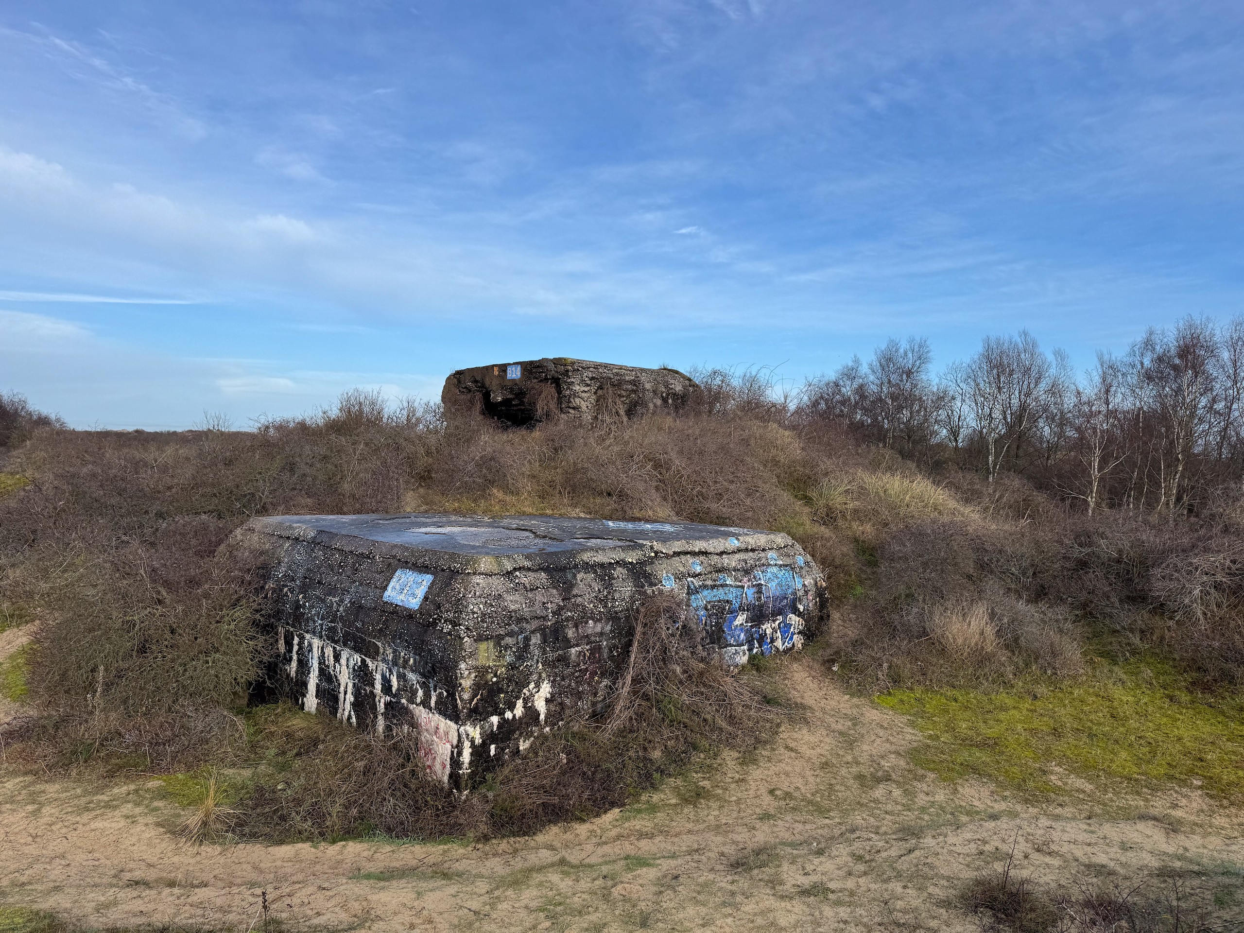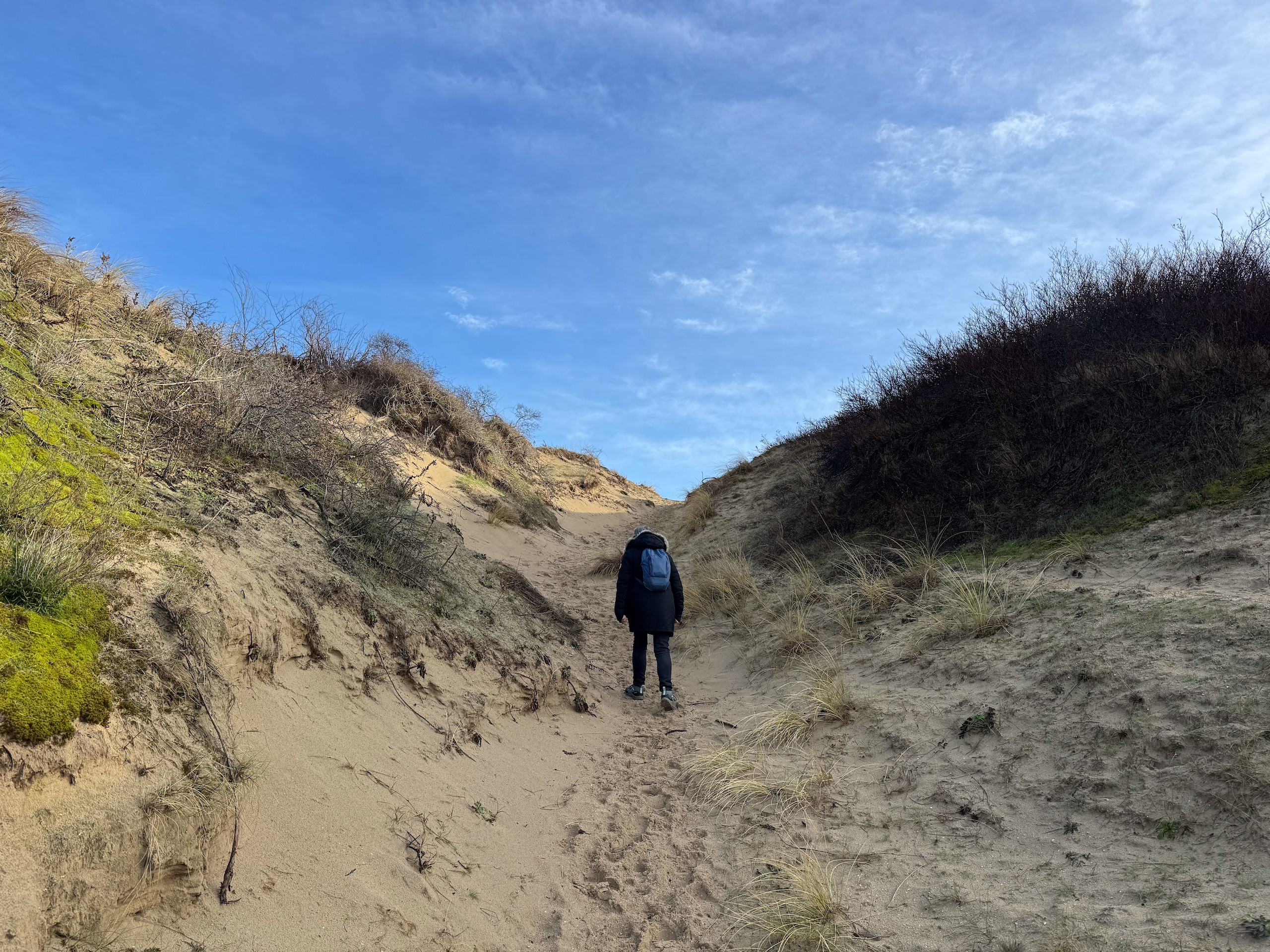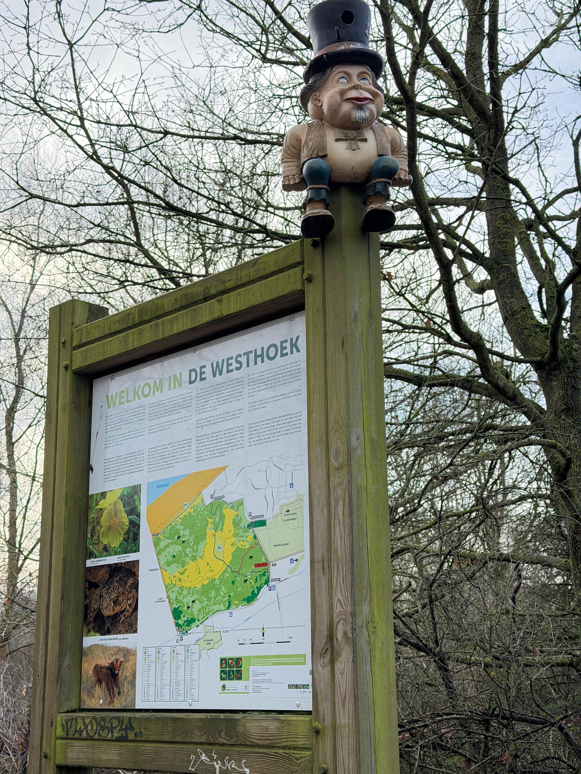 Heute morgen haben wir bis 9 Uhr geschlafen. Gestern Abend hat es noch ordentlich geregnet, aber jetzt scheint sogar die Sonne bei fast 5 Grad. Wir wollen heute durch die Dünen bis ins belgische De Panne laufen. Der Weg dorthin ist sehr schön, besonders auf der französischen Seite läuft es sich gut. Wir finden den Grenzstein und dann geht es durch das belgische Naturschutzgebiet "De Westhoek" auf anstrengenden Sandpfaden weiter.