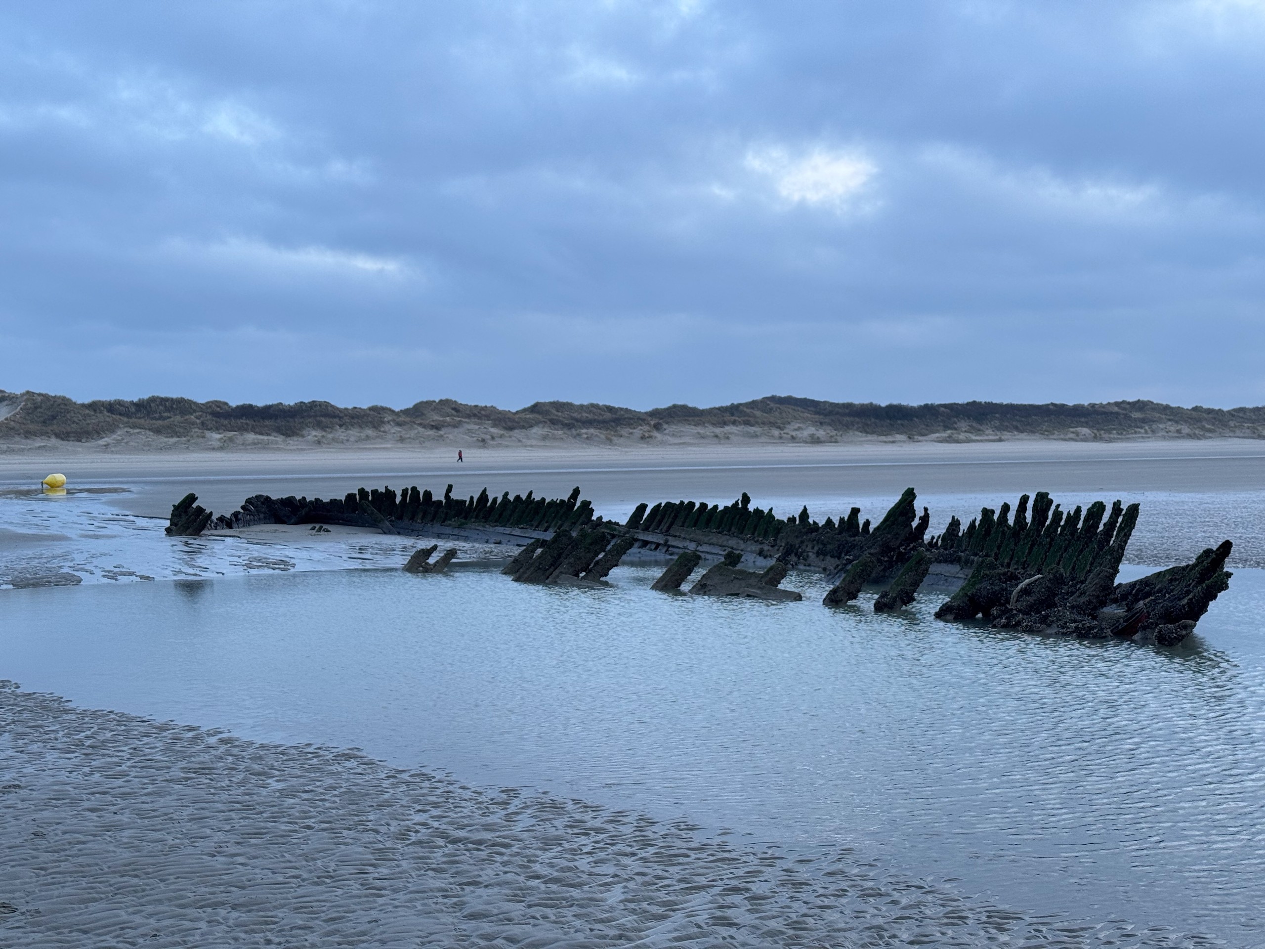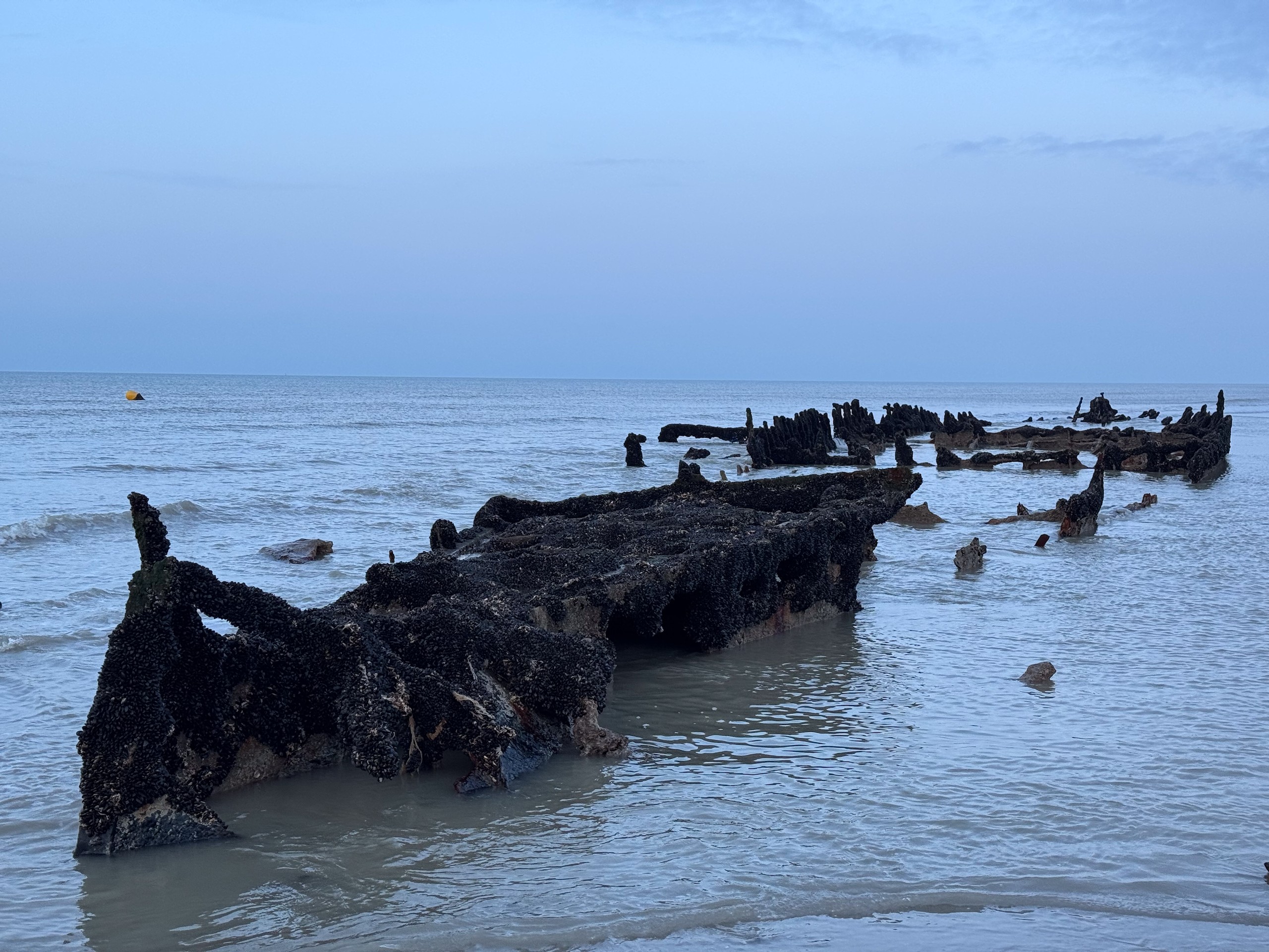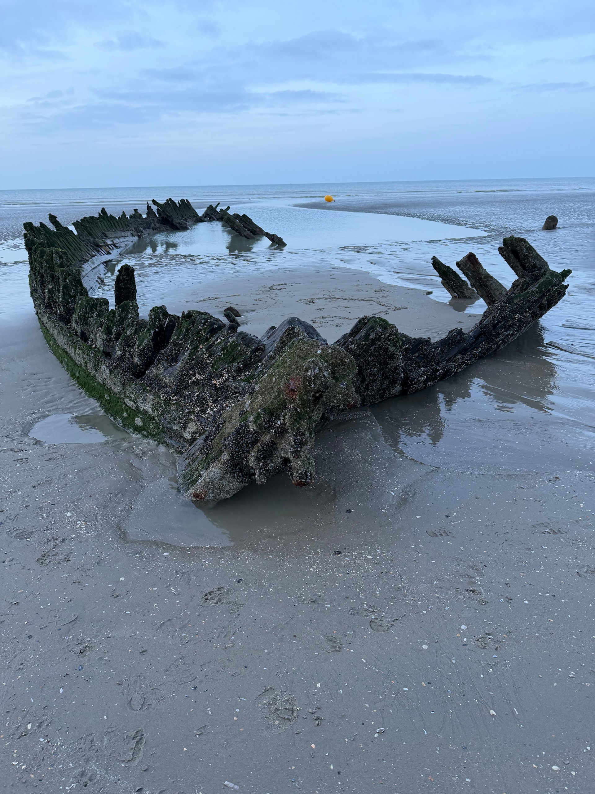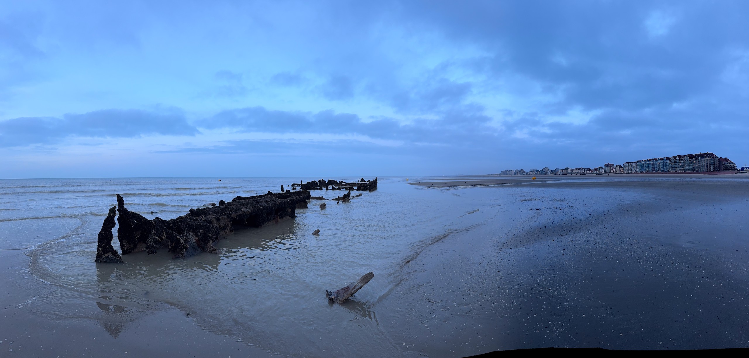 Nachdem wir dann noch auf Komoot gesehen haben, dass es hier am Strand bei Ebbe einige Schiffswracks zu sehen gibt, haben wir uns kurzerhand wieder auf den Weg gemacht und einige Fotos davon geschossen. Die Schiffswracks am Strand von Bray-Dunes sind übrigens von der Operation Dynamo im Mai 1940, bei der alliierte Soldaten aus Dünkirchen herausgeholt wurden. Hier findet man die Überreste der „Claude London“ oder der „Devonia“. Abends haben wir dann bei einem Gläschen Sekt noch auf Gerd's 63. Geburtstag angestoßen. Noch zwei Tage, dann ist er offiziell Rentner.
