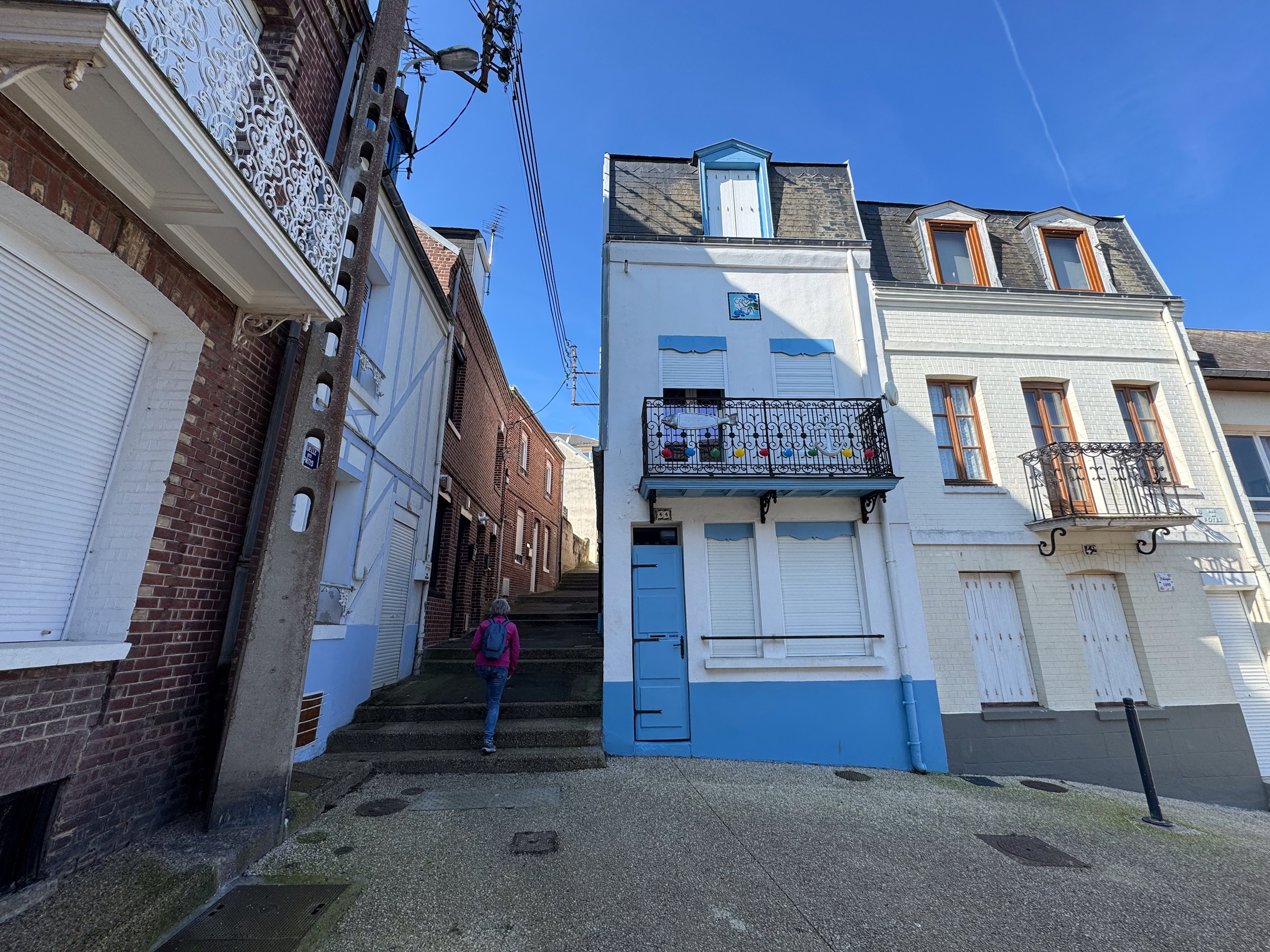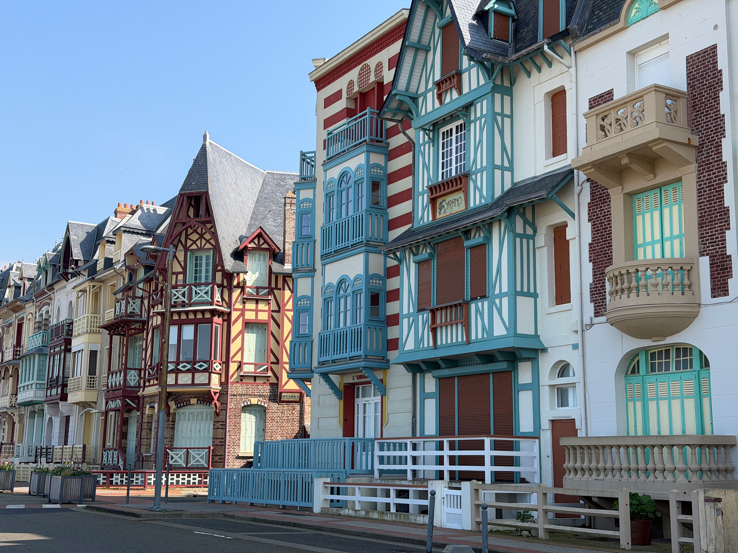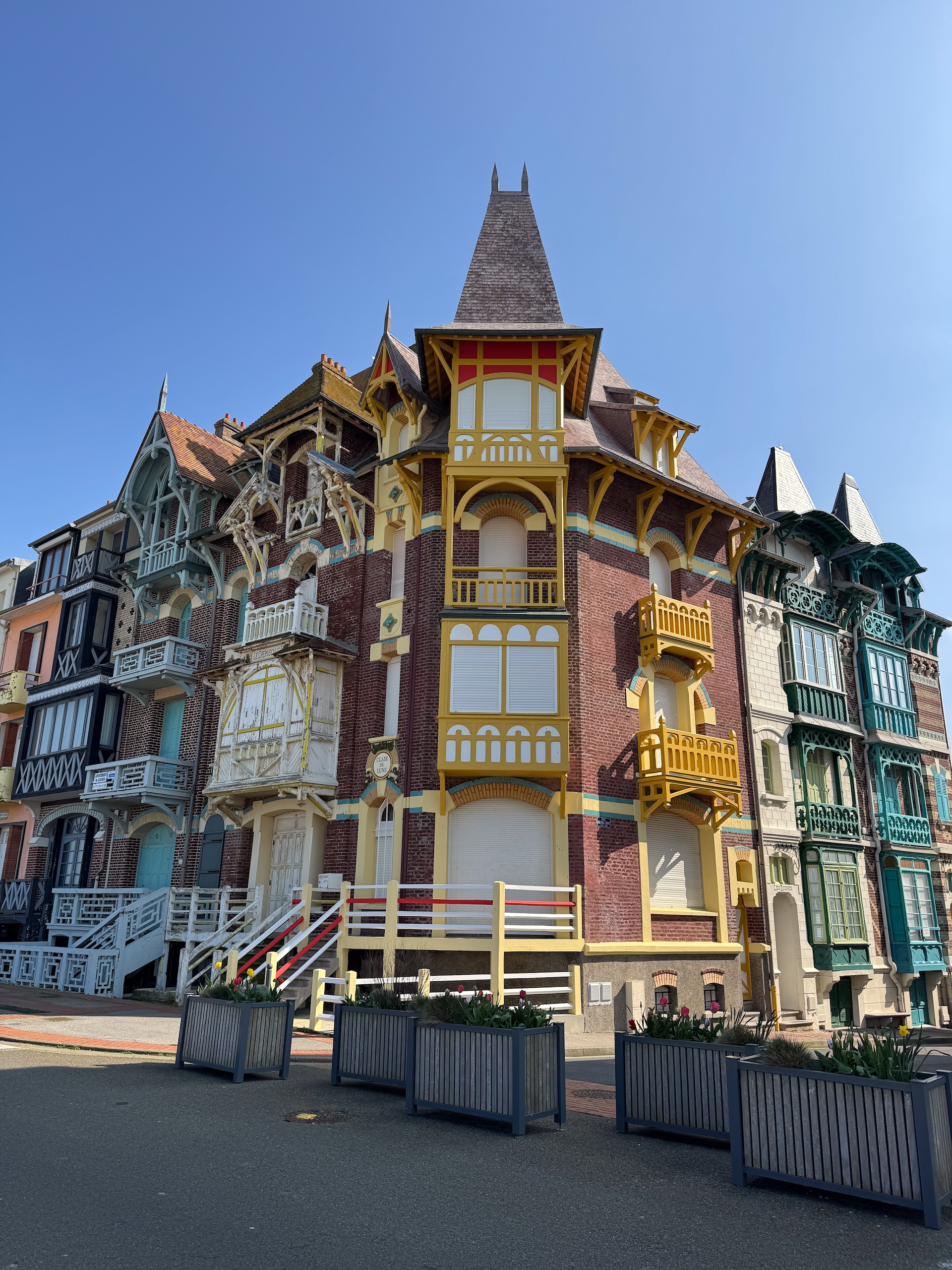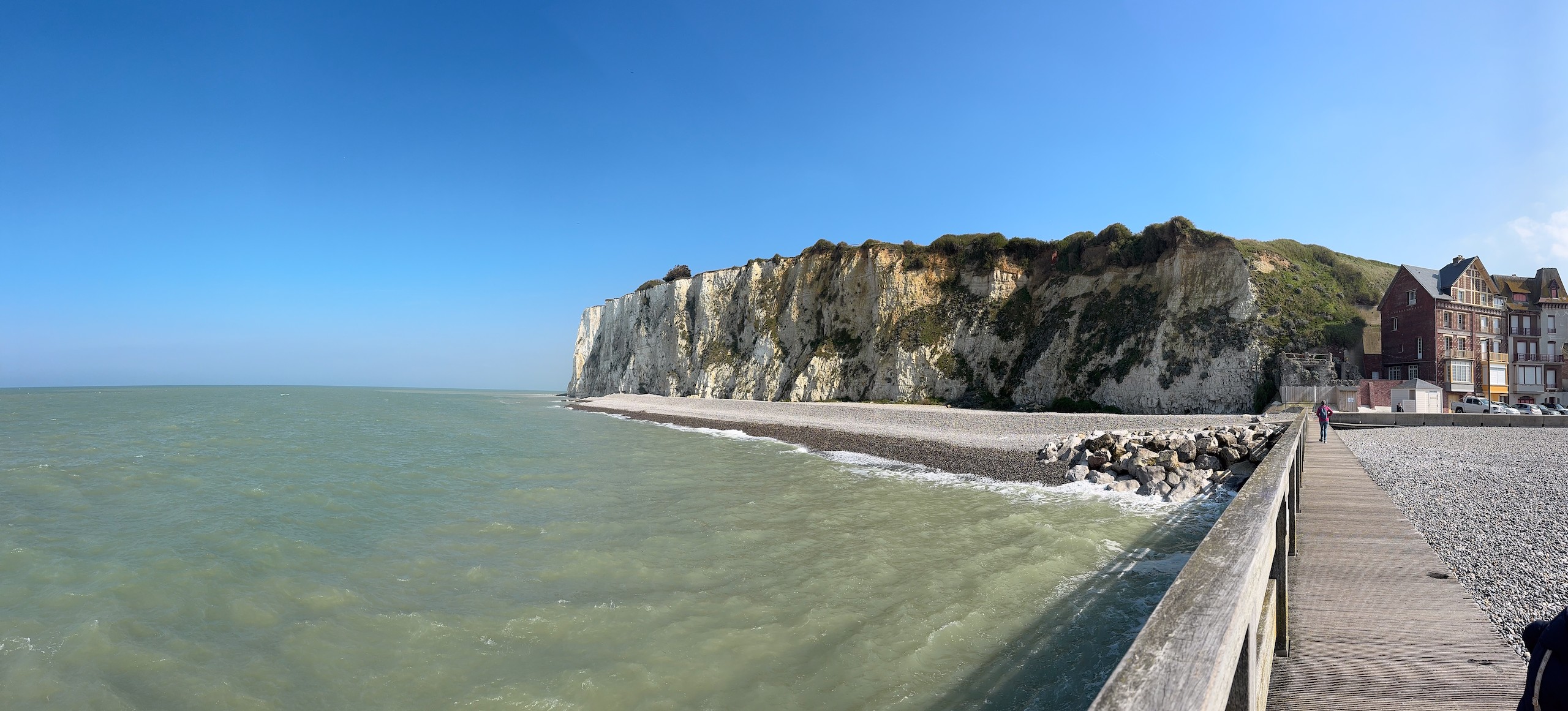 Auch wenn die Sonne scheint, ist es durch den kräftigen Wind heute relativ frisch. Aber das macht uns nichts und so gehen wir auf die andere Seite der Bresle, die hier ins Meer mündet. Der Ort hier heisst Mers-les-Bains und besticht durch seine prächtigen Strandvillen aus der Belle Epoche und Jugendstil. Reich verzierte Holzhäuser in bunten Farben und mit jeder Menge Balkonen und Erkern.