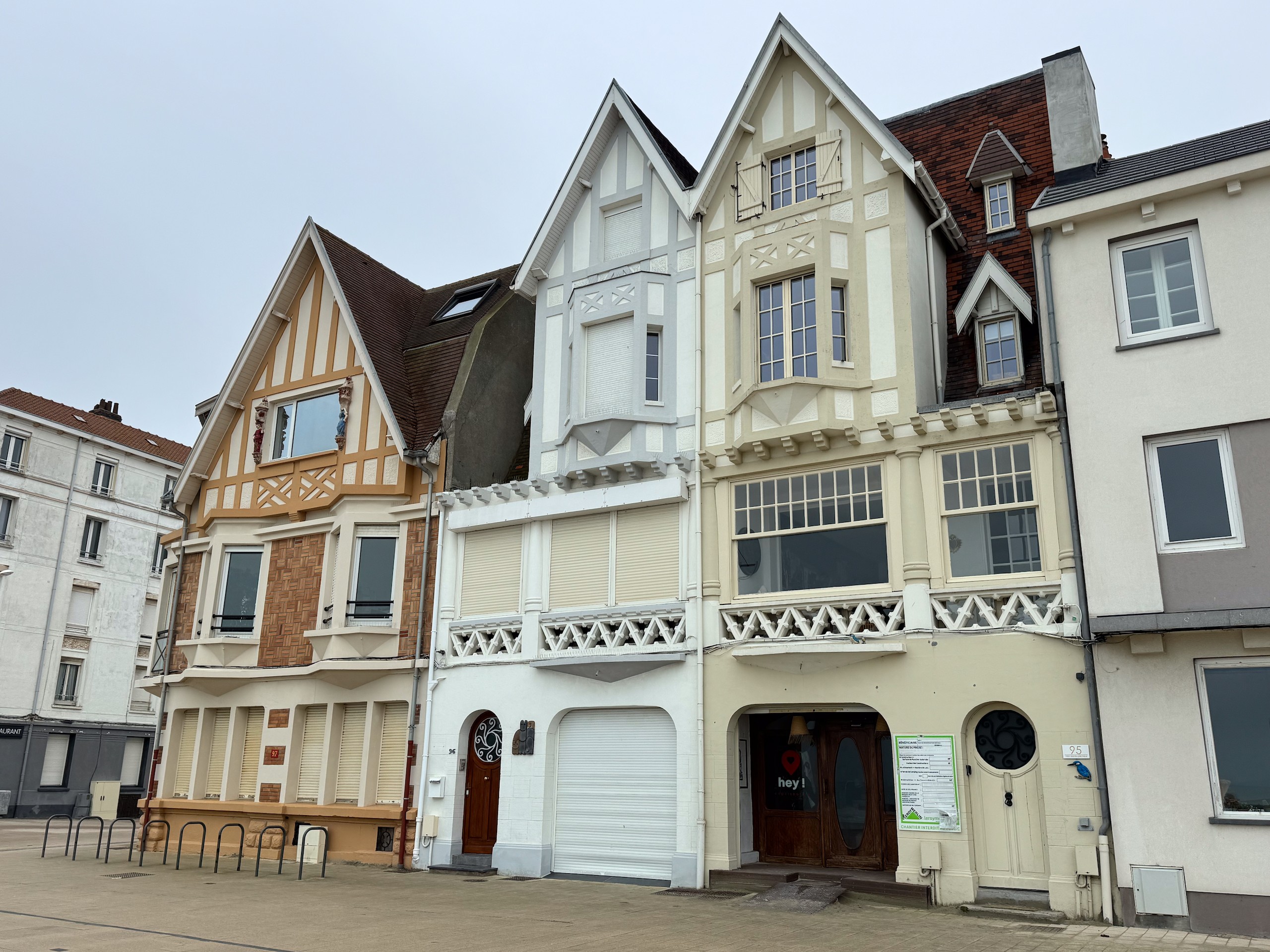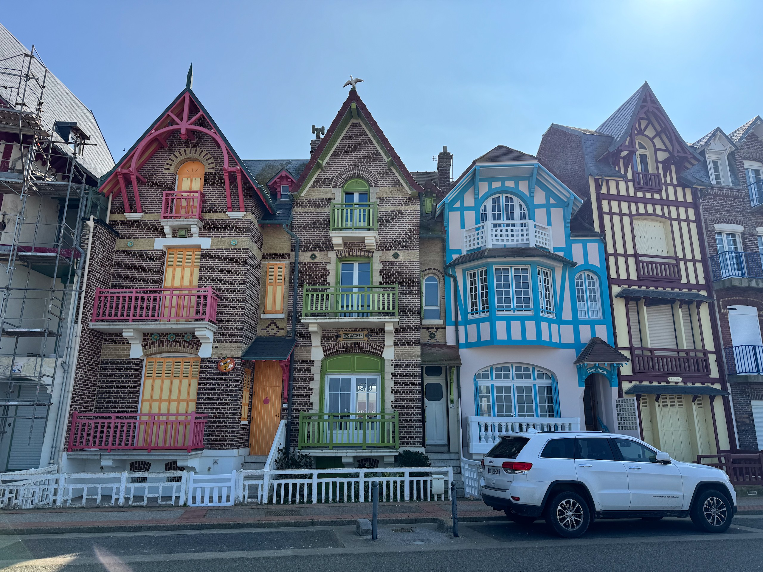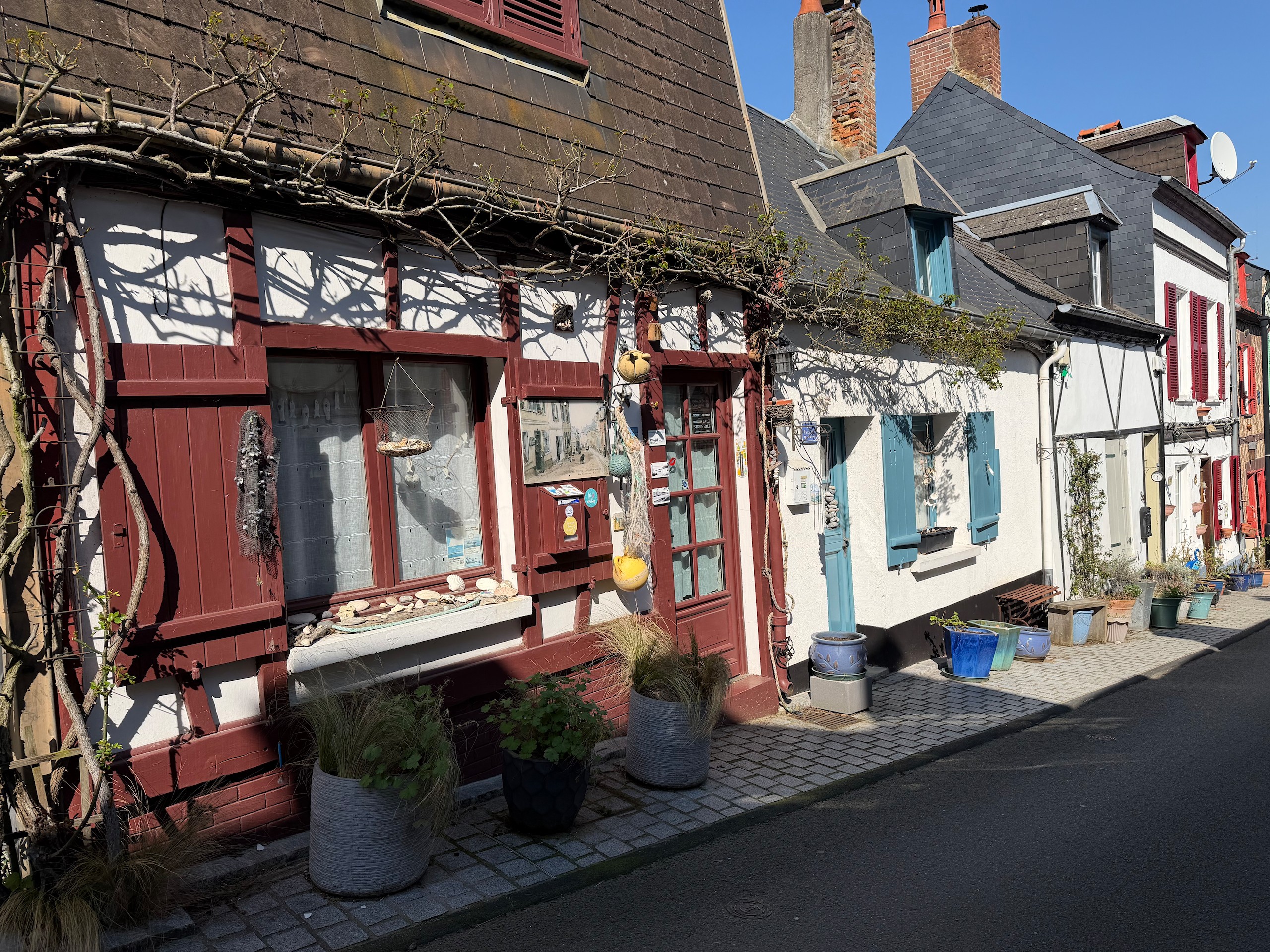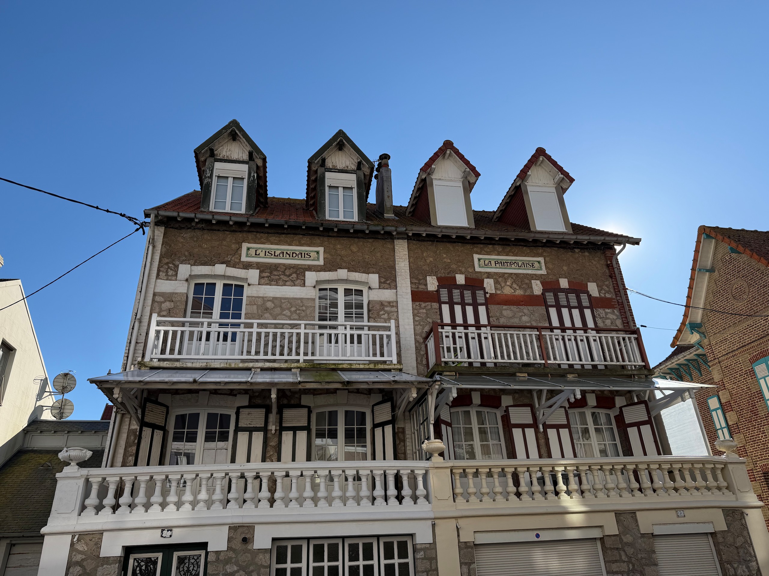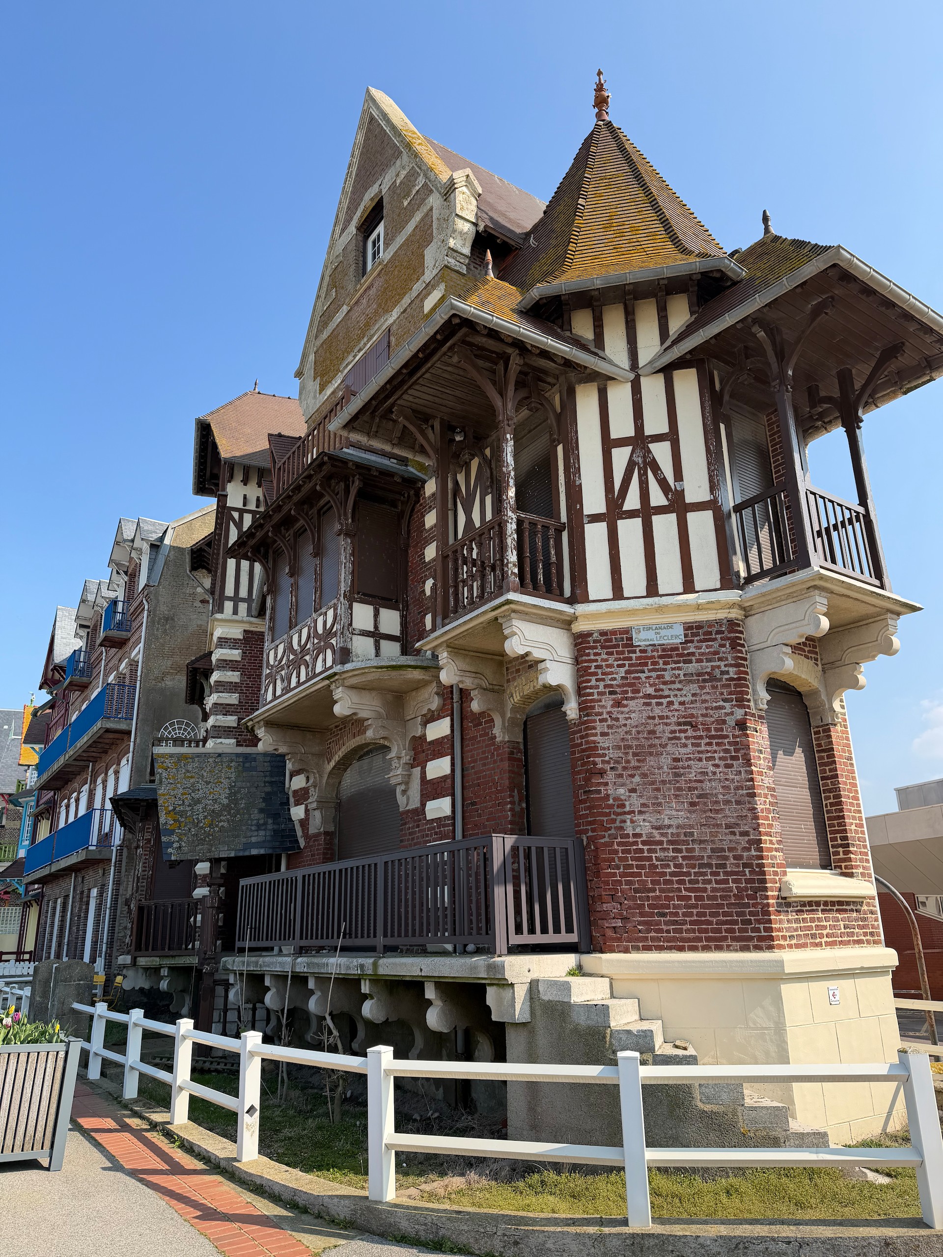 Auch wenn die Sonne scheint, ist es durch den kräftigen Wind heute relativ frisch. Aber das macht uns nichts und so gehen wir auf die andere Seite der Bresle, die hier ins Meer mündet. Der Ort hier heisst Mers-les-Bains und besticht durch seine prächtigen Strandvillen aus der Belle Epoche und Jugendstil. Reich verzierte Holzhäuser in bunten Farben und mit jeder Menge Balkonen und Erkern.
