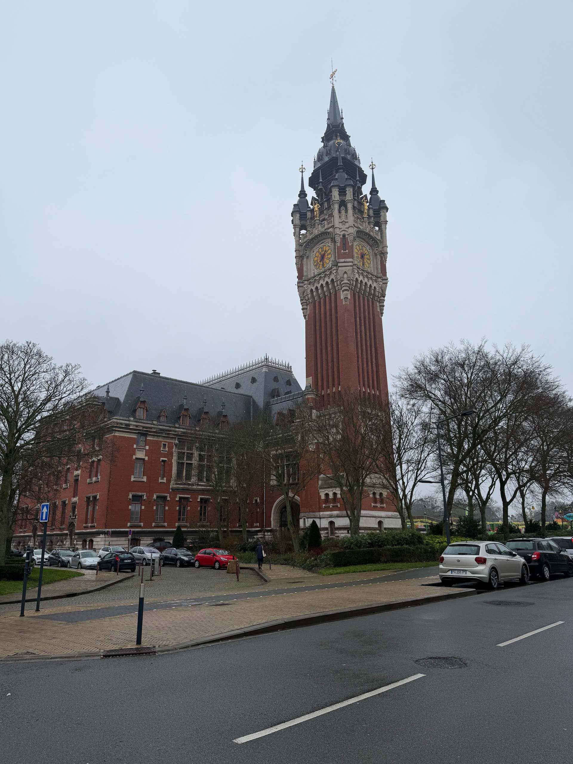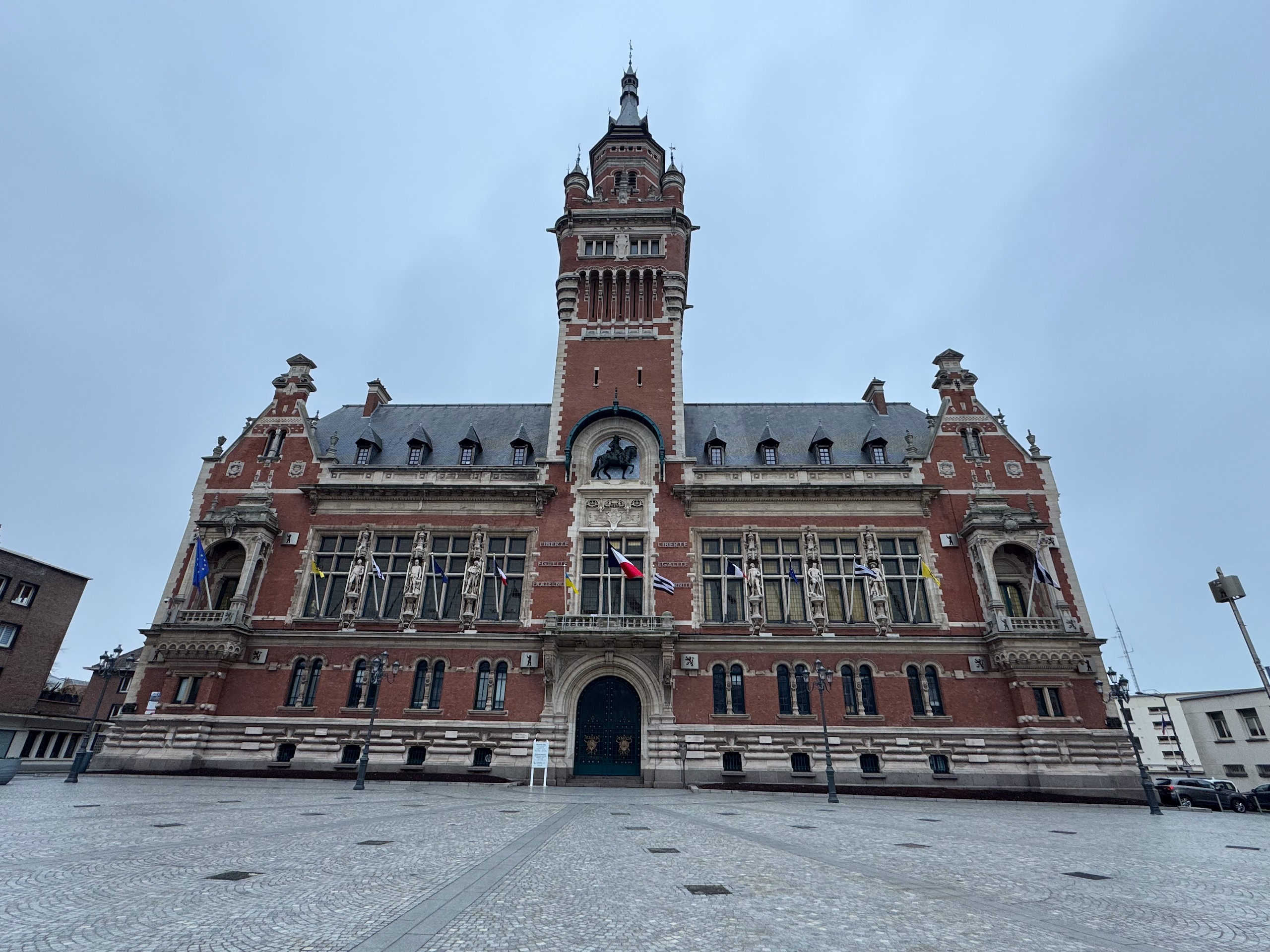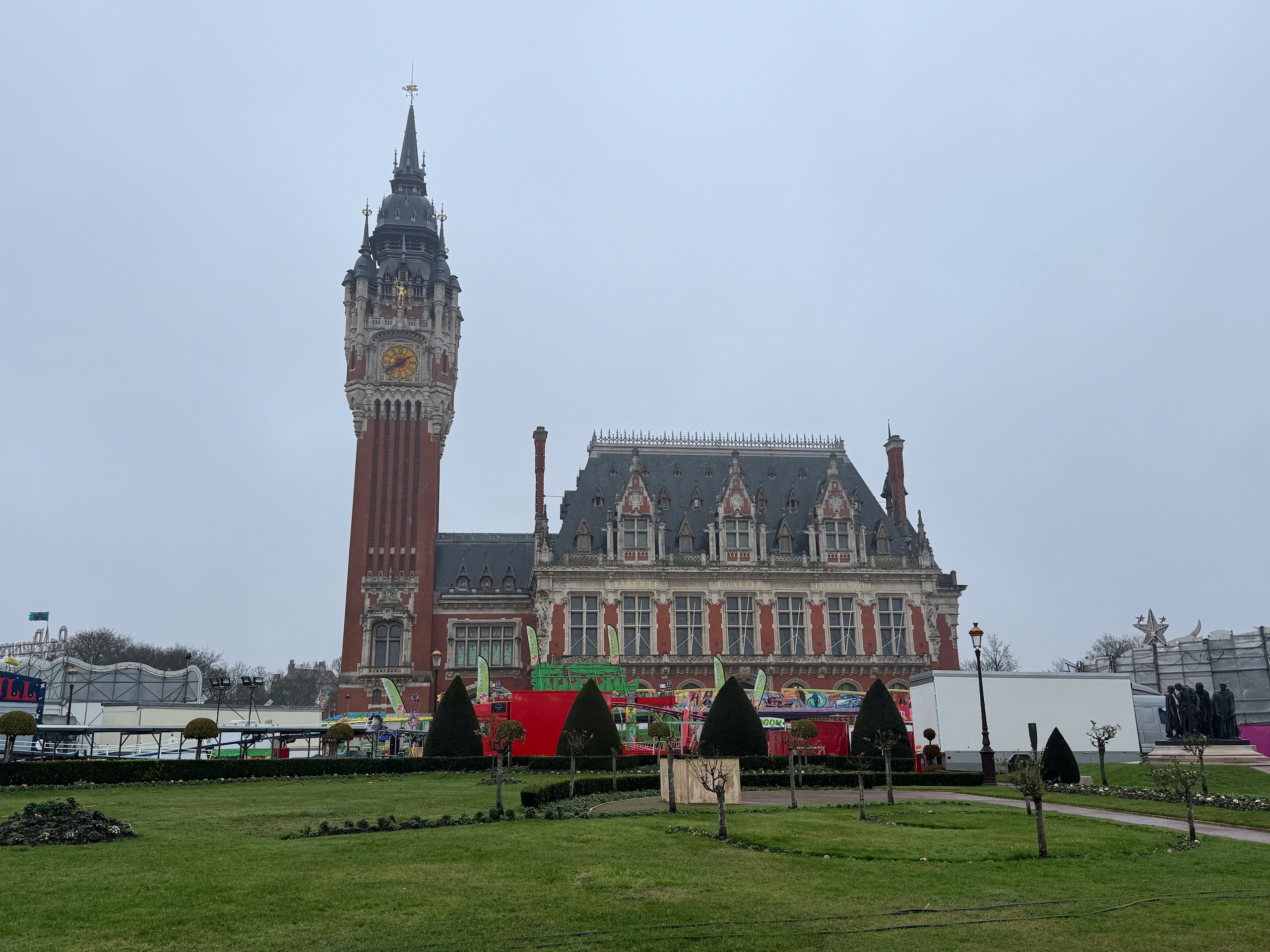 Heute morgen geht es weiter ins ca. 45 km entfernte Calais und hier fahren wir den etwas außerhalb gelegenen Camping Car Park an. Die Wetteraussichten für heute sind ausgesprochen schlecht. Grau mit jeder Menge Regen. Aber wir packen uns warm ein, schnappen uns unsere Schirme und laufen Richtung Zentrum. Einen Abstecher zum Strand sparen wir uns bei dem Wetter und so klappern wir nur ein paar naheliegende Sehenswürdigkeiten ab, wie z.B. diverse Statuen mit Charles de Gaulle, verschiedene Streetartbilder und nicht zu vergessen das auffällige Rathausgebäude. Leider befindet sich auf dem Vorplatz zur Zeit eine Kirmes, so dass man keinen freien Blick auf das interessante Gebäude bekommt.