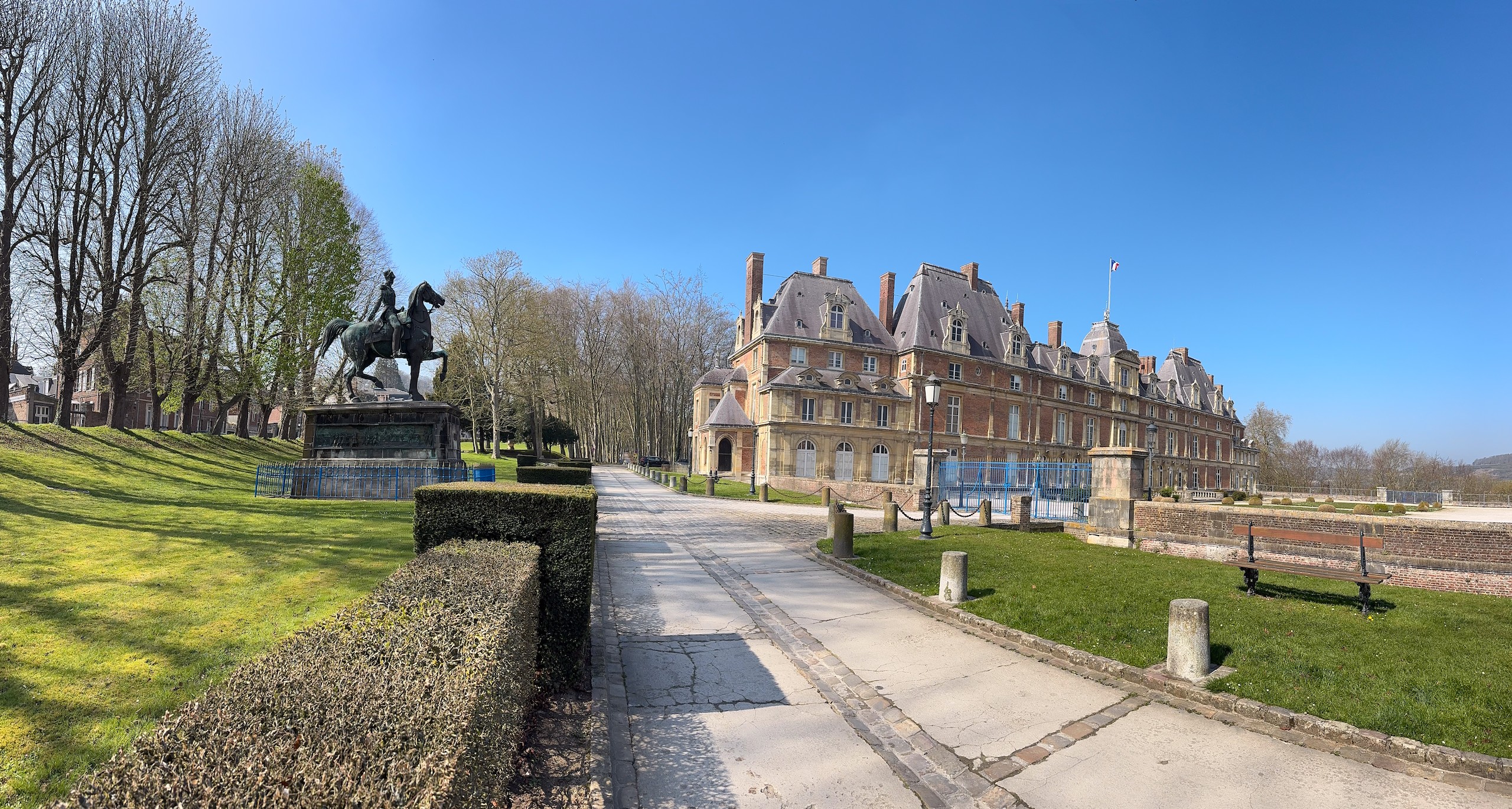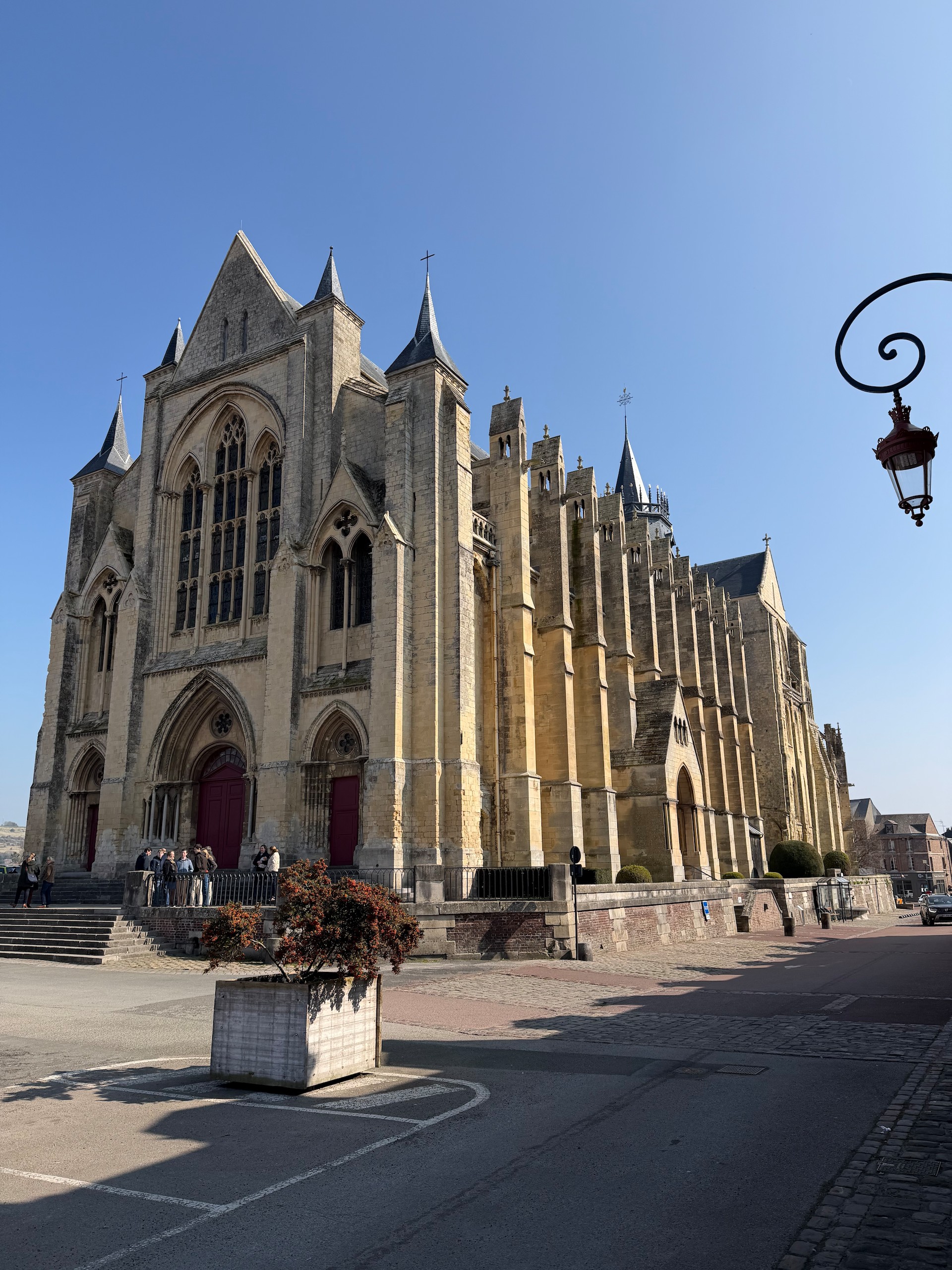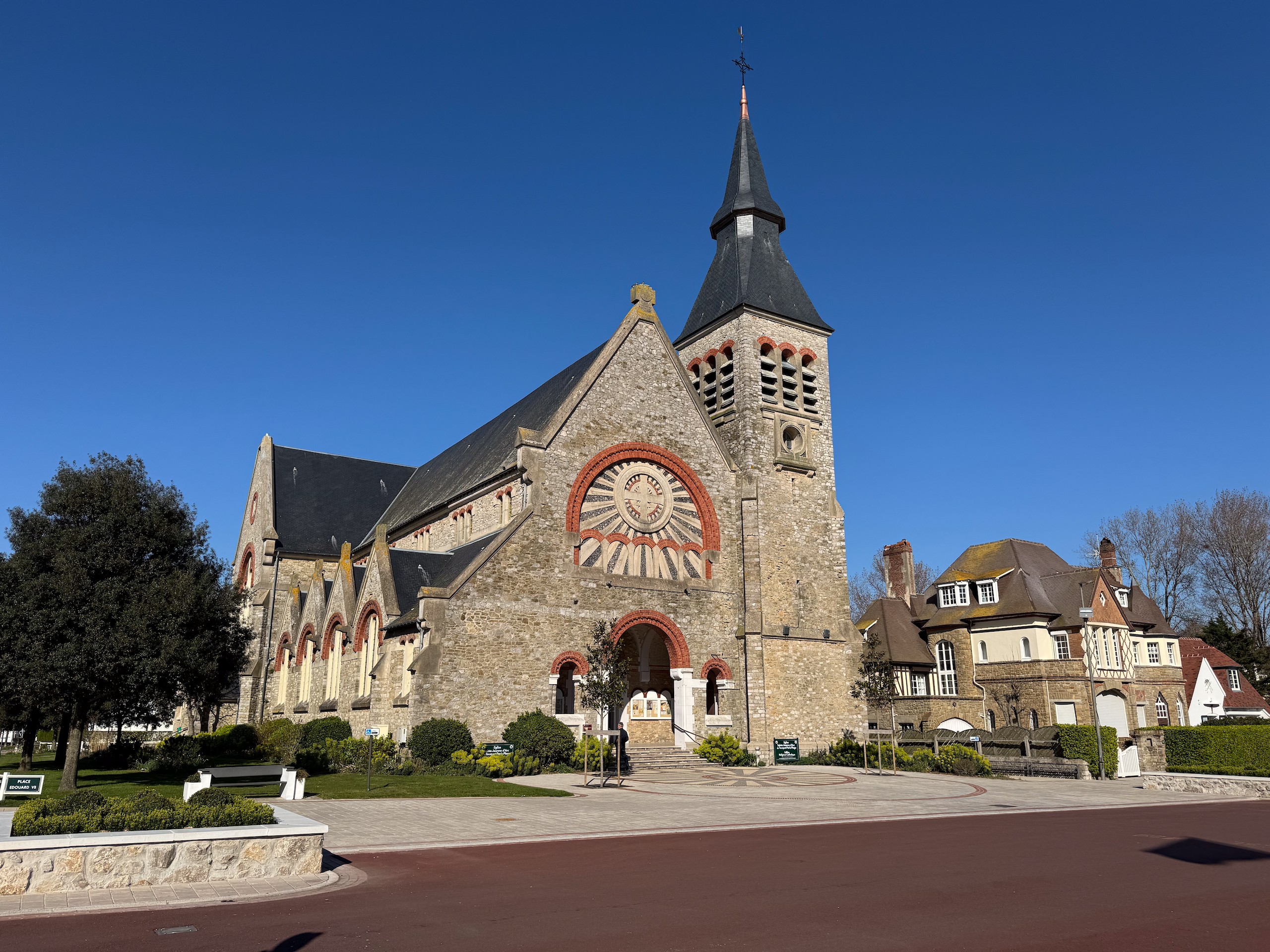Von hier aus führt der "Chemin Verre & Mer", ein Radweg, über zirka 18 Kilometer Länge bis Le Treport. Dahin wollen wir zwar nicht mehr, aber wir suchen uns über unsere App "Fietsknoop" eine Route, die uns teilweise über diesen toll gemachten Radweg führt. Wir wollen aber nur bis Eu, eine kleine Stadt mit Schloss und großer Kirche. Leider ist diese Stiftskirche Notre-Dame et Saint-Laurent erst ab 14.00 Uhr geöffnet, so können wir nur die Aussenansicht genießen. Hier hat 1050 Wilhelm der Eroberer seine Frau Mathilde von Flandern geheiratet. Wir drehen noch eine kurze Spazierrunde durch den Schlosspark und fahren dann unsere Radroute weiter.