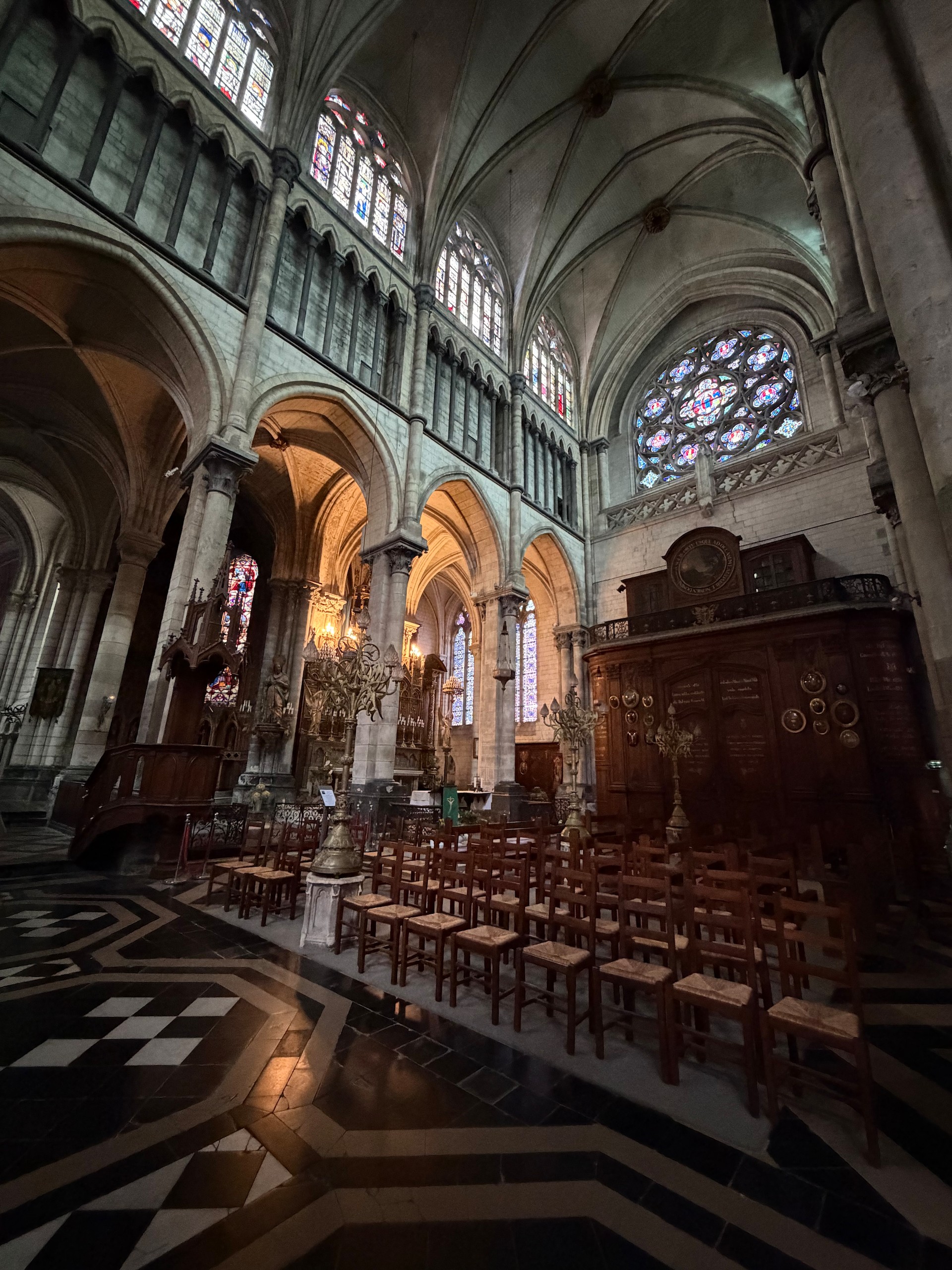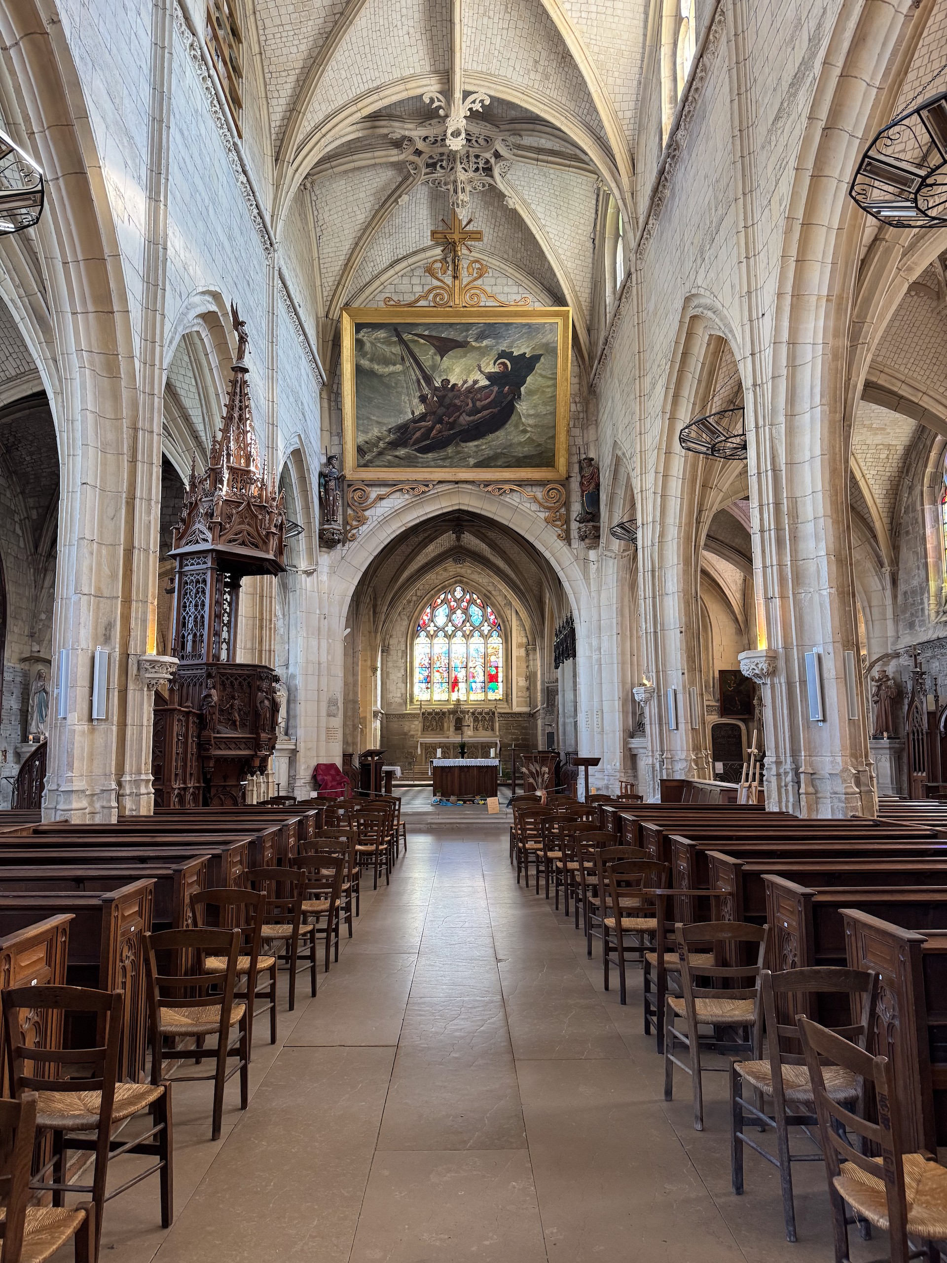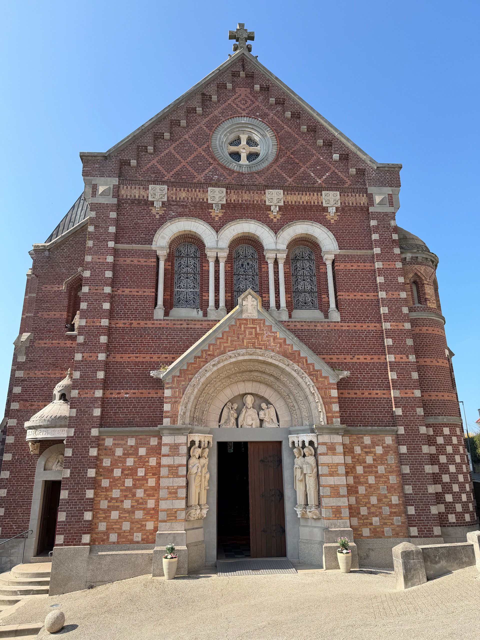 Von hier aus führt der "Chemin Verre & Mer", ein Radweg, über zirka 18 Kilometer Länge bis Le Treport. Dahin wollen wir zwar nicht mehr, aber wir suchen uns über unsere App "Fietsknoop" eine Route, die uns teilweise über diesen toll gemachten Radweg führt. Wir wollen aber nur bis Eu, eine kleine Stadt mit Schloss und großer Kirche. Leider ist diese Stiftskirche Notre-Dame et Saint-Laurent erst ab 14.00 Uhr geöffnet, so können wir nur die Aussenansicht genießen. Hier hat 1050 Wilhelm der Eroberer seine Frau Mathilde von Flandern geheiratet. Wir drehen noch eine kurze Spazierrunde durch den Schlosspark und fahren dann unsere Radroute weiter.