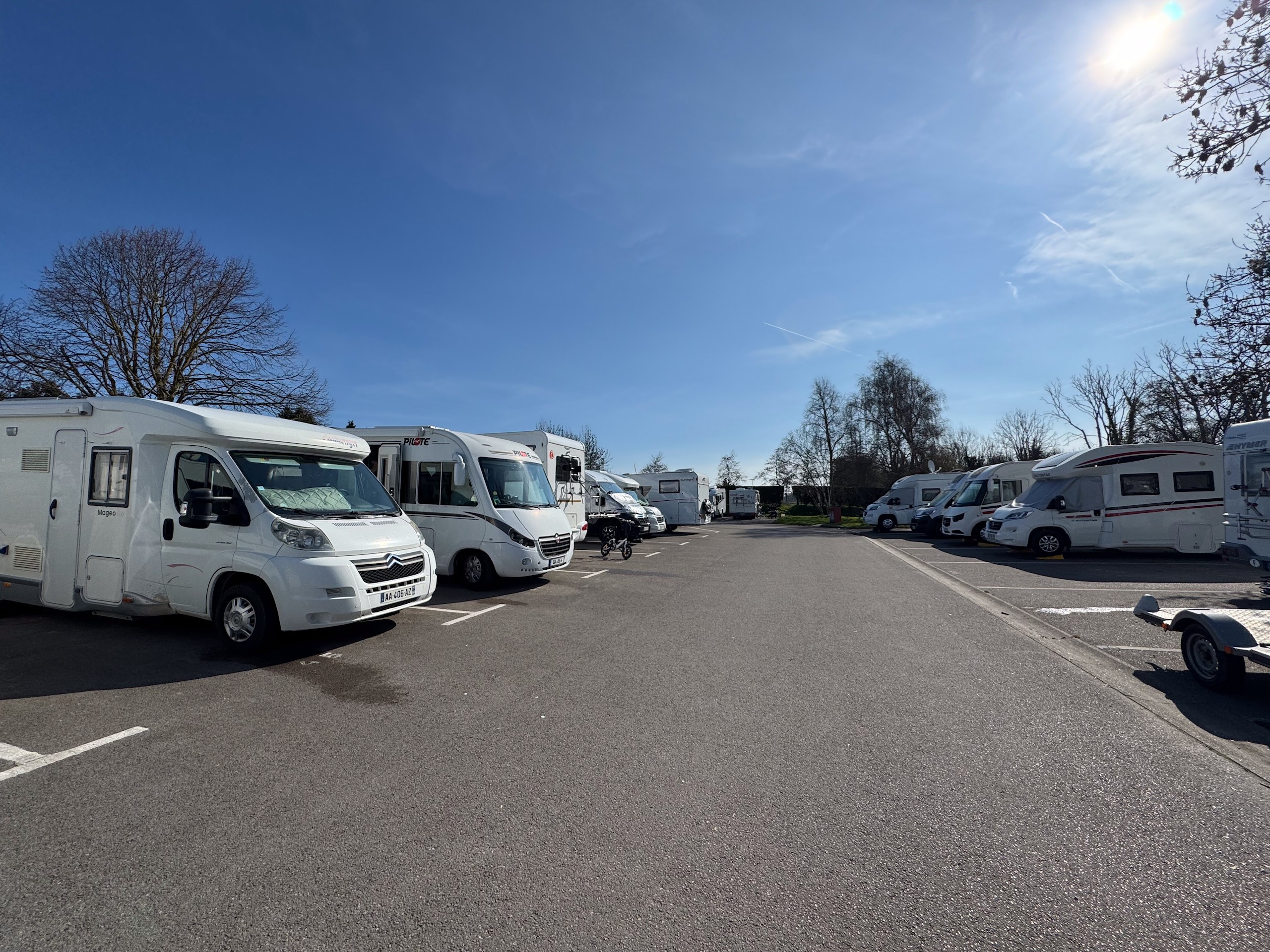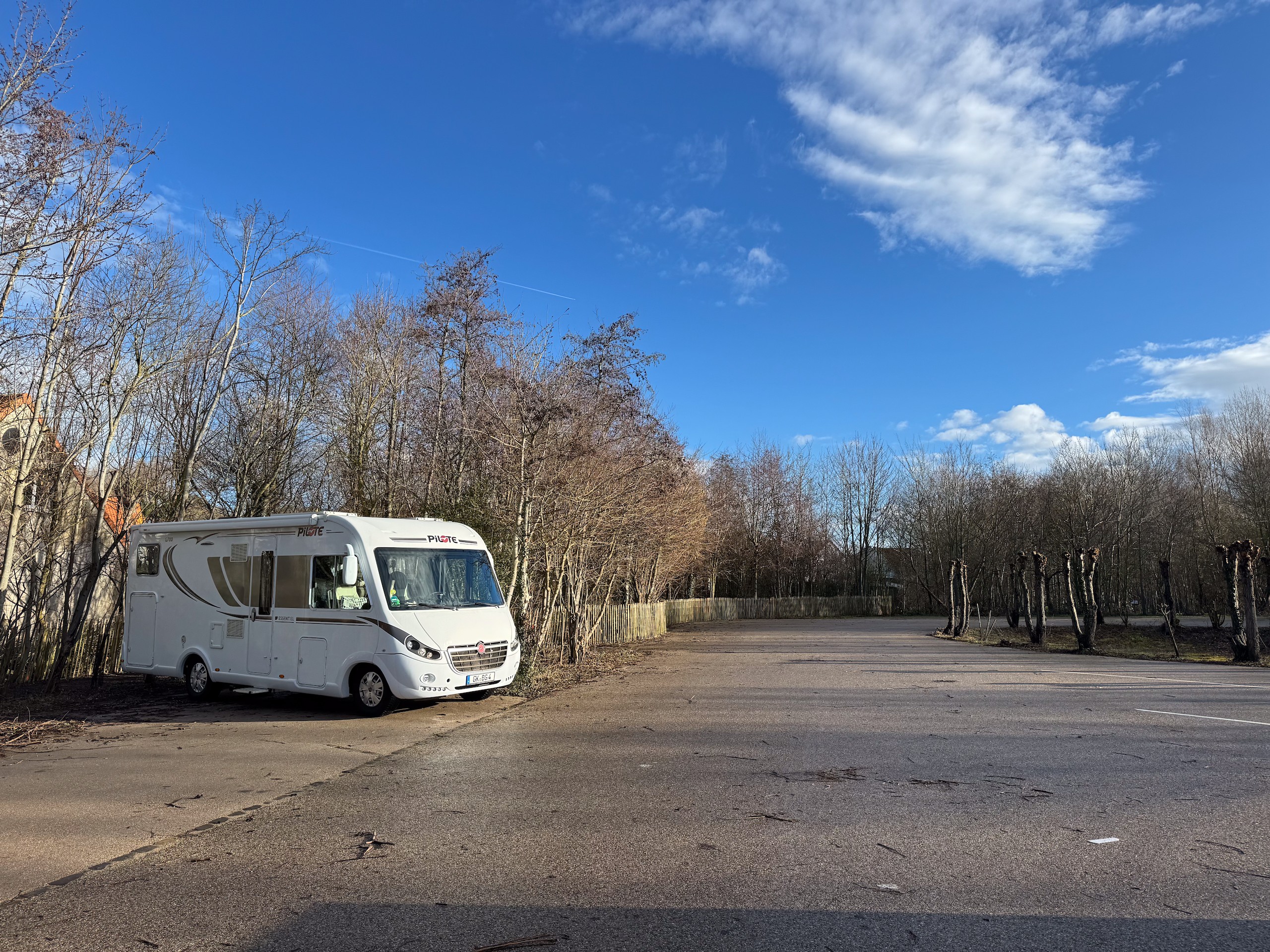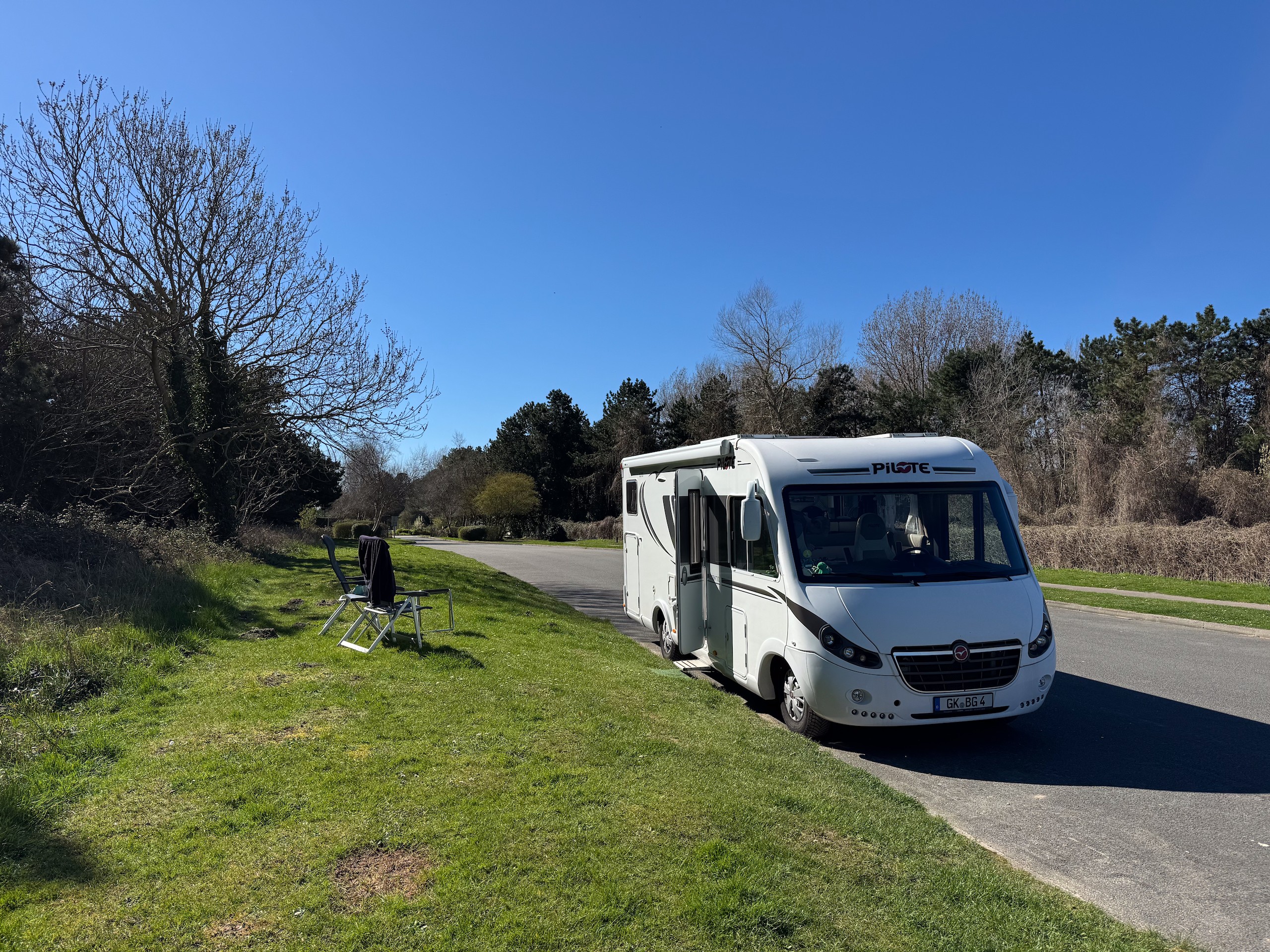 Weiter geht es mit einem kurzen Zwischenstopp bei Lidl zum nächsten Stellplatz in Av. de Berlin am Yachthafen von Le Touquet-Paris-Plage. Auf dem Weg dorthin fallen die vielen tollen Villen auf, viele davon mit Reetdächern. Alles sehr nobel mit viel Wald und Rad- und Fußwegen. Unser Stellplatz ist an einem Straßenrand, die anderen mit Blick auf den Hafen reizen uns nicht. Hier ist es schön sonnig und Wiese haben wir auch.