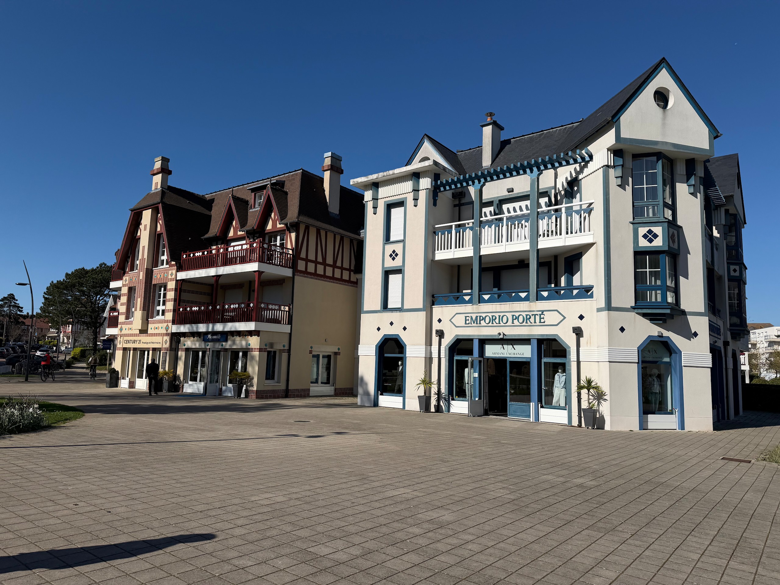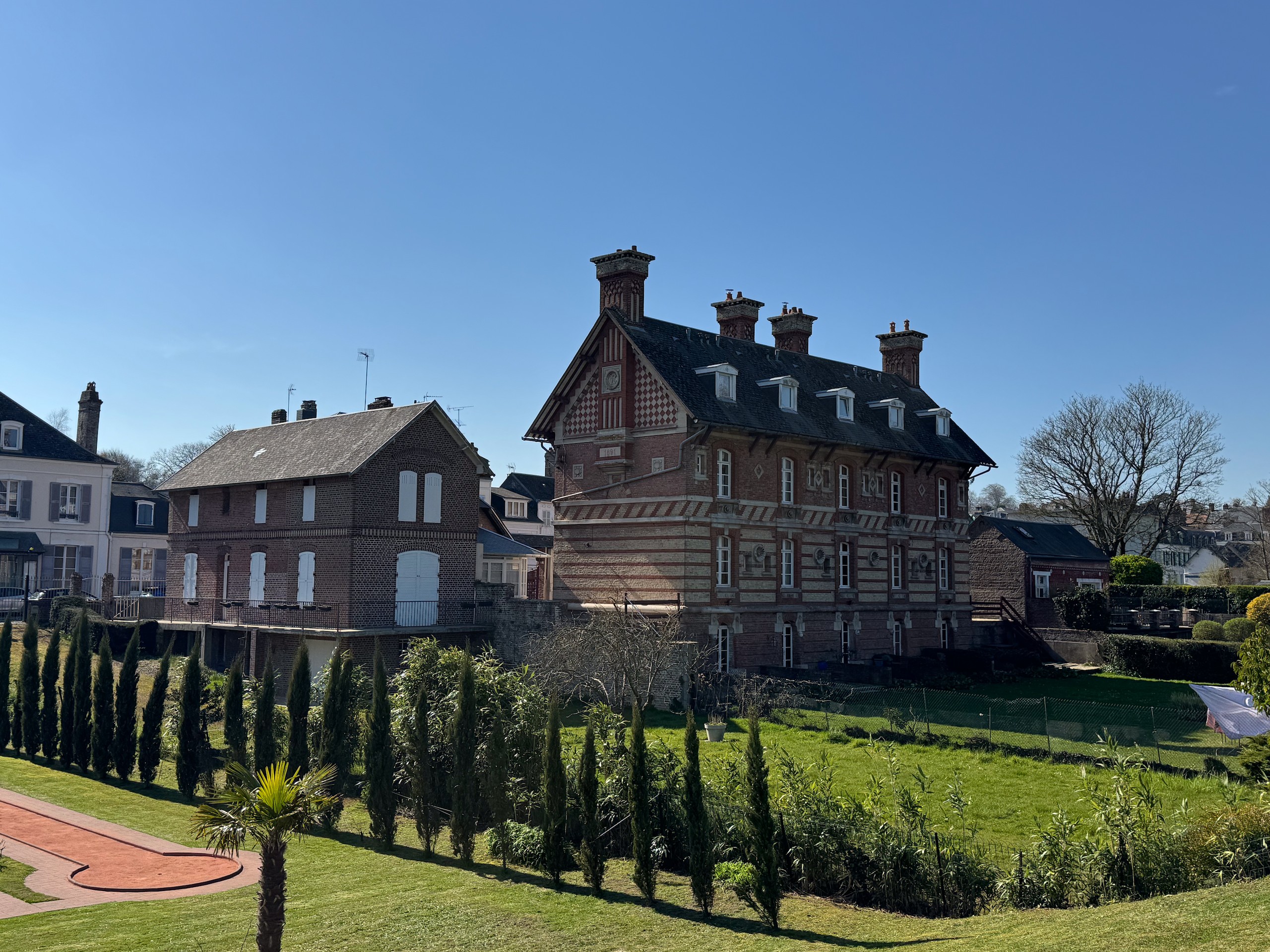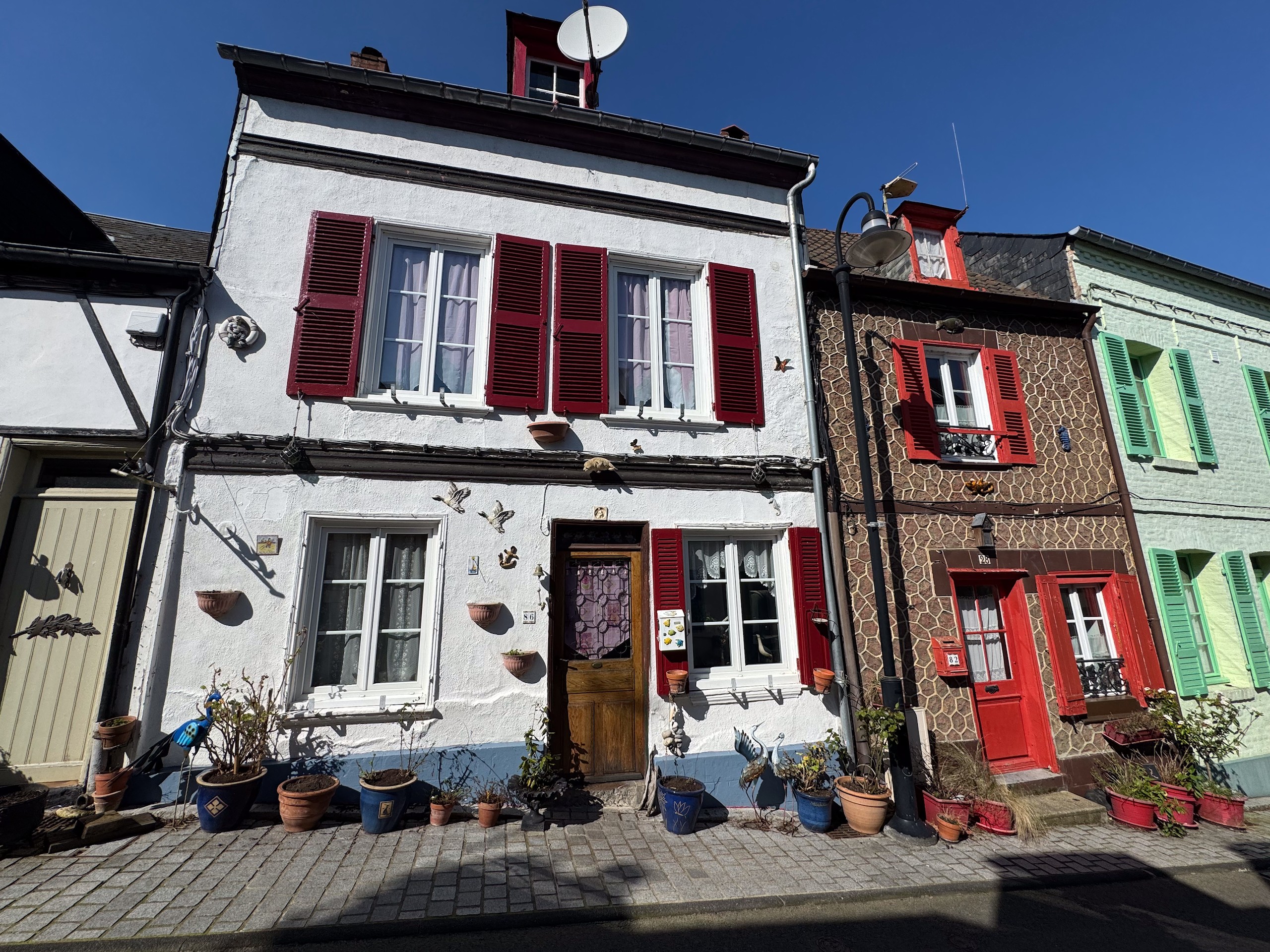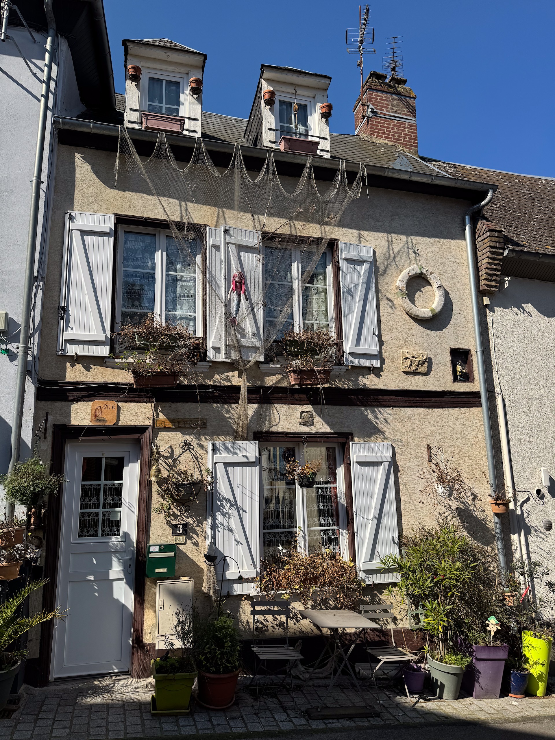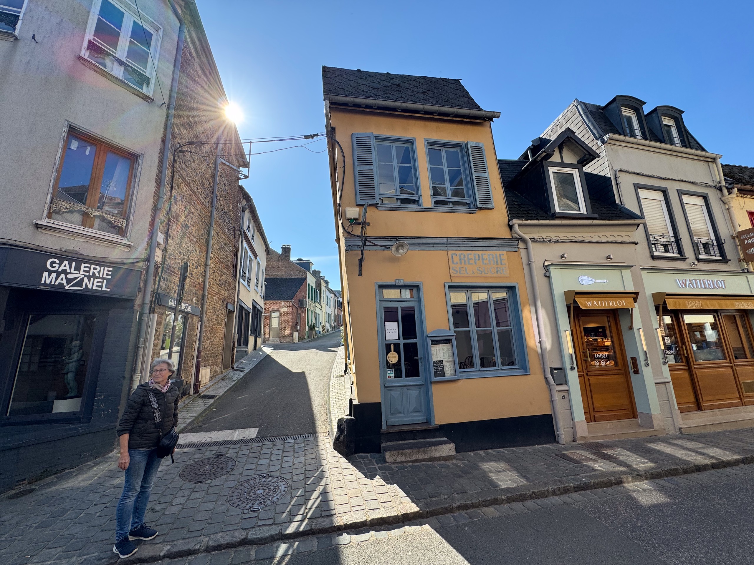 Zuerst machen wir eine Kaffeepause in der Sonne und dann machen wir uns auf eine zirka acht Kilometer lange Runde, die ich bei Komoot gefunden habe. Wir erreichen irgendwann das Zentrum und hier sieht man, dass der Ort wohl zur Sommerfrische der Pariser genutzt wird. Einige noble Geschäfte und Hotels sind hier zu finden. Aber besonders die alte Bebauung fällt auf. Zig Erker, Türmchen, Balkone, Fachwerk und alle möglichen anderen Verzierungen sind zu finden und kein Haus sieht aus, wie das andere. Viele alte Häuser wurden bereits aufwändig restauriert und erstrahlen in neuem Glanz.