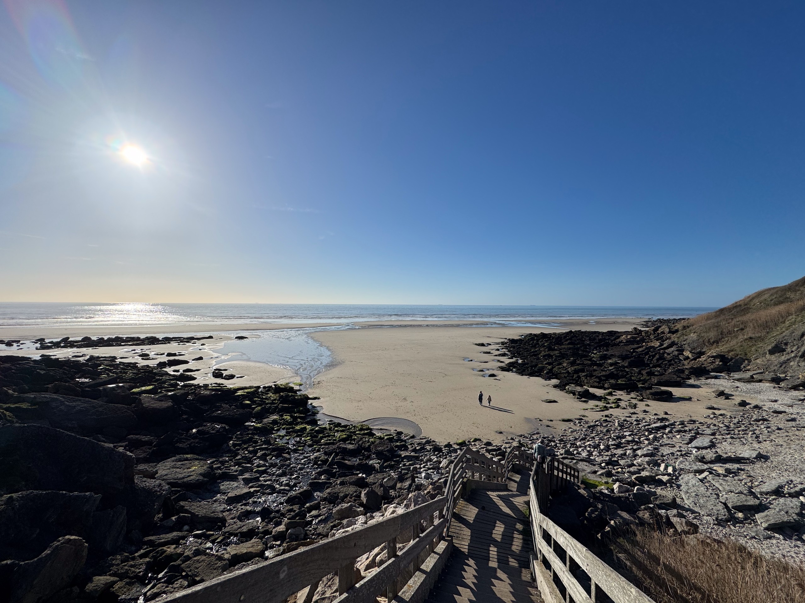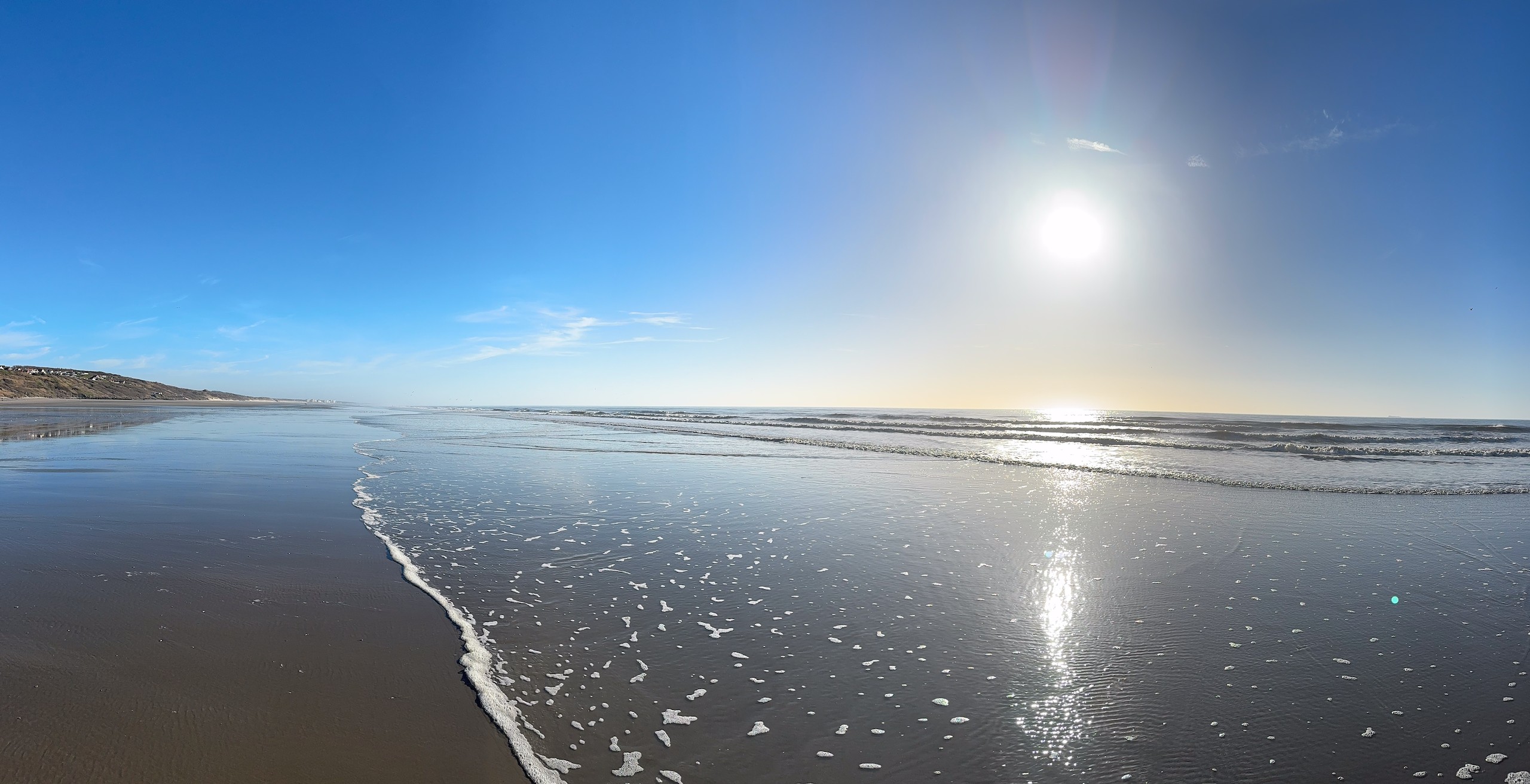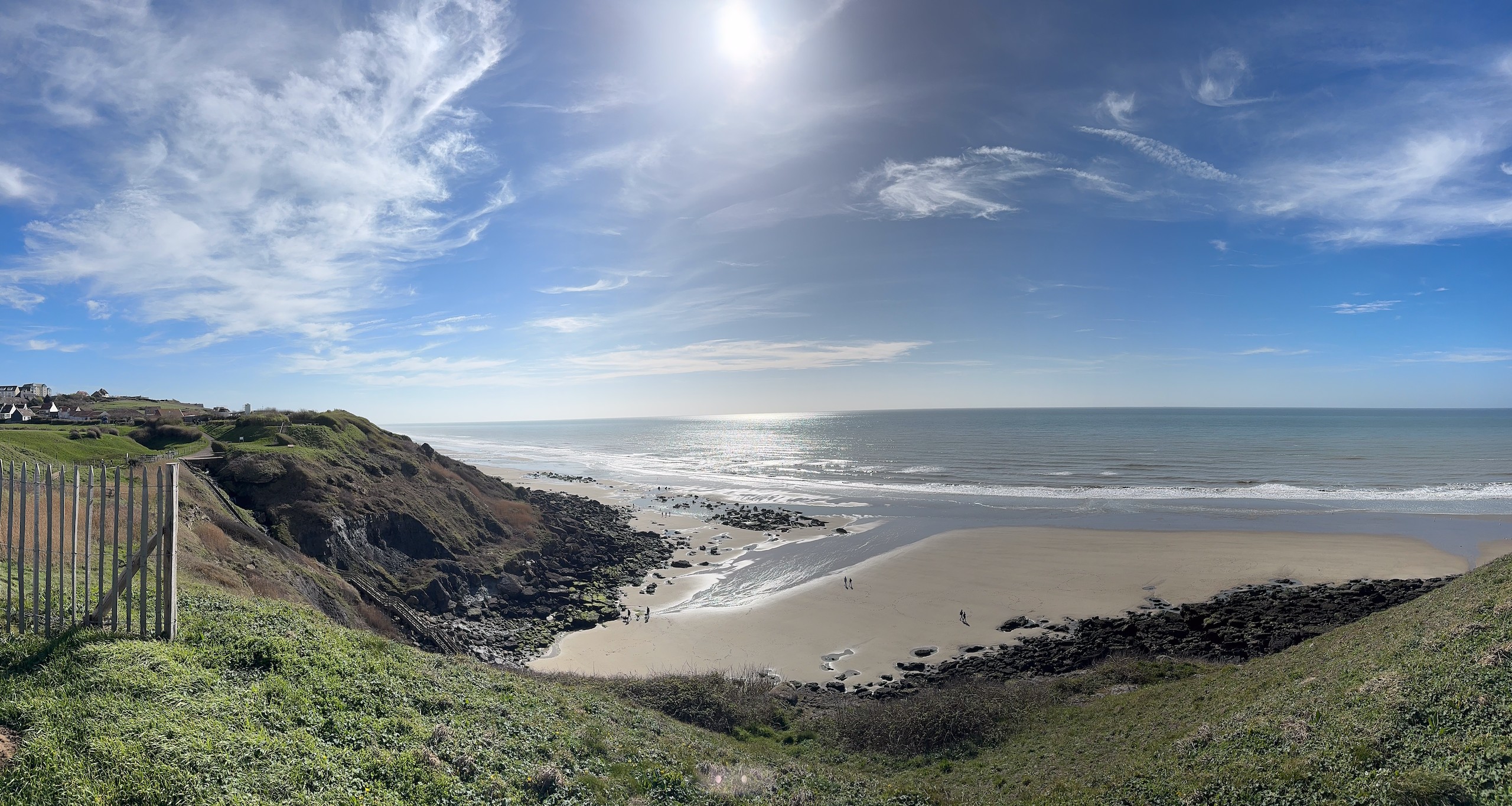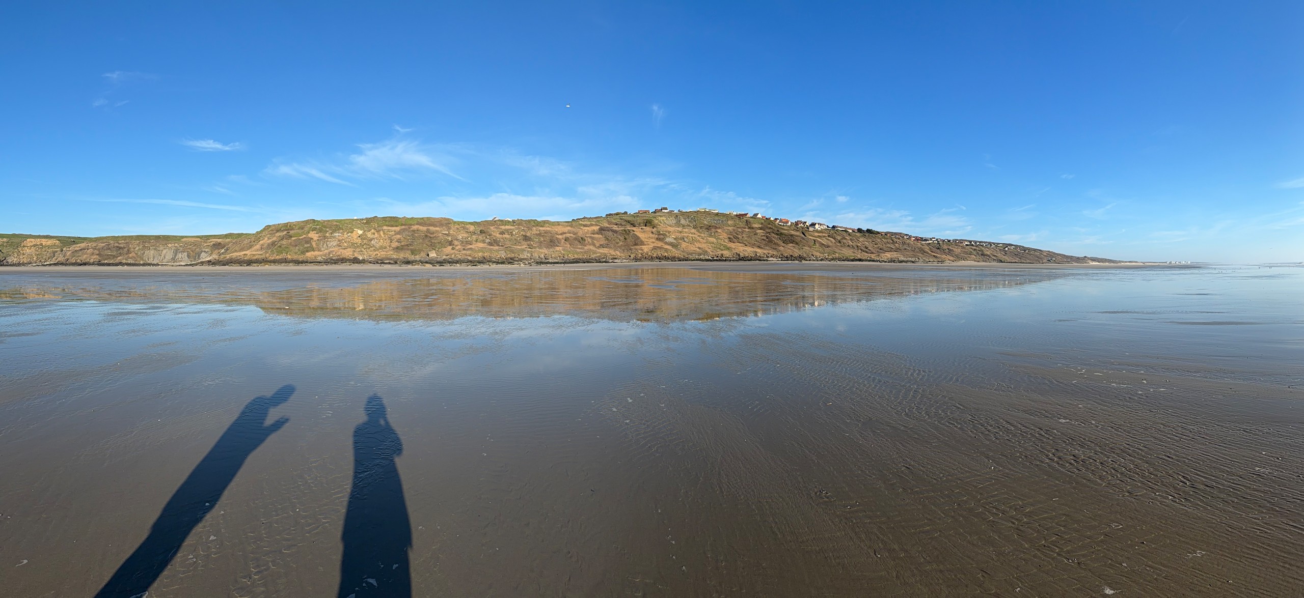 Aber bei dem traumhaften Wetter müssen wir einfach laufen. Die Promenade von Wissant ist ca. 1 km vom Stellplatz entfernt. Von hier hat man einen tollen Blick auf unser angepeiltes Ziel. Zunächst geht es am Meer entlang und da gerade erst aufkommende Flut ist, haben wir noch einen verhältnismäßig breiten Sandstrand. Unsere Apple Watches haben eine sehr nützliche Funktion, die uns die Gezeiten vor Ort anzeigt. Das ist sehr hilfreich, damit man nicht von der Flut überrascht wird.