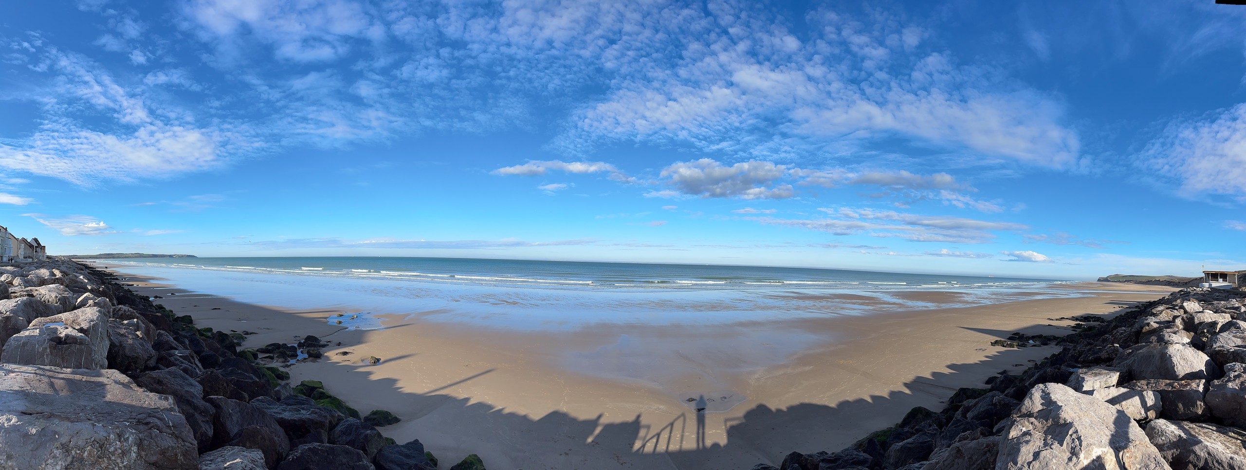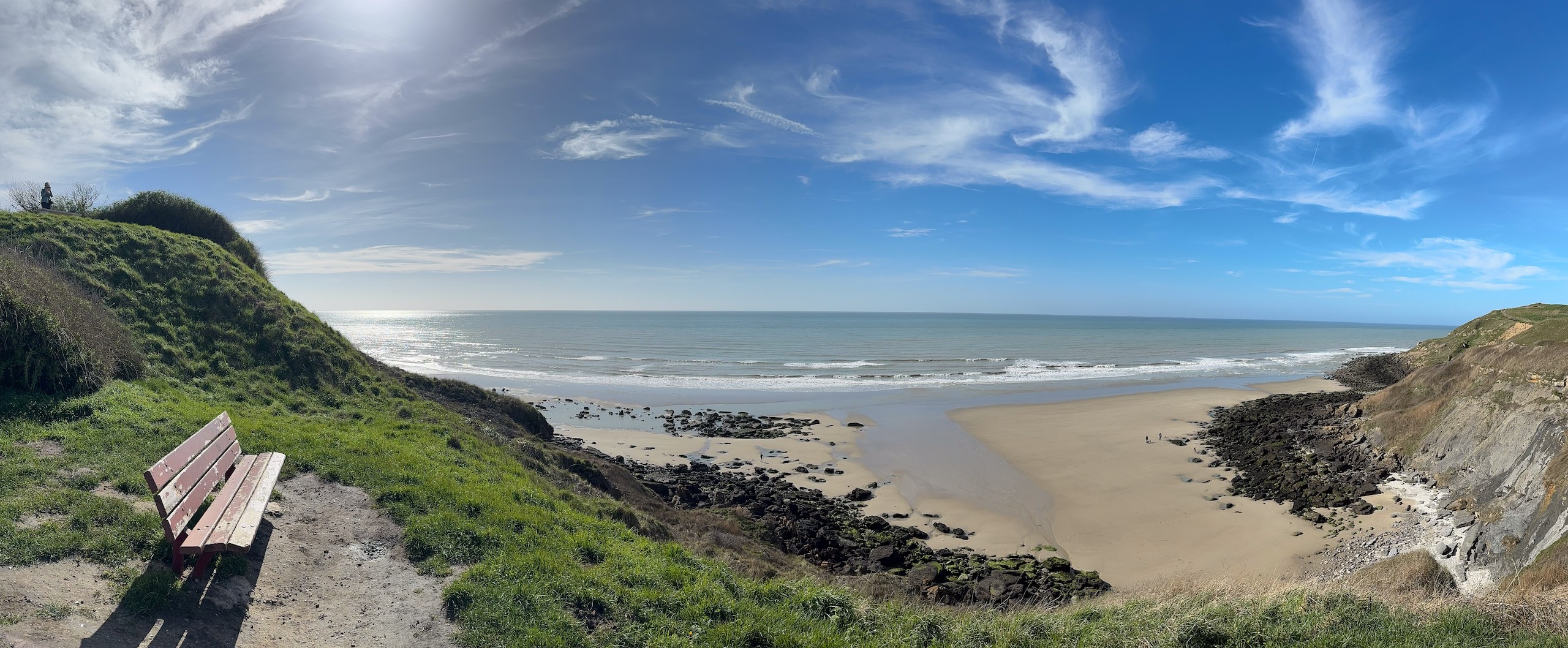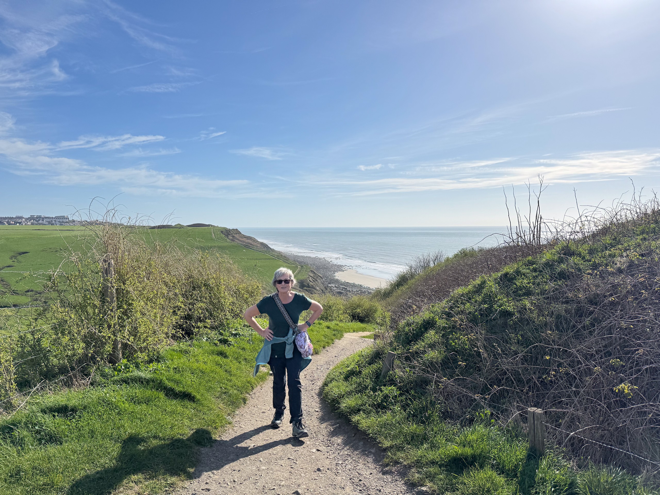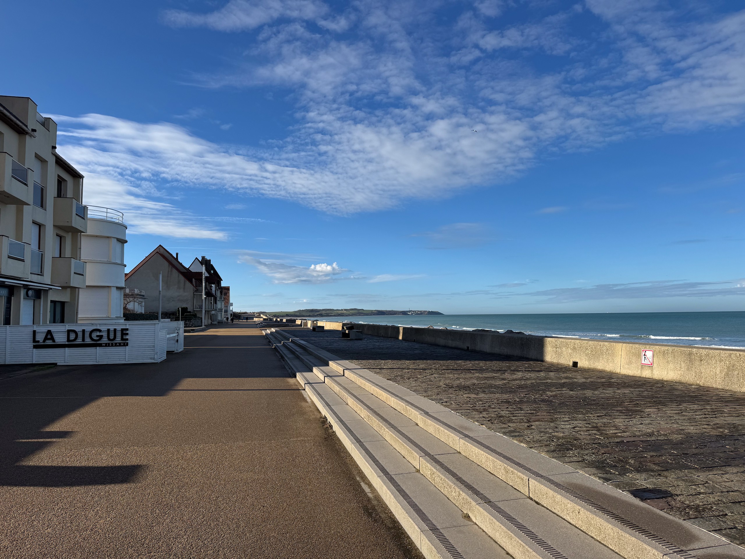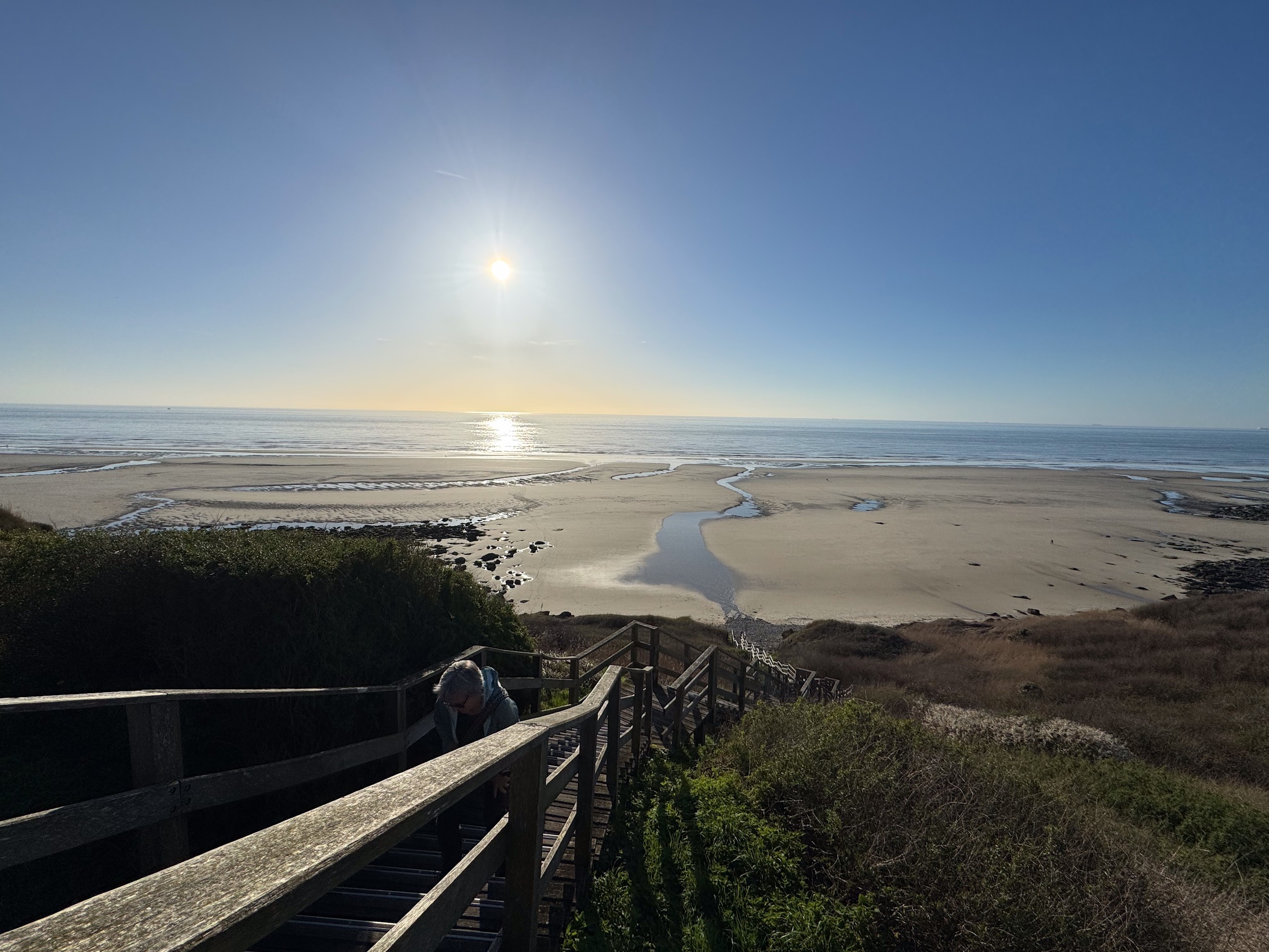 Aber bei dem traumhaften Wetter müssen wir einfach laufen. Die Promenade von Wissant ist ca. 1 km vom Stellplatz entfernt. Von hier hat man einen tollen Blick auf unser angepeiltes Ziel. Zunächst geht es am Meer entlang und da gerade erst aufkommende Flut ist, haben wir noch einen verhältnismäßig breiten Sandstrand. Unsere Apple Watches haben eine sehr nützliche Funktion, die uns die Gezeiten vor Ort anzeigt. Das ist sehr hilfreich, damit man nicht von der Flut überrascht wird.