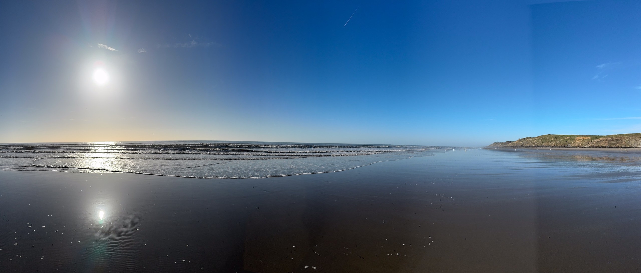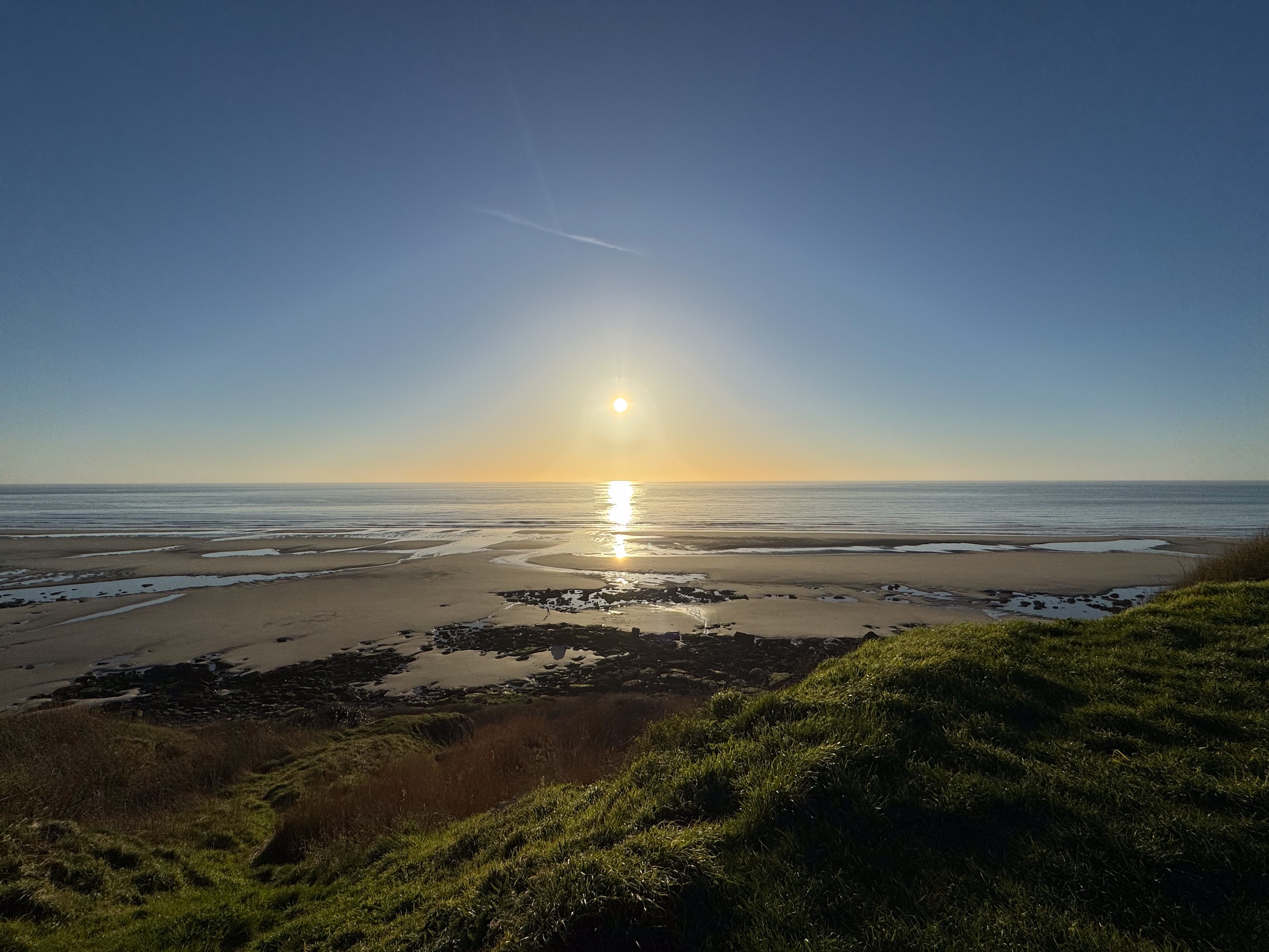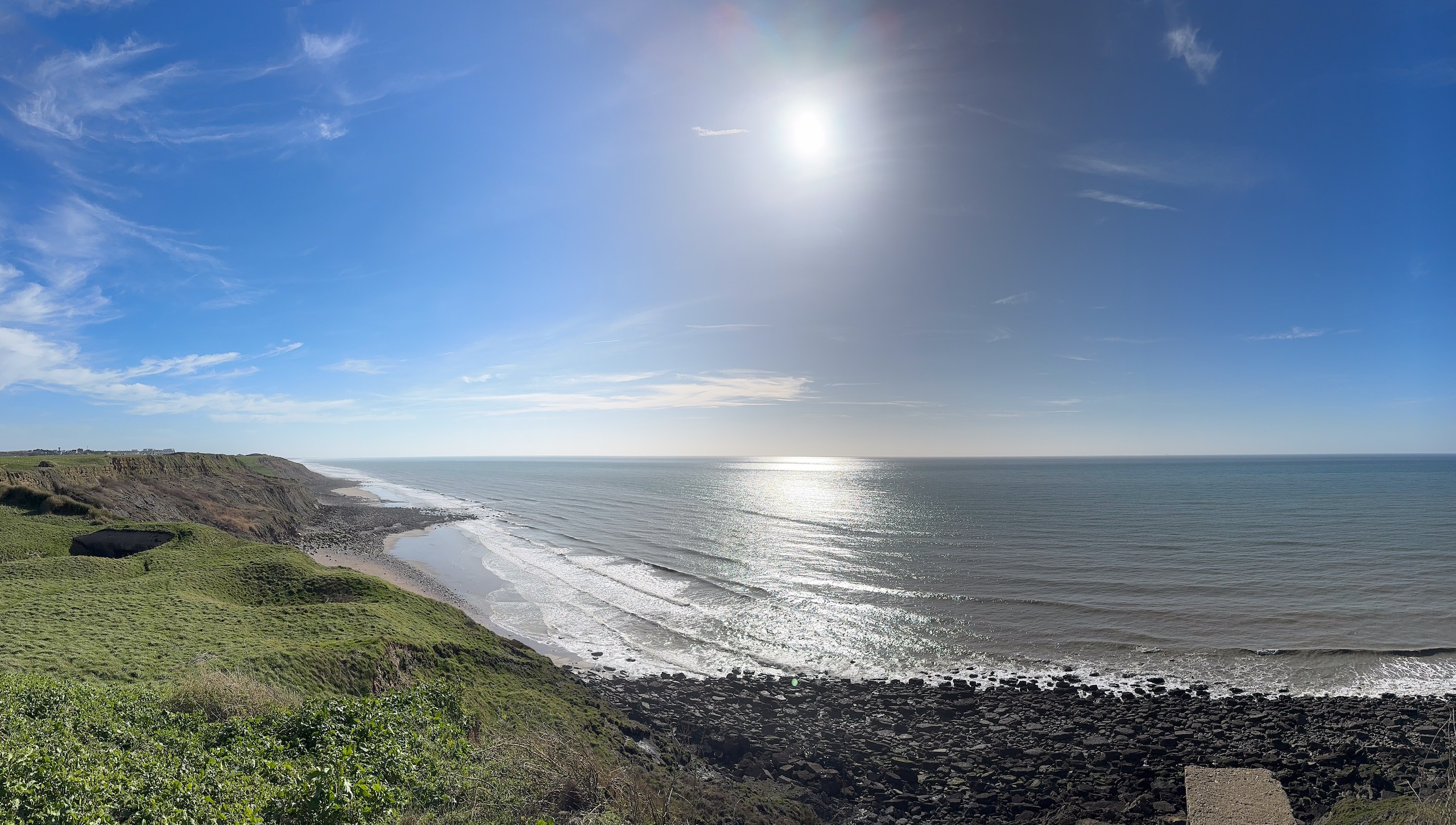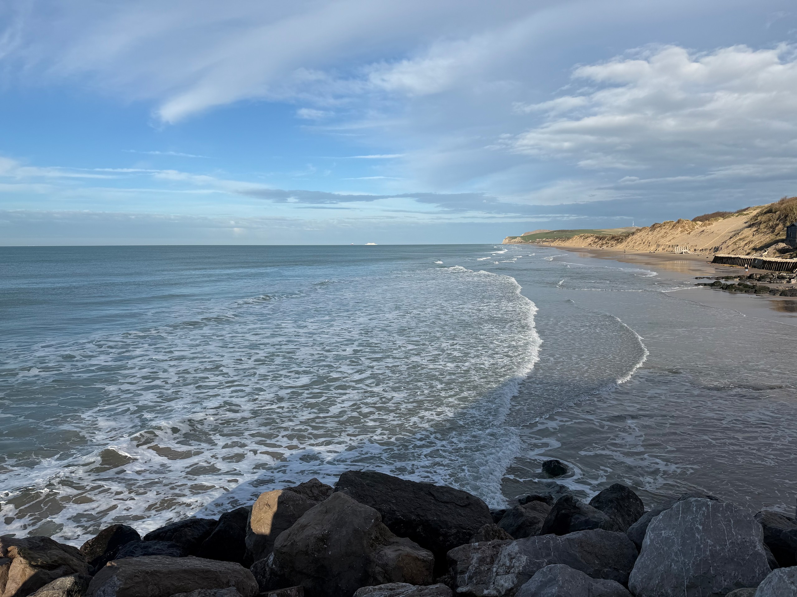 Aber bei dem traumhaften Wetter müssen wir einfach laufen. Die Promenade von Wissant ist ca. 1 km vom Stellplatz entfernt. Von hier hat man einen tollen Blick auf unser angepeiltes Ziel. Zunächst geht es am Meer entlang und da gerade erst aufkommende Flut ist, haben wir noch einen verhältnismäßig breiten Sandstrand. Unsere Apple Watches haben eine sehr nützliche Funktion, die uns die Gezeiten vor Ort anzeigt. Das ist sehr hilfreich, damit man nicht von der Flut überrascht wird.