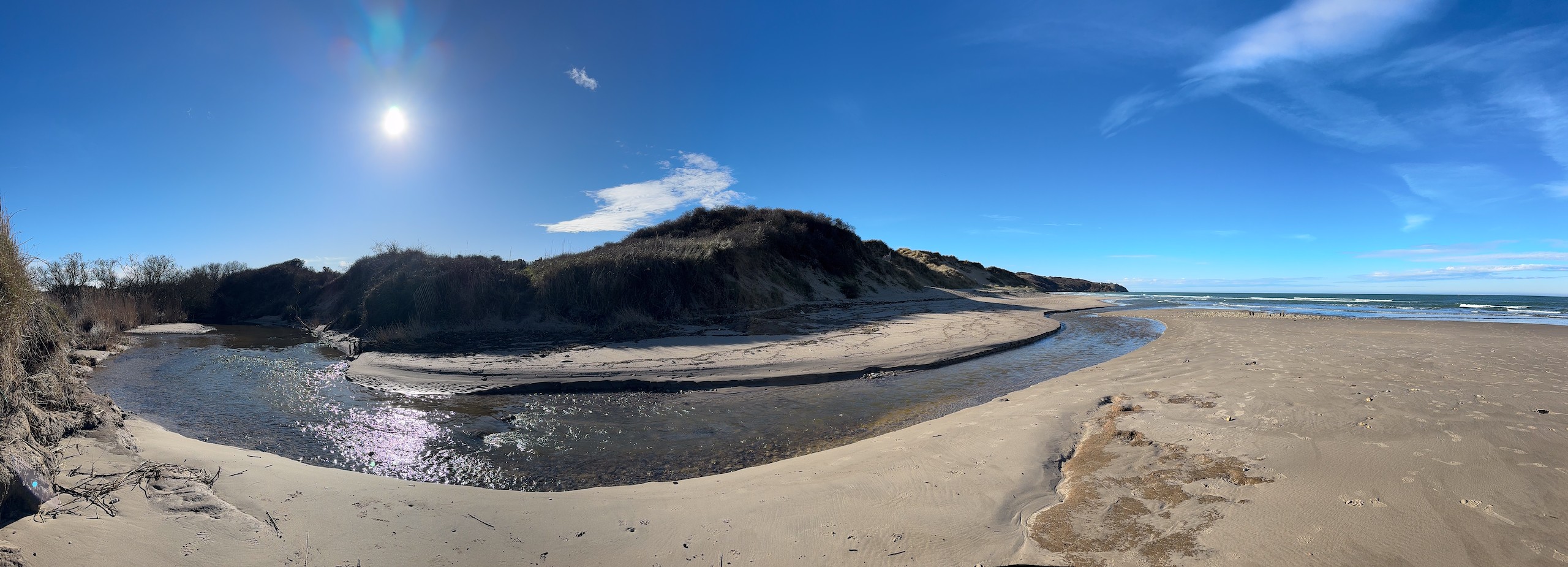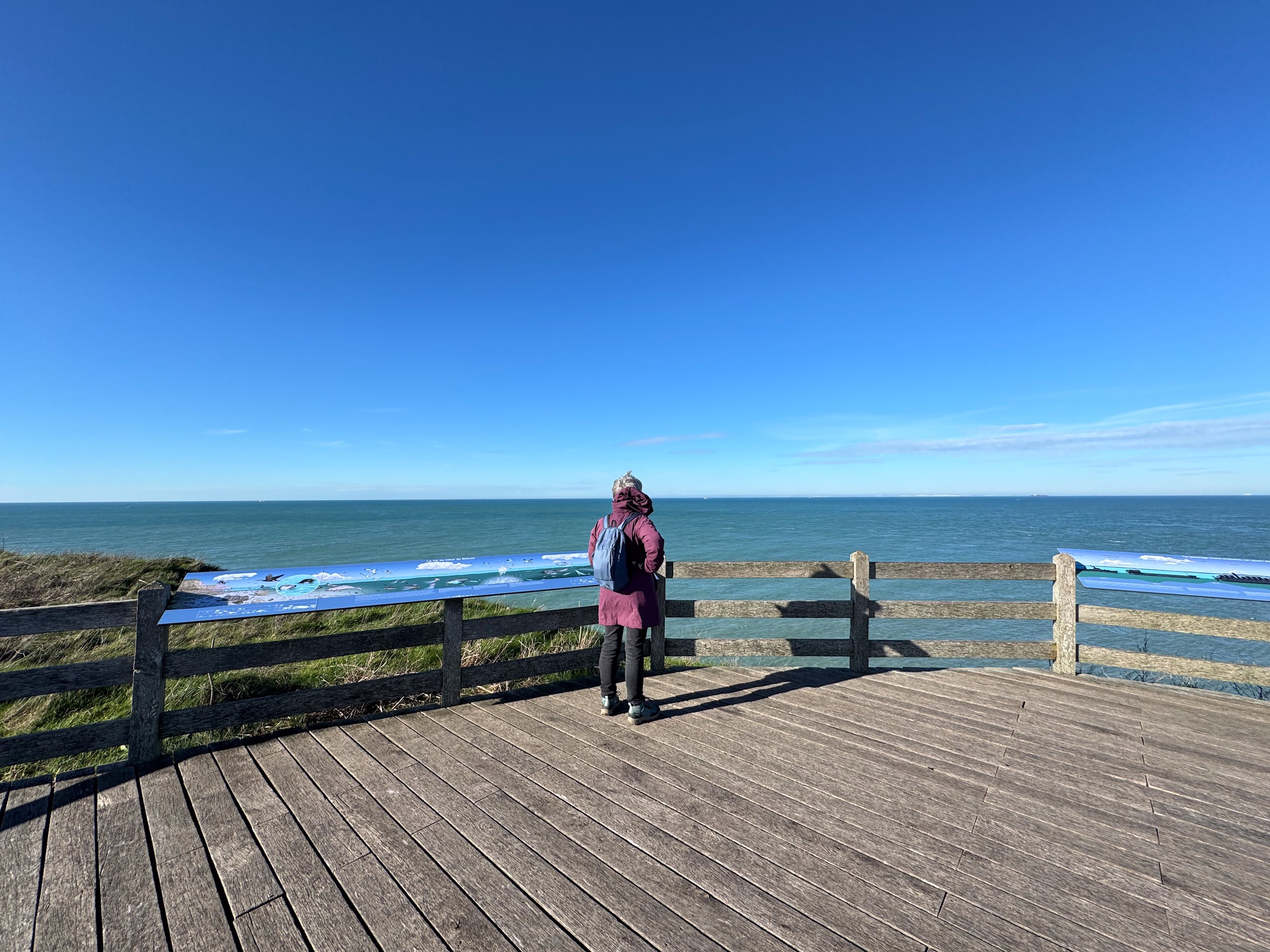 Wir müssen dann aber den Strand verlassen, da es einen Bach gibt, der ins Meer läuft und den wir nicht überqueren können. So geht es in den Dünen weiter, immer entlang des GR 120. Der führt uns bis ans Cap Gris Nes, wo wir die Aussicht wieder bis zur englischen Küste genießen und uns ordentlich den Wind um die Nase wehen lassen. Nach einem kleinen Snack, den wir mitgebracht haben, gehen wir auf dem selben Weg zurück.