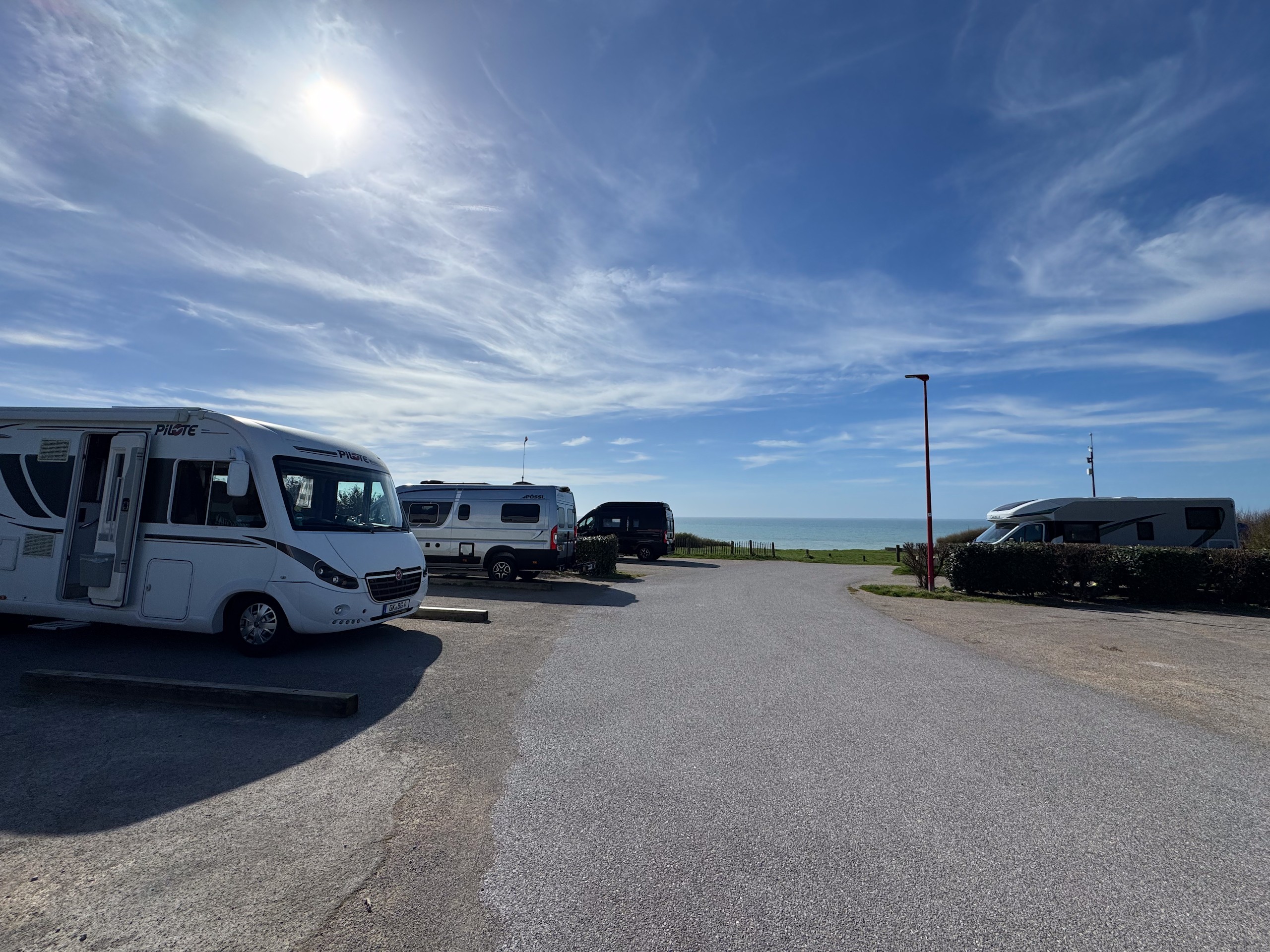 Bevor wir den Stellplatz von Équihen Plage in der Rue du Beurre Fondu ansteuern, wollen wir noch in einem Lidl einkaufen. Leider ist der Parkplatz mit einer Höhenbegrenzung von 2,40 m versehen und wir müssen uns einen anderen Supermarkt suchen. Gott sei Dank ist nicht weit entfernt ein E. Leclerc, der auch sehr gut sortiert ist. Nach dem Einkauf geht es zügig zum Stellplatz, dummerweise über eine eigentlich für über 3,5 t gesperrte Straße. Machen wir normalerweise nicht, aber jetzt sind nur noch 2 km zu fahren, also riskieren wir es. Aber es war alles kein Problem und jetzt stehen wir mit Blick auf die Küste. Die schönsten Plätze sind zwar schon belegt, aber egal.