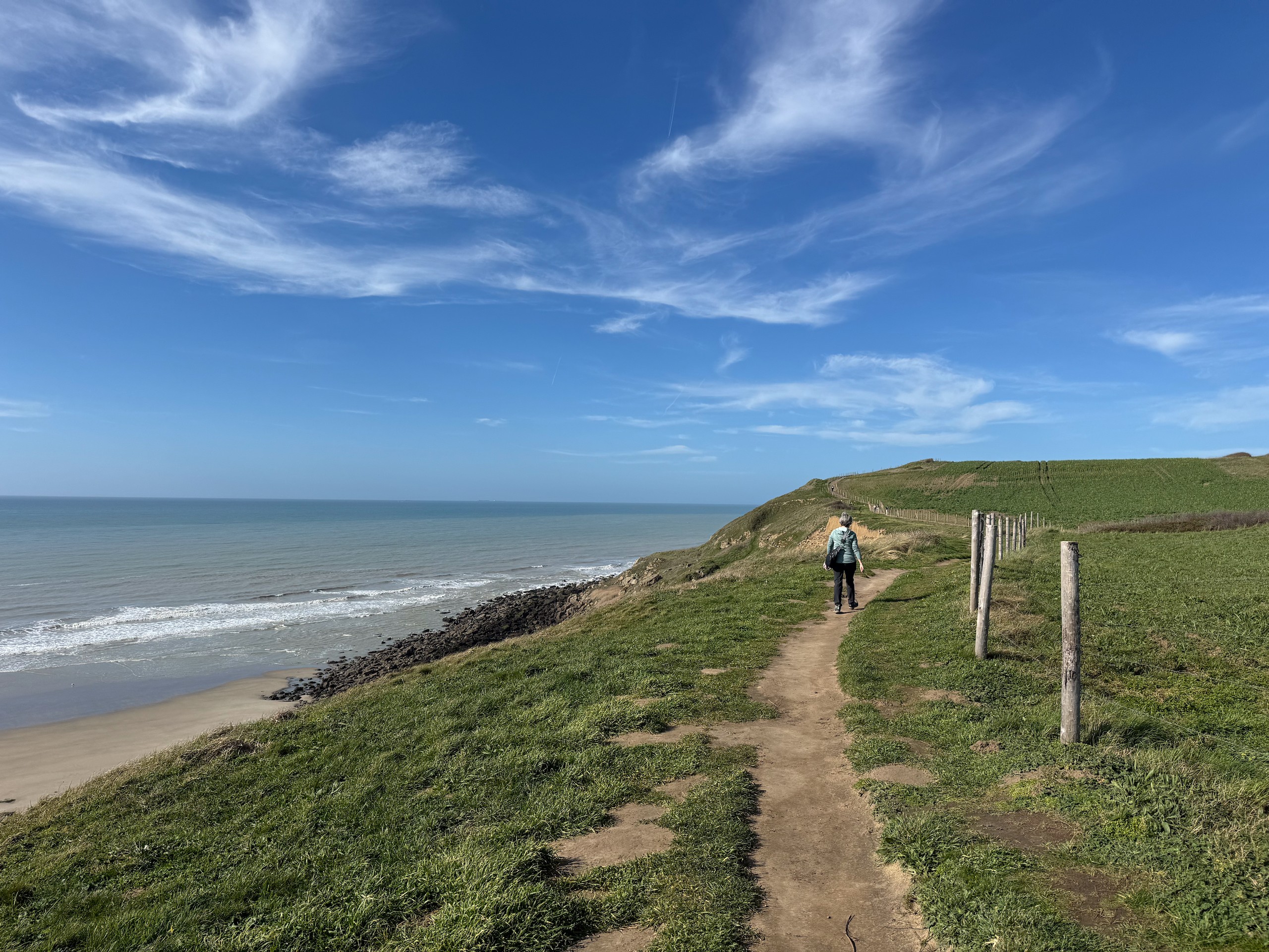 Als wir heute morgen wach werden, ist der Himmel tatsächlich blau und man sieht die Sonne. Man glaubt es kaum. Wir wollen den Tag nutzen und fahren kurz nach zehn in das knapp 17 km entfernte Wissant. Hier waren wir bereits vor ein paar Jahren. Mittlerweile ist der Platz in der Rte de Calais nicht mehr kostenlos, sondern man zahlt ohne alles 11 Euro. Aber wir wollen von hier aus eine Wanderung zum Cap Gris Nez machen, die im Ganzen wieder an die 18 km lang werden soll.