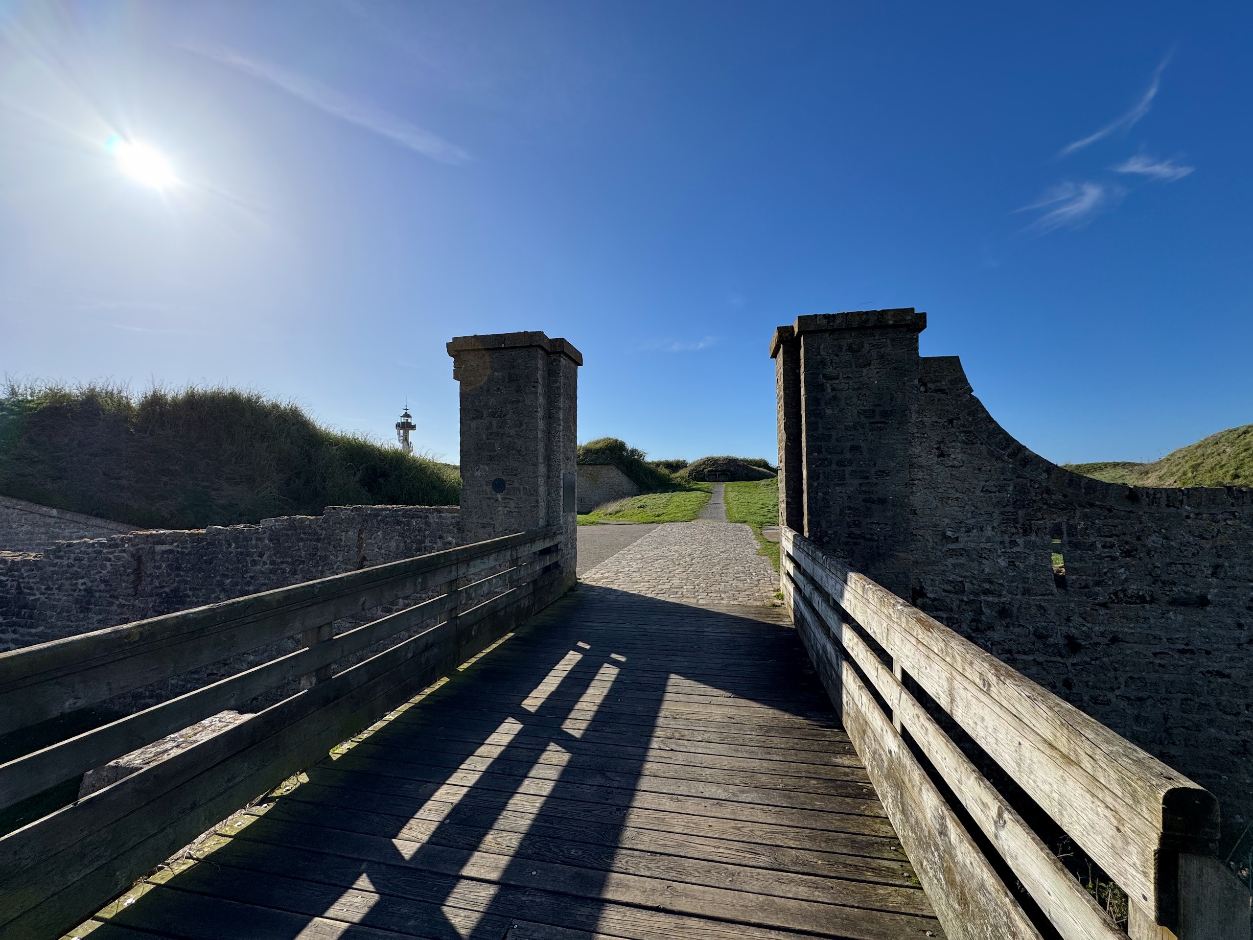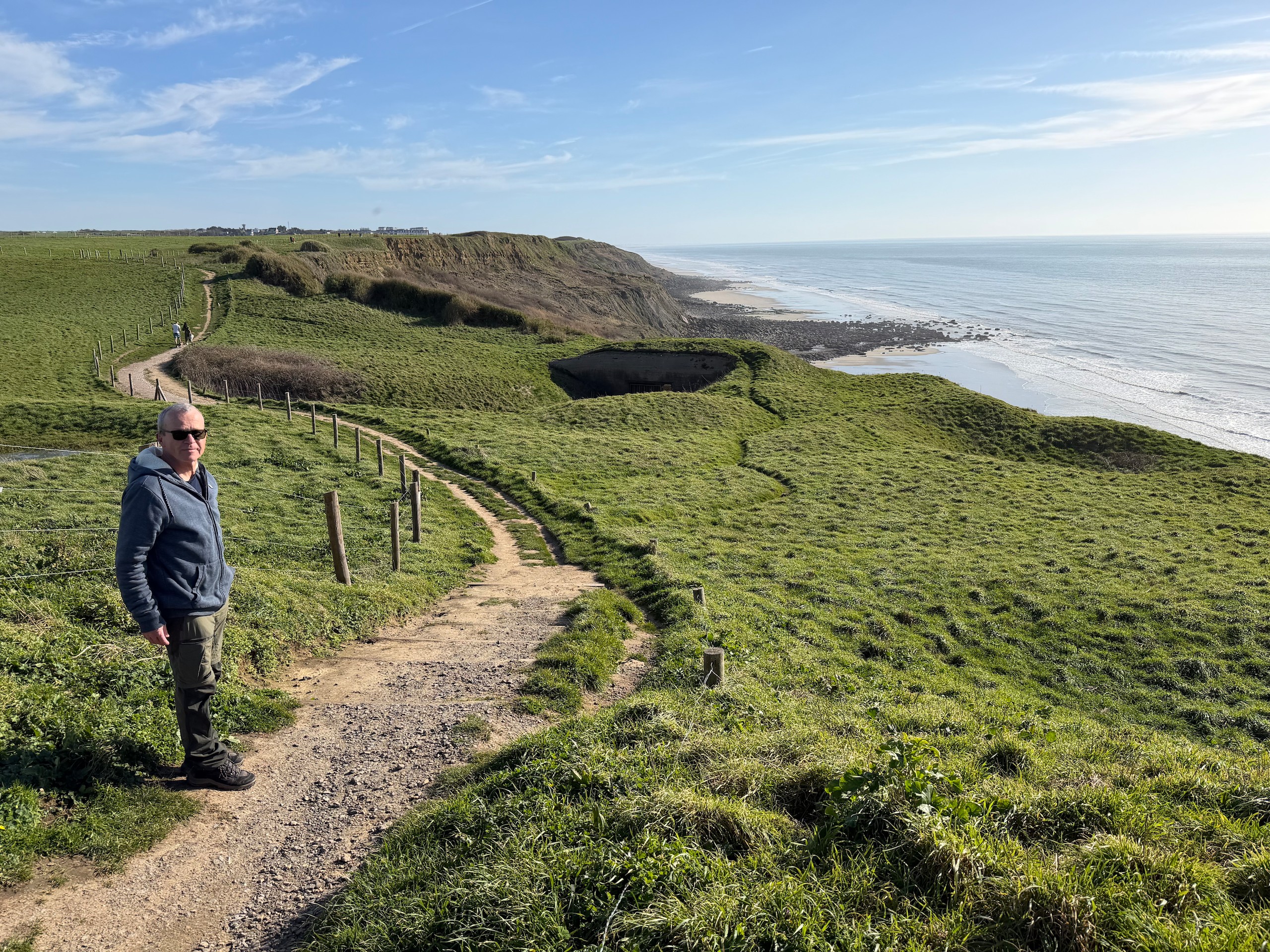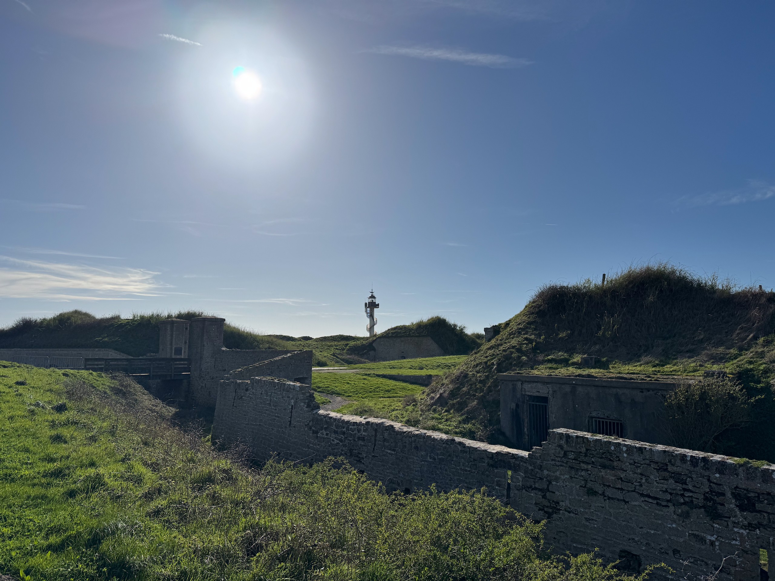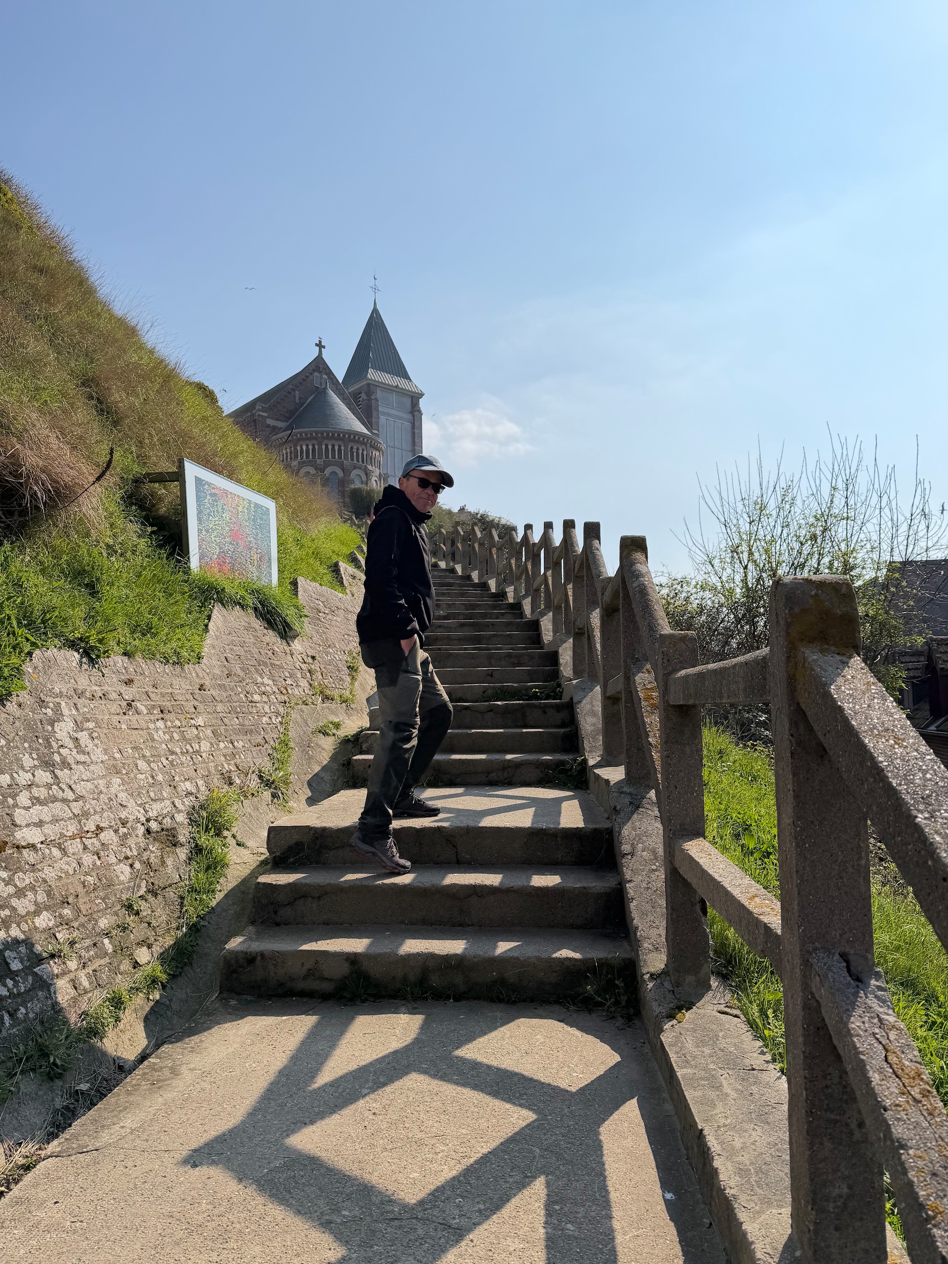 Nach einer kurzen Mittagspause machen wir uns bei schönstem Wetter auf den Weg oberhalb der Küste bis zum Phare d'Alprech - Le Portel und zum Fort du Cap d'Alprech und den recht hügeligen Weg wieder zurück. Mittlerweile ist auch das Meer so weit zurück, dass man auch am Strand weiterlaufen kann. Die Gezeiten sollte man hier immer im Auge haben, denn bei Flut ist ein Strandspaziergang mehr nicht möglich. Nach etwas mehr als 8 km mit immerhin 300 Höhenmetern kommen wir am späten Nachmittag wieder zum Wohnmobil. Jetzt lassen wir den Abend wieder gemütlich ausklingen. Die Wanderung bis zum Fort du Cap d'Alprech ist wie immer auf Komoot zu finden (Account erforderlich) oder auch komplett ohne Account über GoogleMaps aufzurufen.