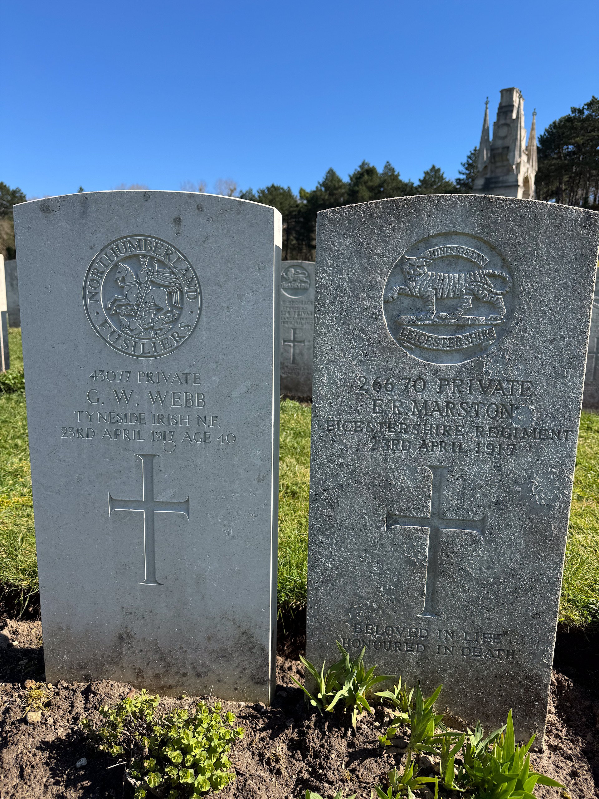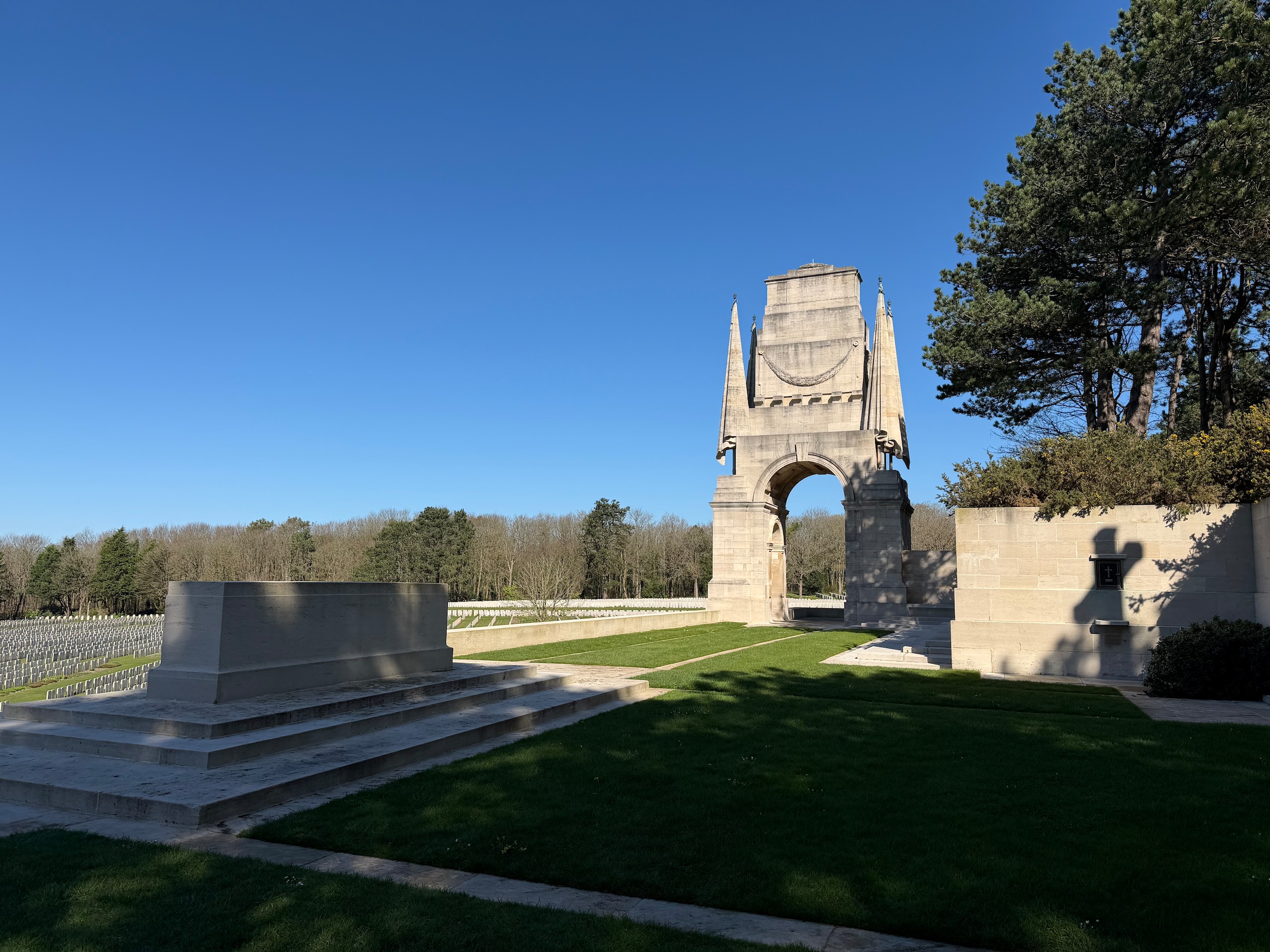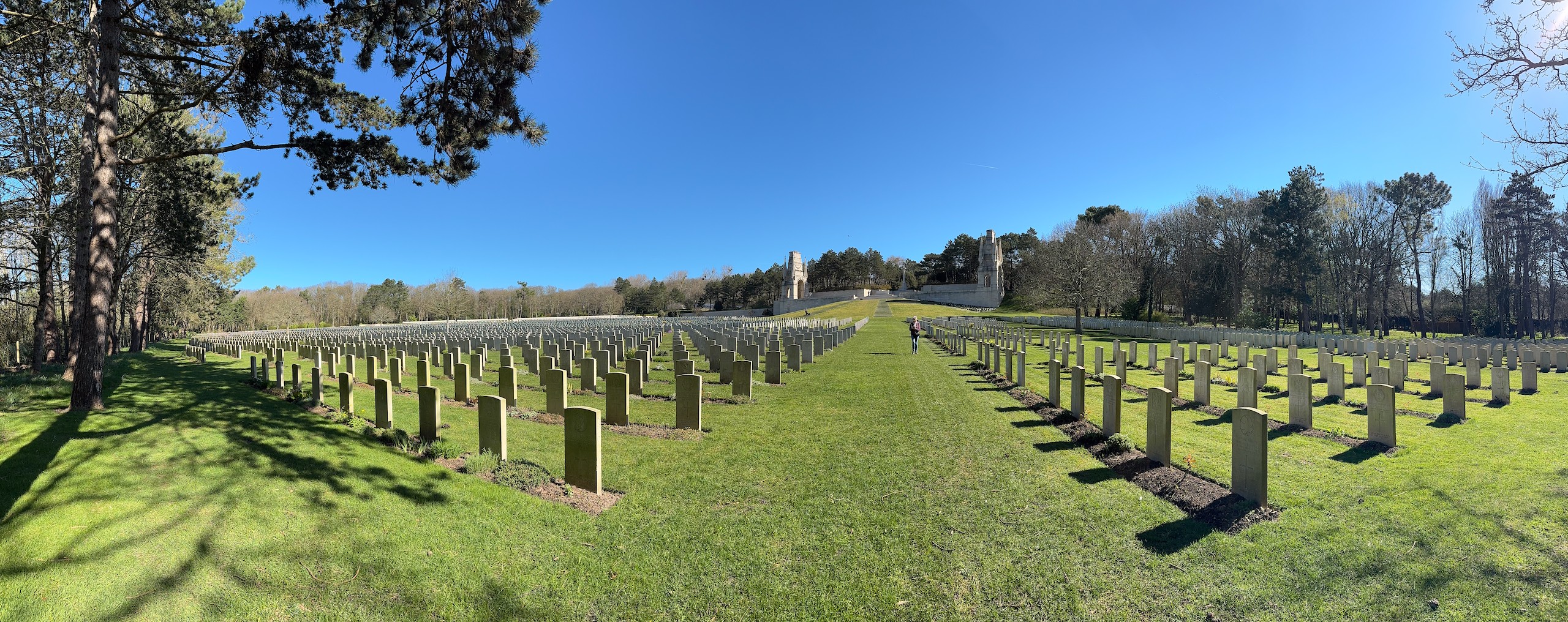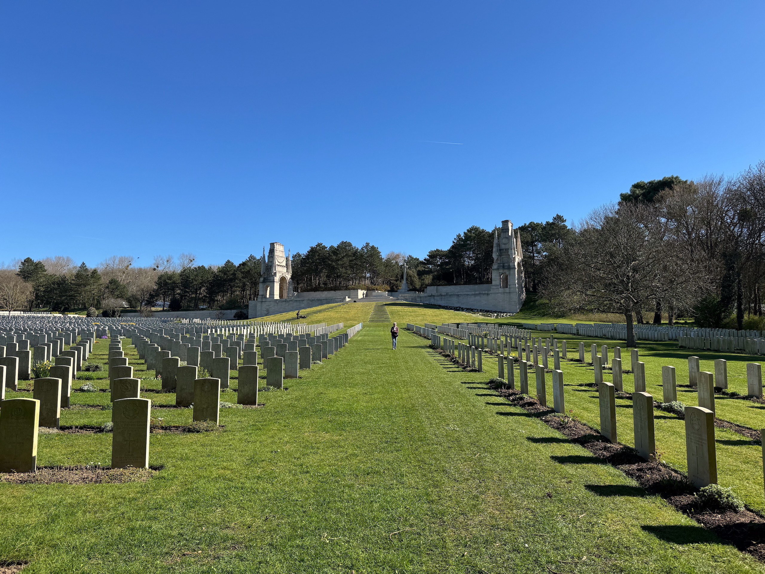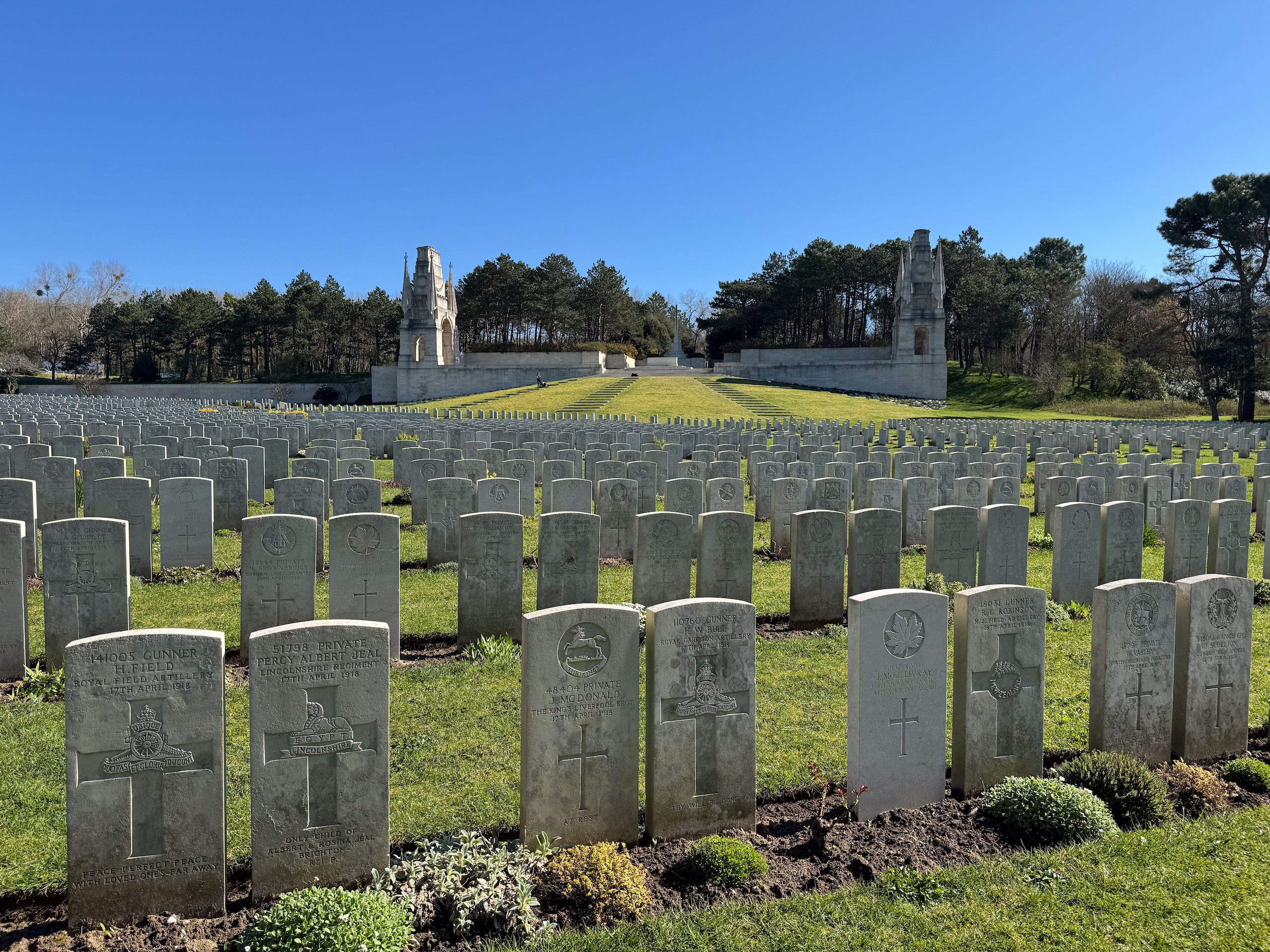 Wir parken auf dem dafür vorgesehenen Parkstreifen und sehen uns den Friedhof an. 11517 Gräber gibt es hier, größtenteils von gefallenen Soldaten aus dem 1. , aber auch 2. Weltkrieg. Die Soldaten kommen nicht nur aus England, auch Kanadier, Australier, Inder und andere Nationalitäten liegen hier. Die Grabsteine sind alle individuell beschriftet und alles ist sehr gepflegt. Wikipedia sagt, dass hier 6 Gärtner ganzjährig beschäftigt sind. Die große Anzahl Grabsteine lässt einen schon sehr traurig werden und macht wieder einmal die Sinnlosigkeit eines Krieges bewusst.