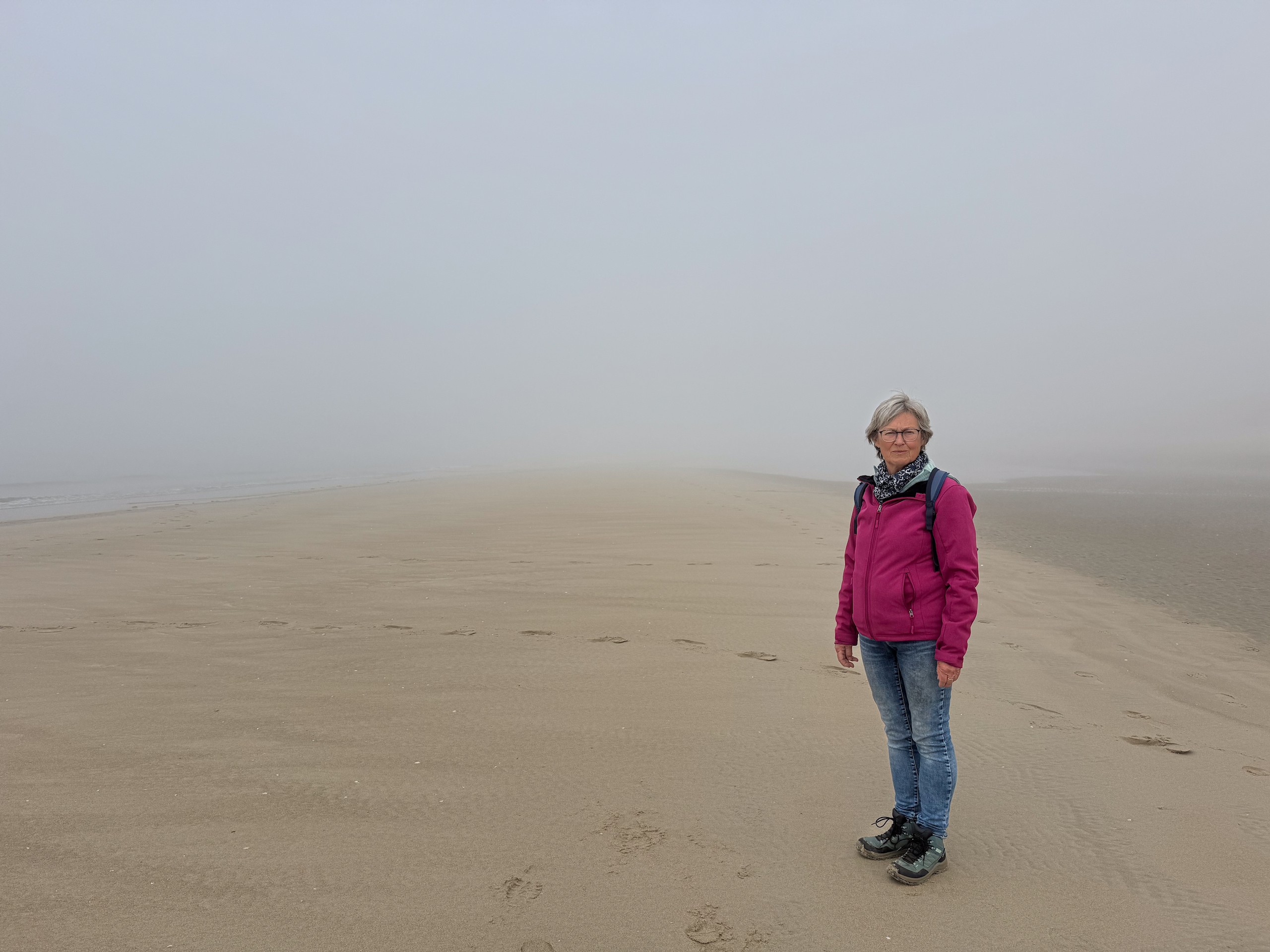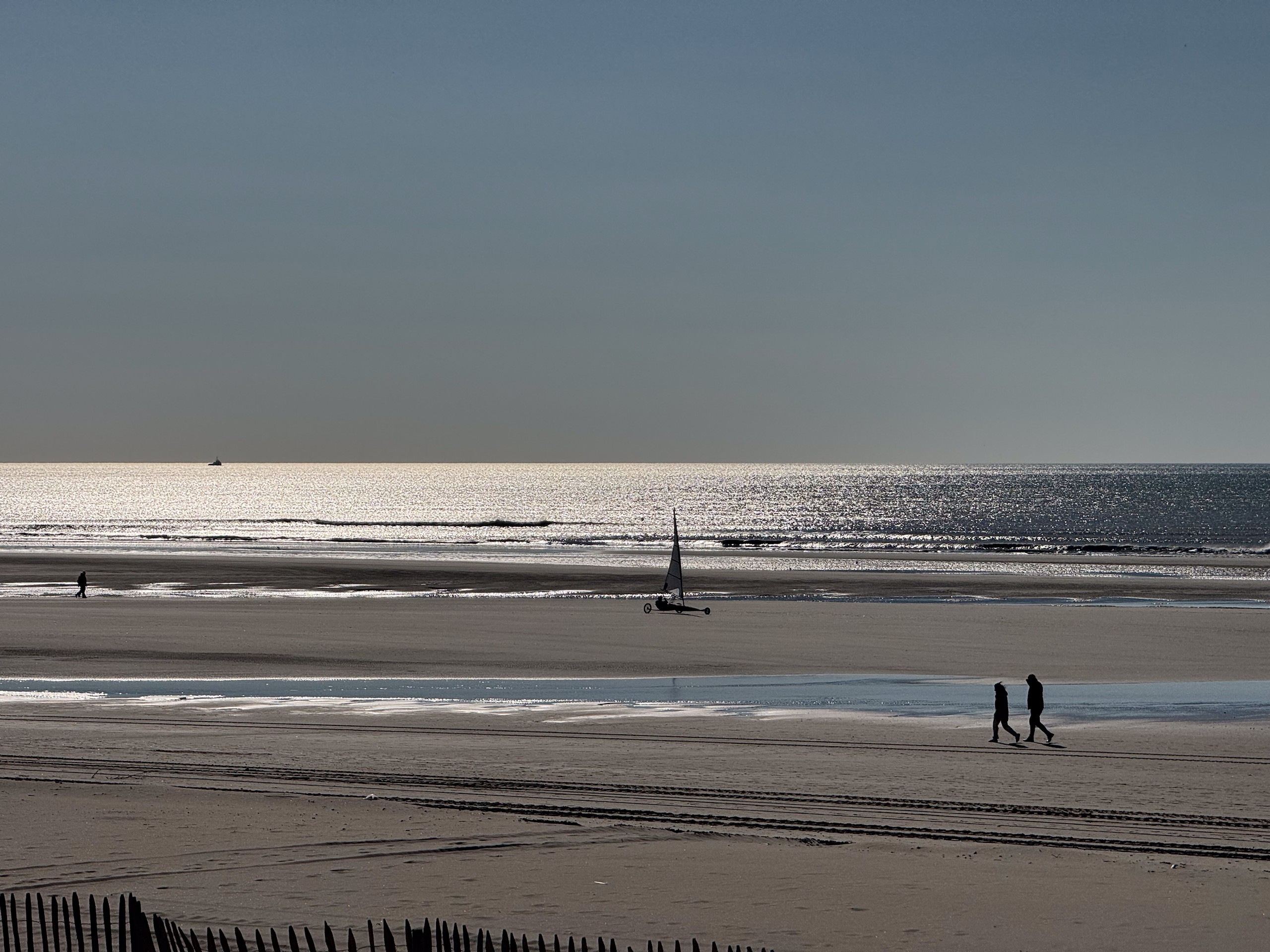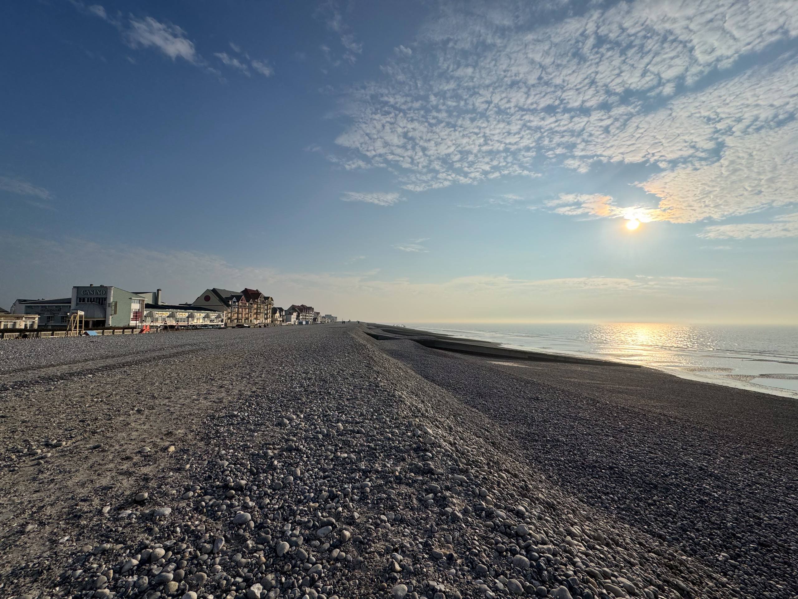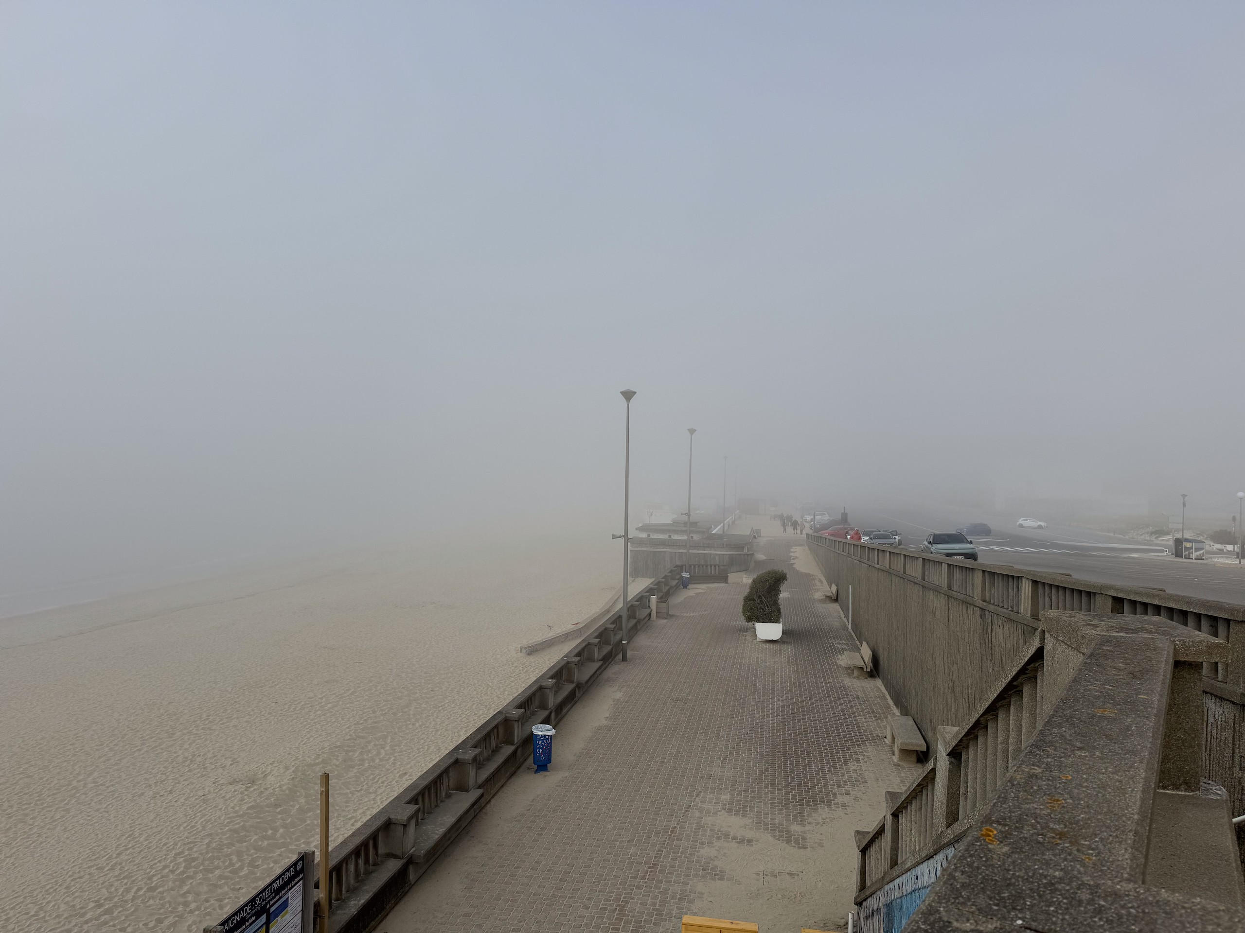 Das wird sicher ein unangenehmes Erwachen morgen früh. Jetzt um 17.00 Uhr scheint wohl immer noch niemand Feierabend machen zu wollen. Wir haben uns vorhin auf den Weg zum Strand gemacht, sind trotz des Nebels insgesamt 10 km den Strand rauf- und wieder runter gelaufen. Man konnte von weitem sogar schon die ersten Häuser von Le Touquet-Paris-Plage erkennen. Aber bis dahin ist es uns dann doch zu weit.