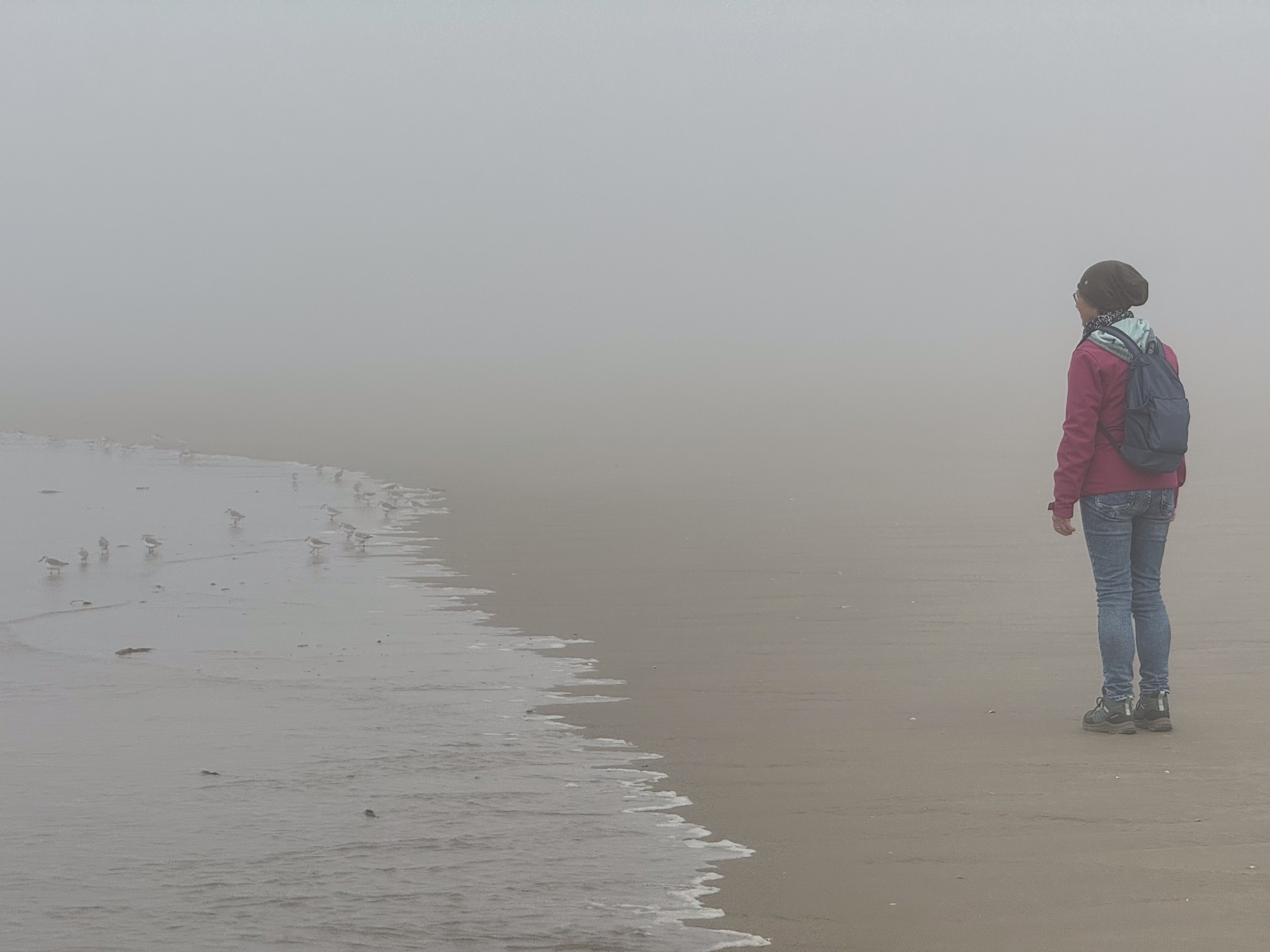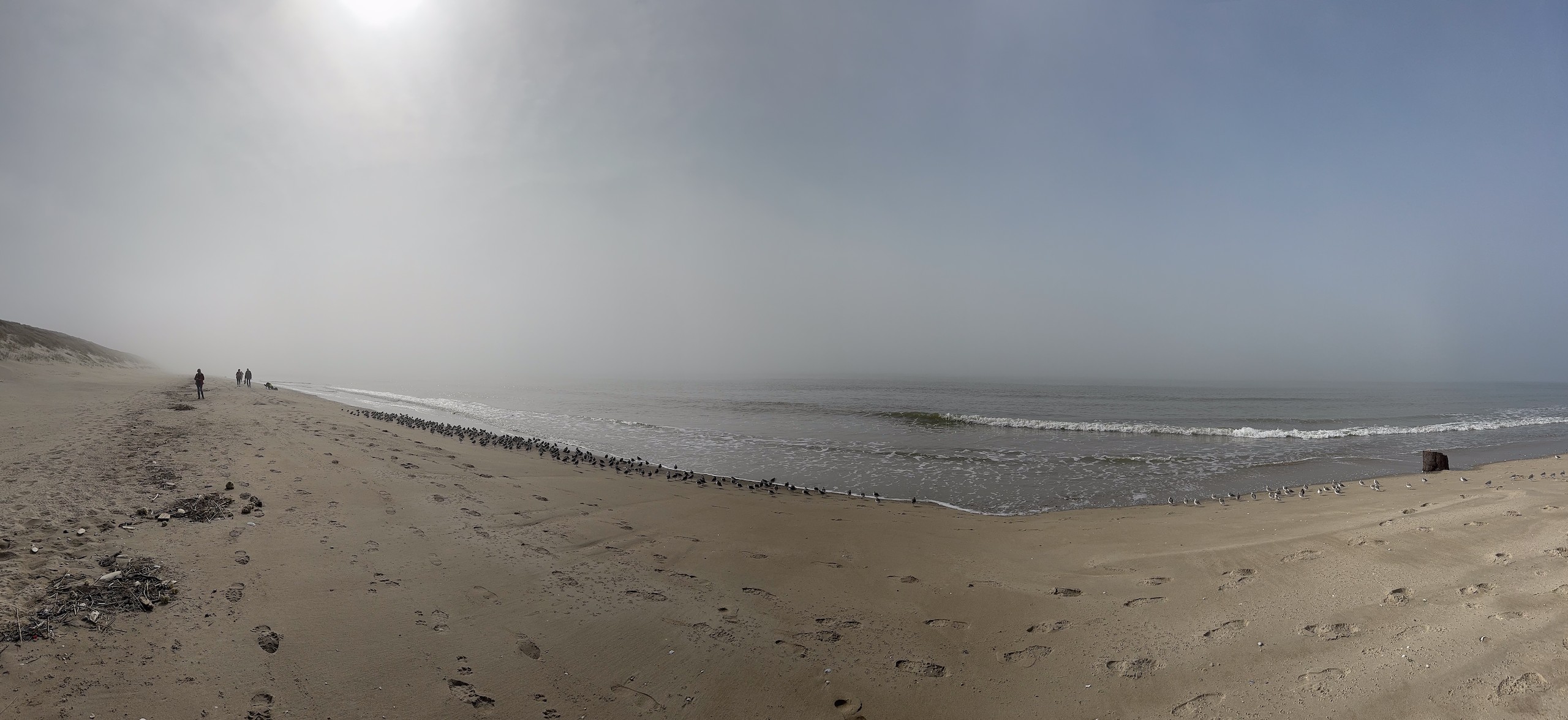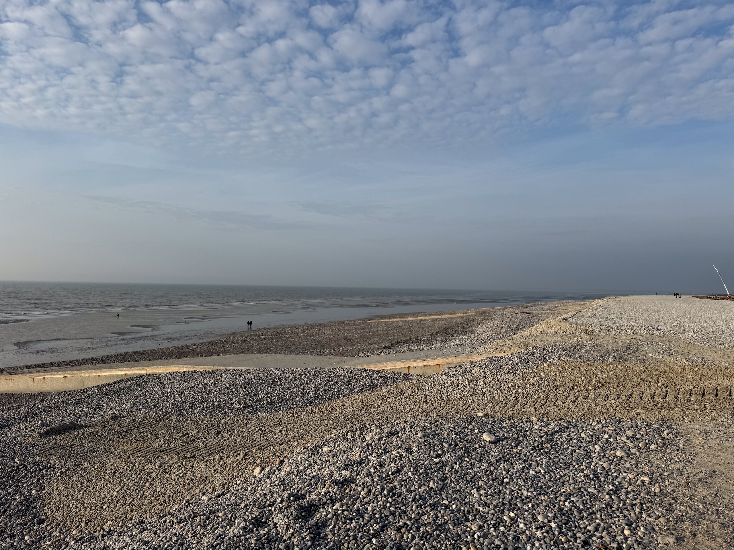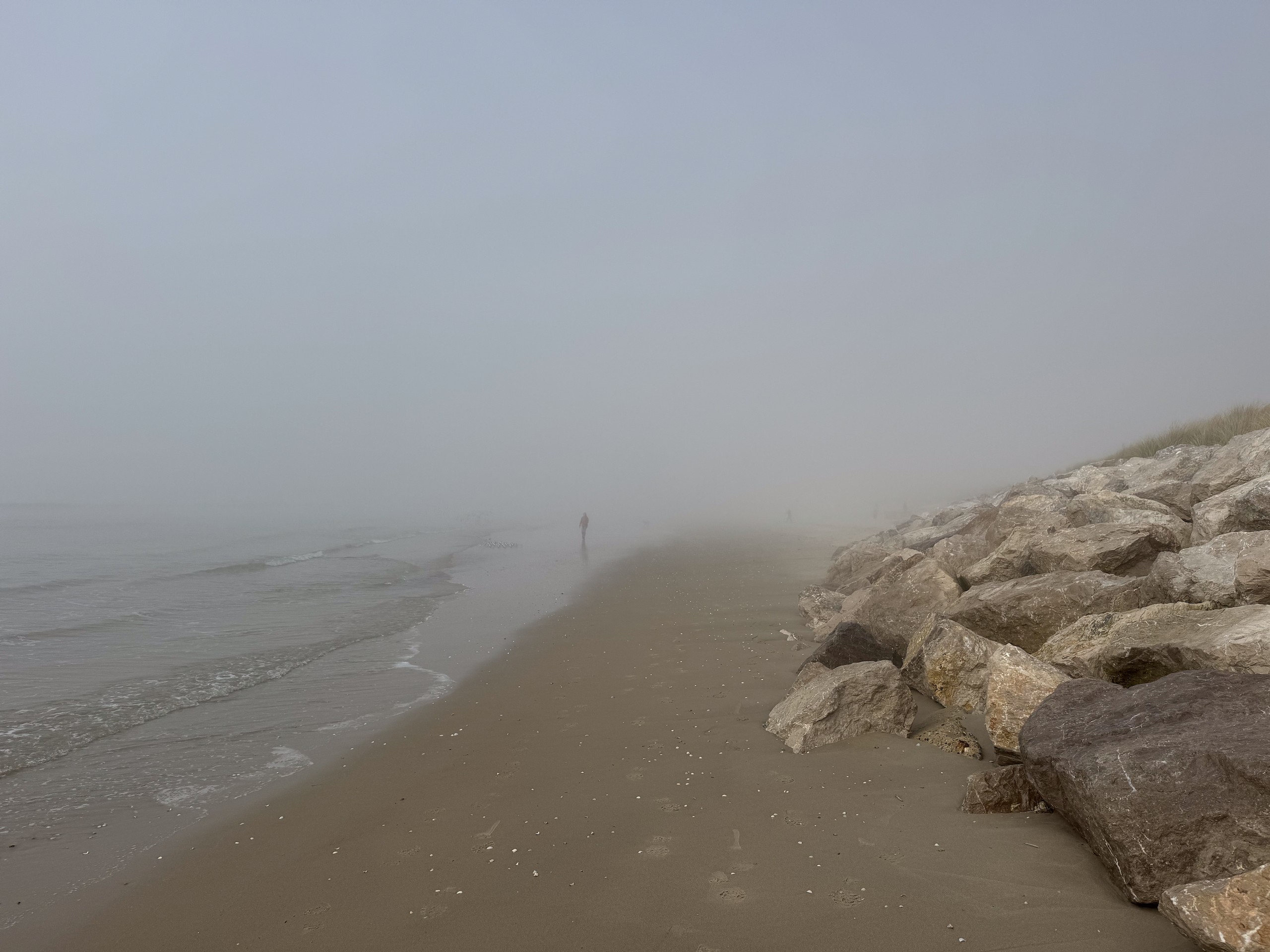 Das wird sicher ein unangenehmes Erwachen morgen früh. Jetzt um 17.00 Uhr scheint wohl immer noch niemand Feierabend machen zu wollen. Wir haben uns vorhin auf den Weg zum Strand gemacht, sind trotz des Nebels insgesamt 10 km den Strand rauf- und wieder runter gelaufen. Man konnte von weitem sogar schon die ersten Häuser von Le Touquet-Paris-Plage erkennen. Aber bis dahin ist es uns dann doch zu weit.
