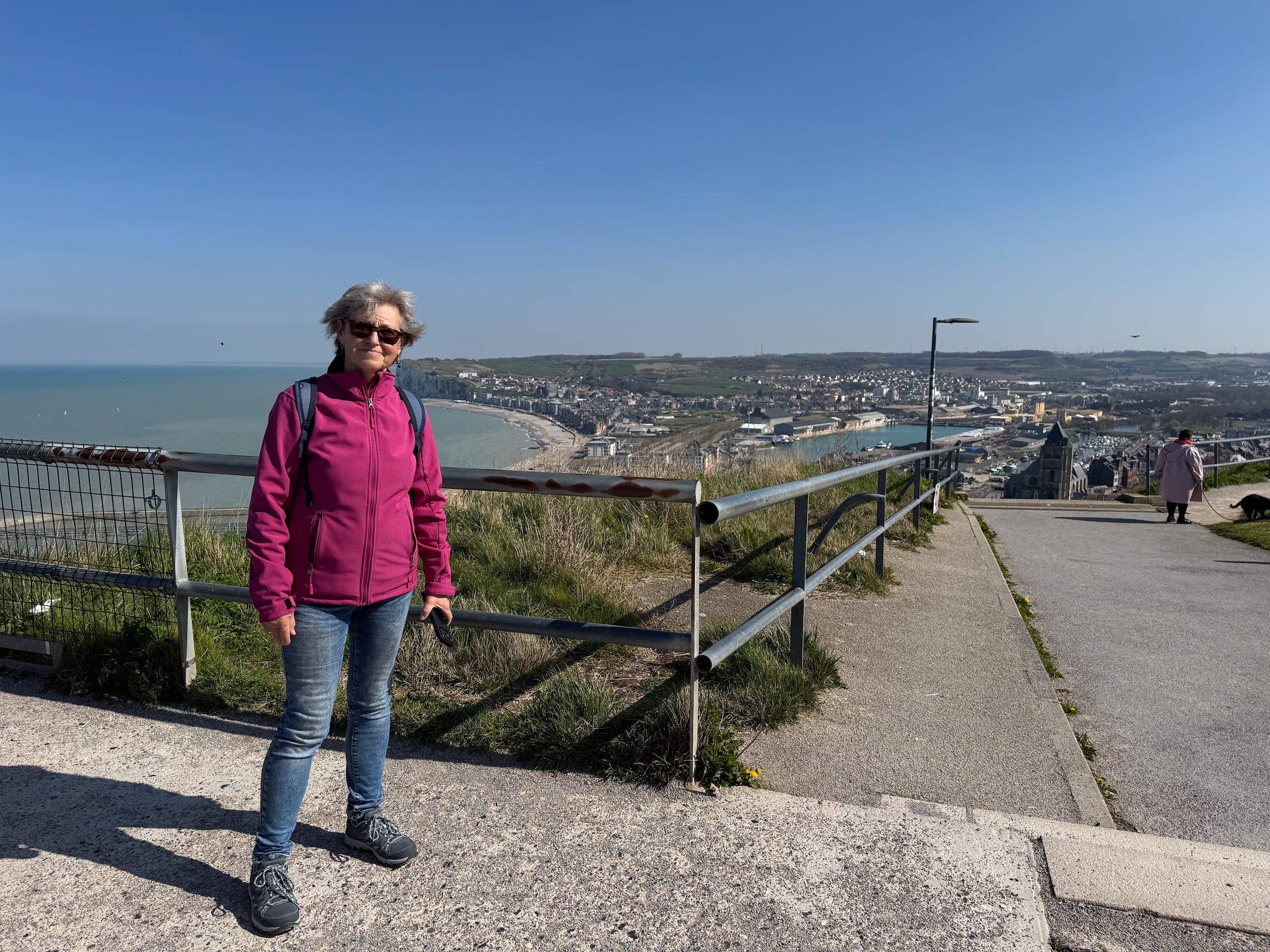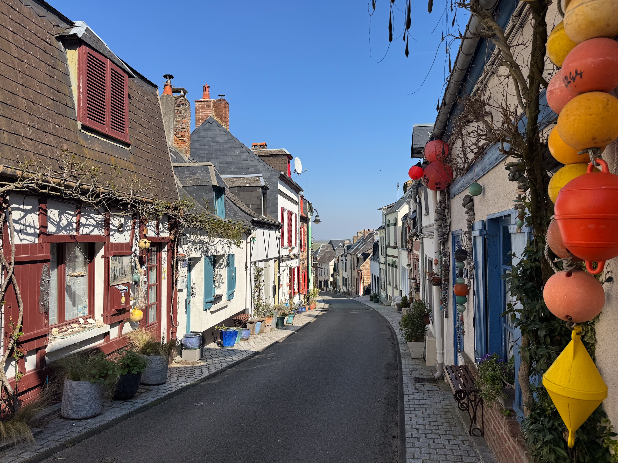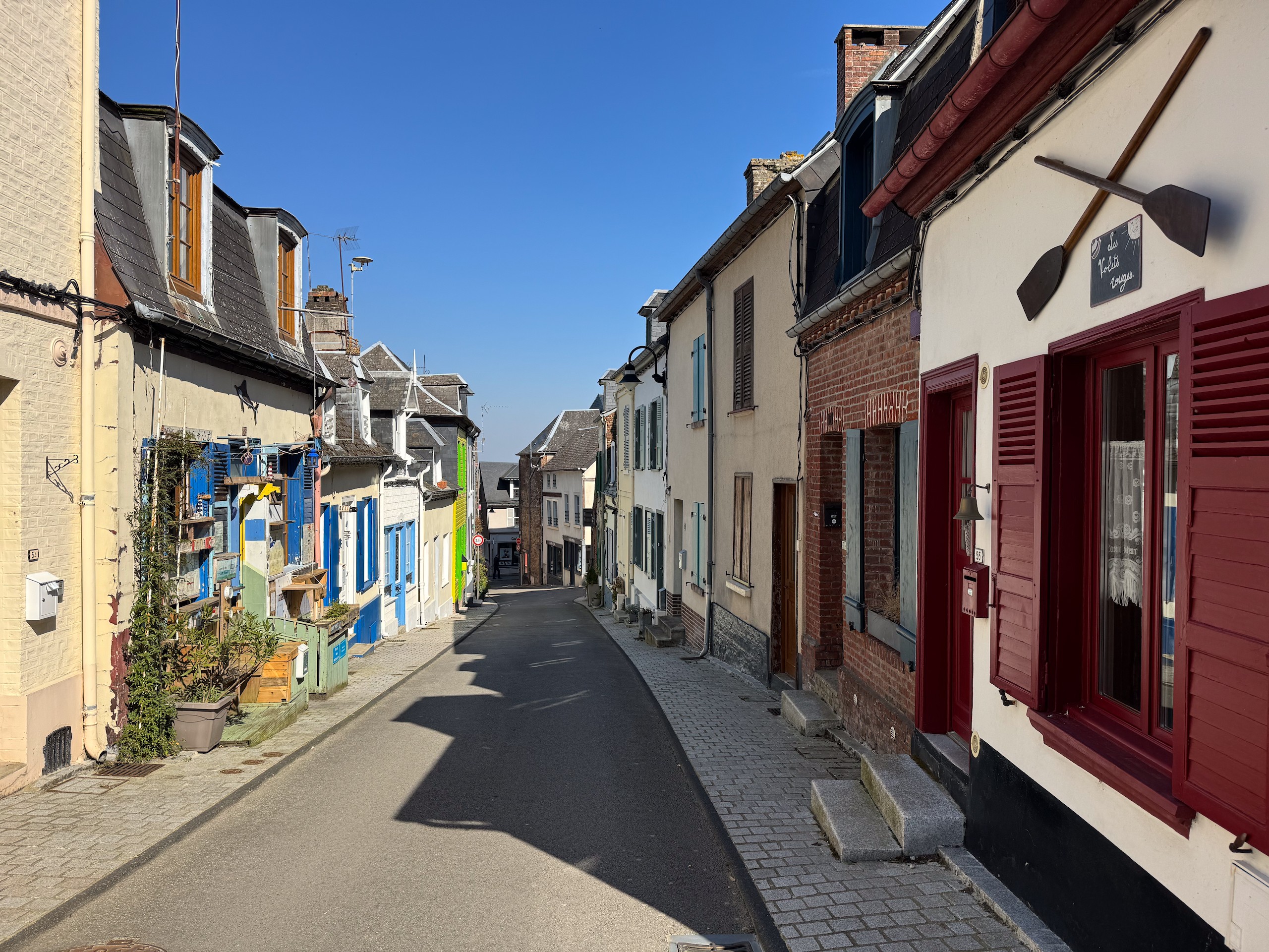 Nach einer unruhigen Nacht hat Gerd heute morgen sein Glück erneut mit der vorgeschlagenen Lösung probiert und war erfolgreich. Wir hoffen, dass der Kühlschrank sich jetzt erst mal damit zufrieden gibt und uns den Rest der Reise treue Dienste leistet. Es ist bereits 11.15 Uhr, als wir nach der Entsorgung Richtung Saint-Valery-sur-Somme starten. In diesem fast 60 km entfernten Ort waren wir bereits während unserer Silvestertour 2022, allerdings bei strömenden Regen. Heute lacht die Sonne vom strahlend blauen Himmel, auch wenn ein recht frischer Wind weht.