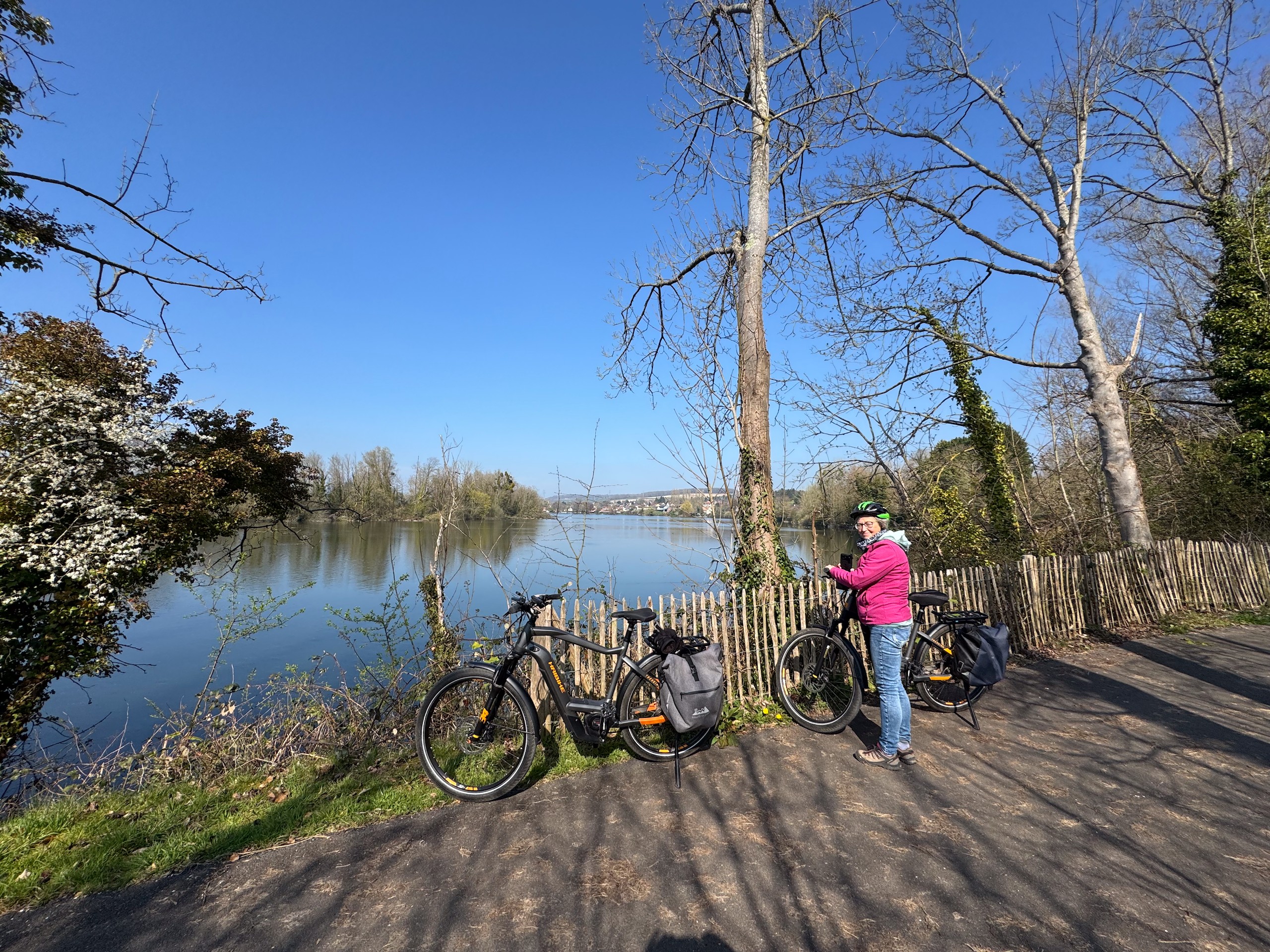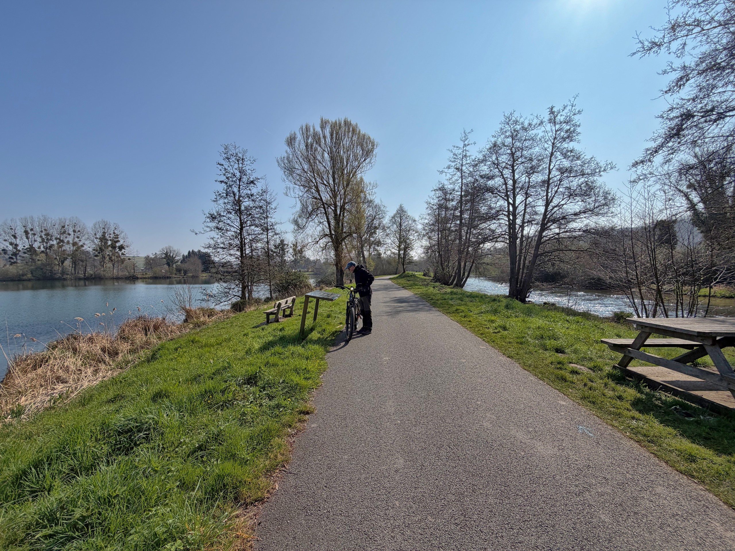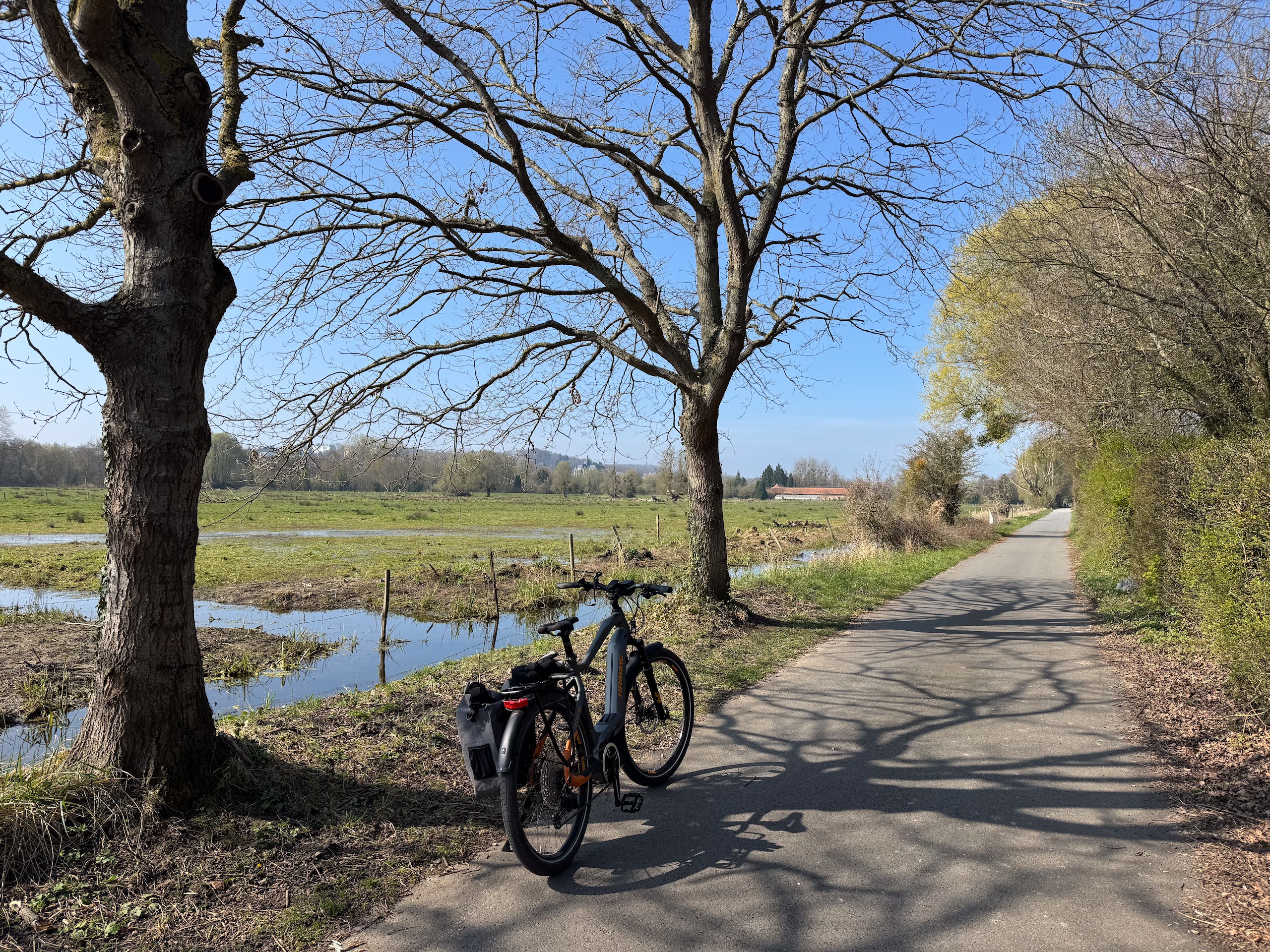 Wir radeln relativ gemütlich über kaum befahrene Straßen und Feldwege und genießen dabei die langsam erblühende Natur. Überall sprießen die Narzissen,Tulpen, Magnolienbäume und Forsythien sowie das frische Grün an den Bäumen. Die letzten Kilometer führen uns wieder über den anfangs beschriebenen Radweg durch eine tolle Flusslandschaft vorbei an der Bresle und einem großen See. Zum Schluss waren wir knapp 43 Kilometer mit dem Rad unterwegs. Es war zwar heute ziemlich frisch, so um die 10 Grad, aber die Sonne hat uns die ganze Zeit begleitet. Das hat uns beiden richtig Spaß gemacht. Die Radtour ist auch wieder auf Komoot zu finden (Account erforderlich) oder auch komplett ohne Account über GoogleMaps.